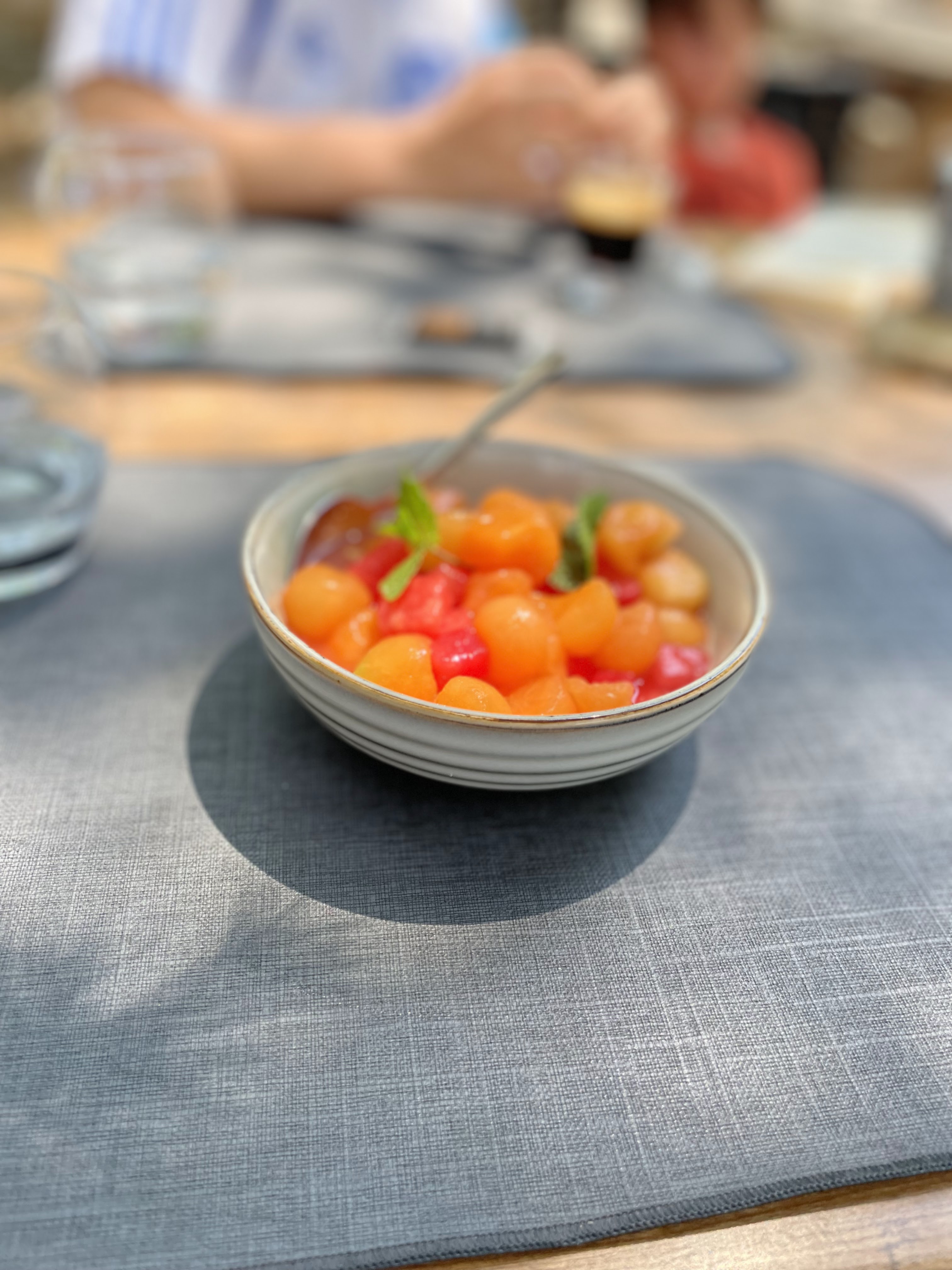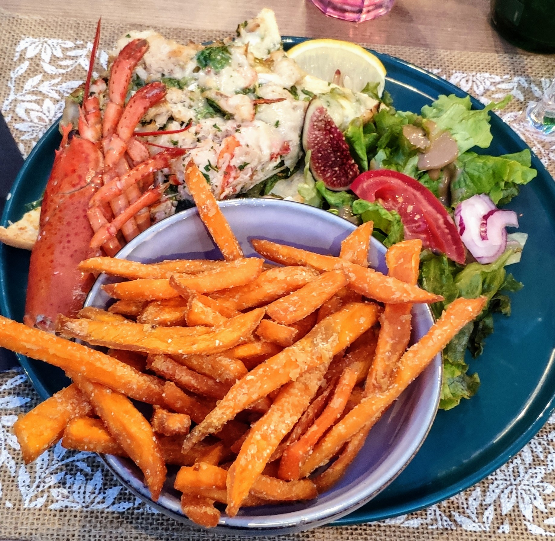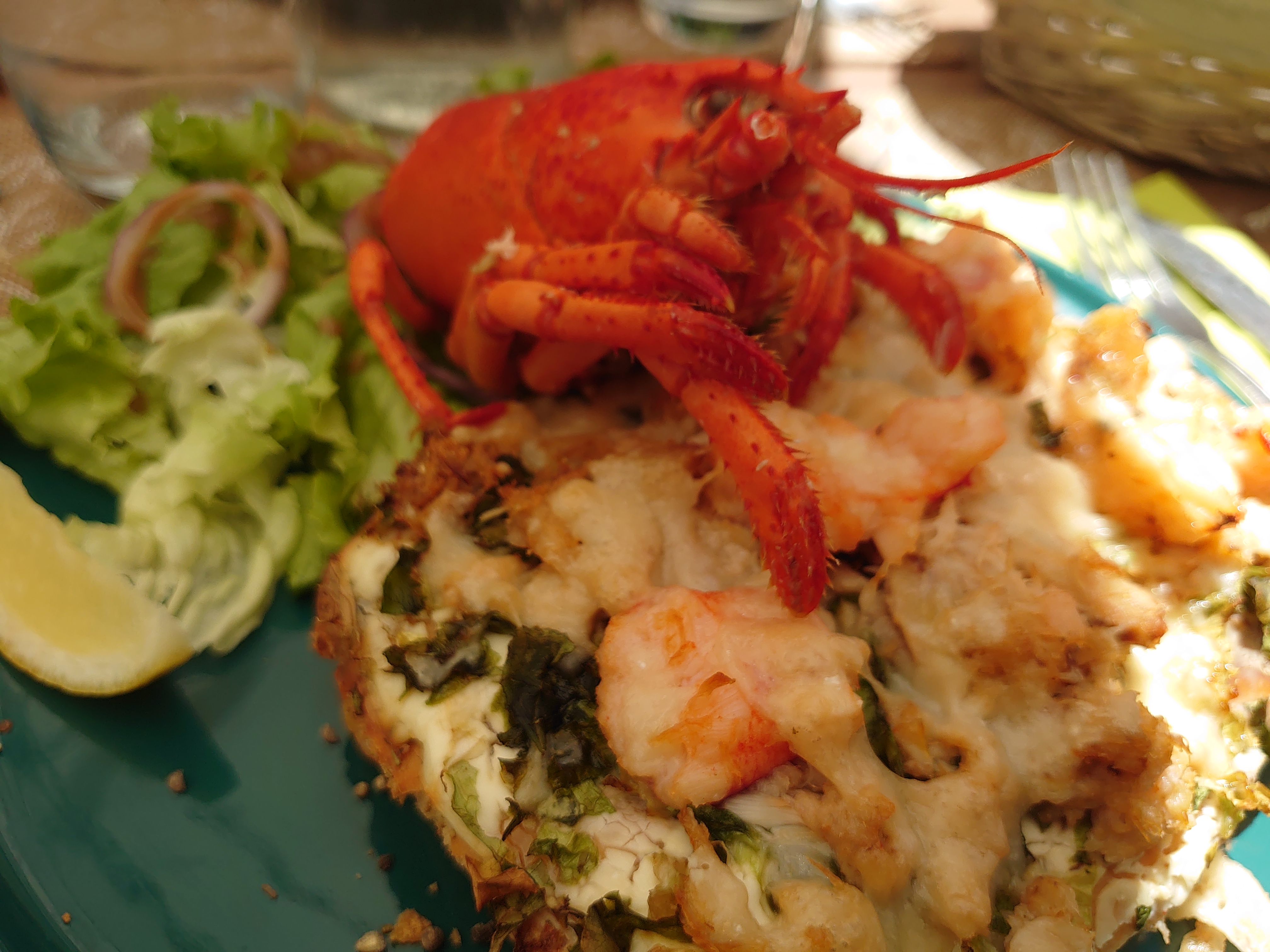 Le cadre est très joli, le service est bien, à peine long mais c'est les vacances, nous ne sommes pas pressés. Les prix sont beaucoup trop élevés par rapport à la qualité des plats, à leur présentation... Les pâtes au homard étaient très très cuites et la sauce pâteuse. Le porc avec la sauce au thym était trop cuit, très très sec. La sauce, quasi inexistante. Le melon était sec, pas juteux, sans saveur, comme s'il avait été coupé il y a des heures... Bref, nous étions 4 et tous déçus, nous n'avons même pas tenté le dessert. La facture était par contre bien juteuse !