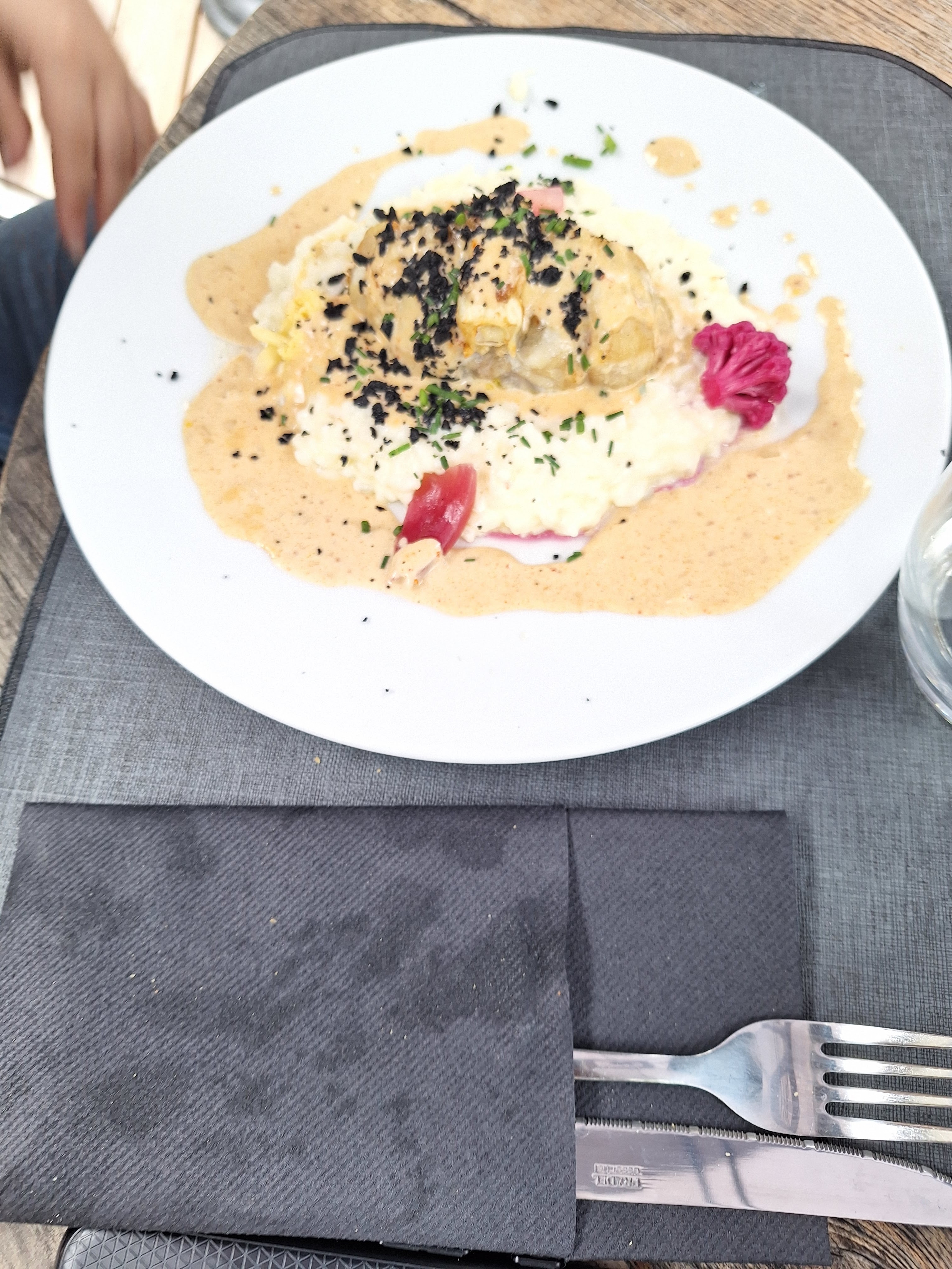 Cuisine simple, pas pu apprécier le lieu avec le vent fort et après le périple vu la route pour arriver au restaurant. Route de montagne périlleuse.