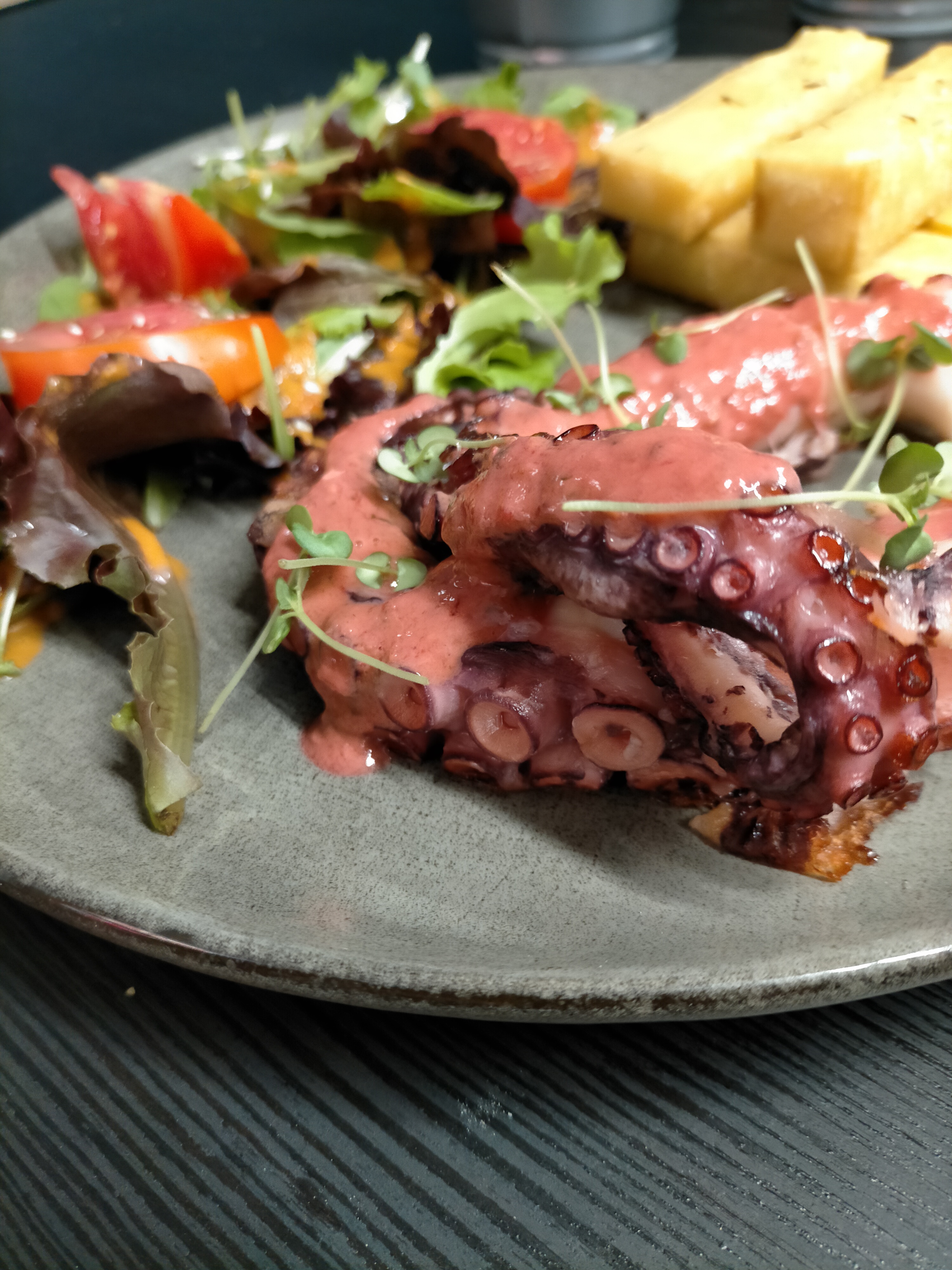 De très bons plats, malgré un poulpe très citronné. Le reste avait l’air super et de bonne qualité. Assiette bien dressée.