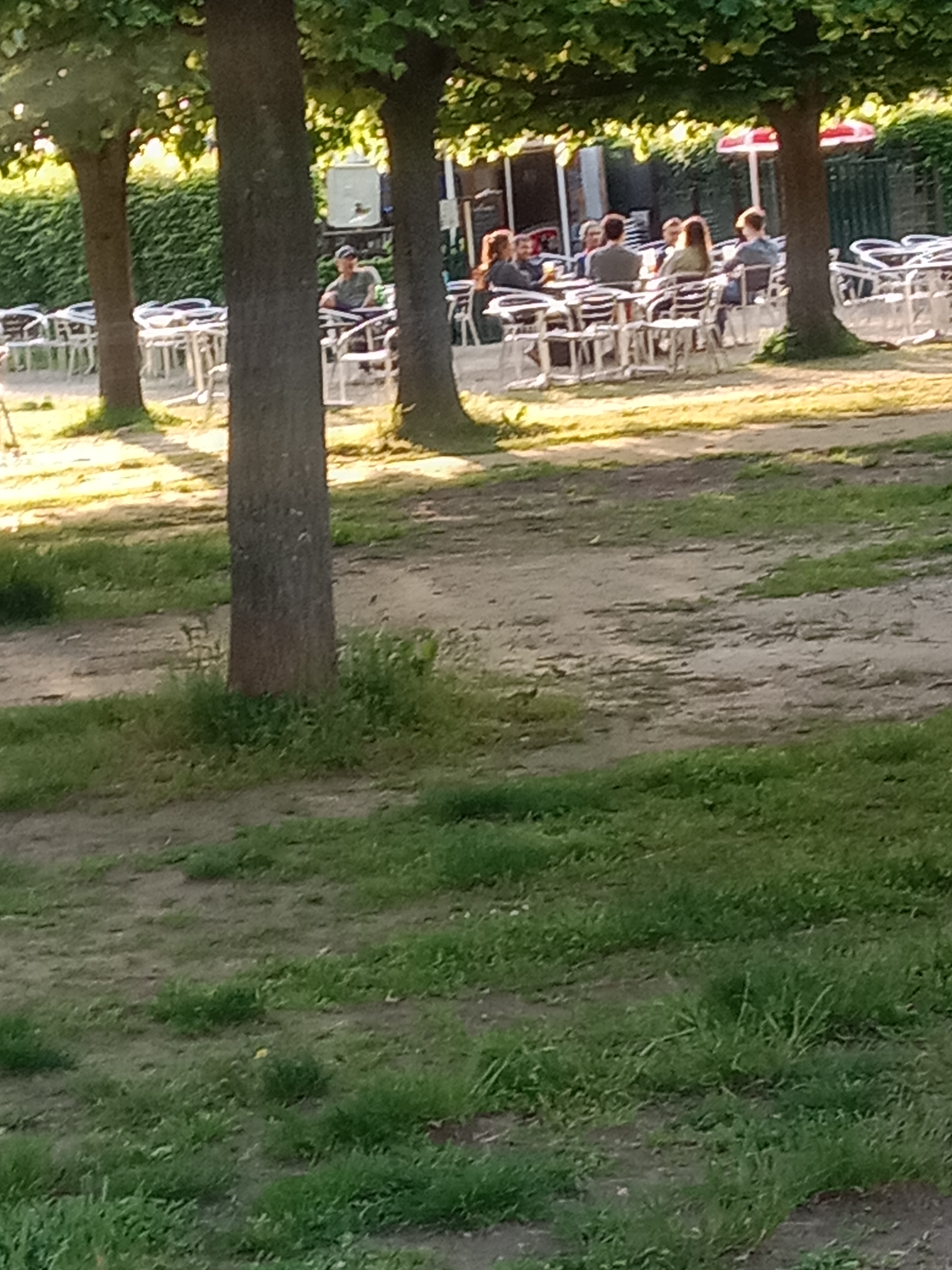 Accueil plutôt souriant malgré les avis précédents. 9€ pour 2 boissons (donc raisonnable), installés comme des pachas dans des transats sous les frondaisons des tilleuils (?)