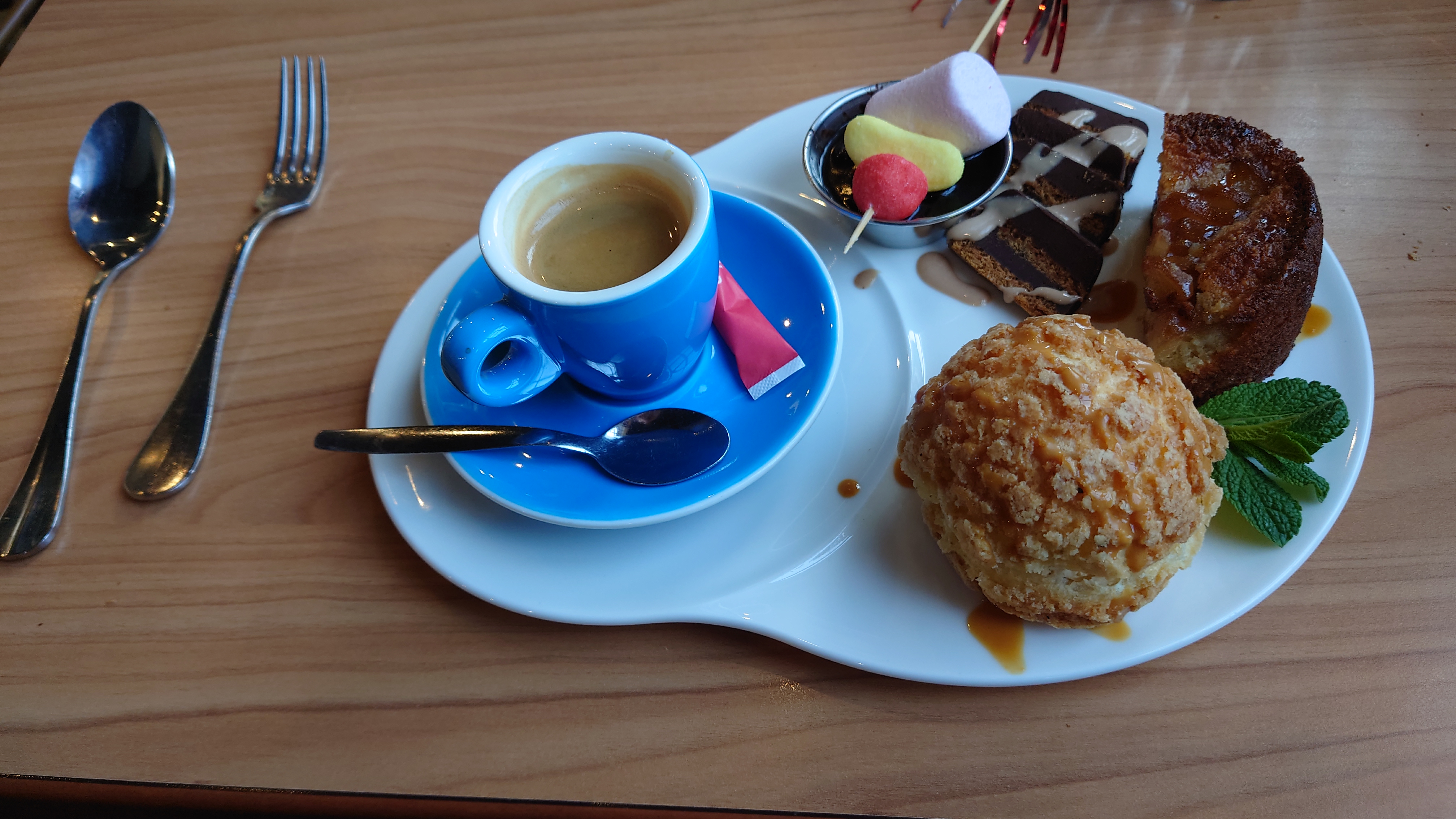 Le cadre est parfait avec vue sure le lac, climatisation et décoration agréable. La carte est variée et les plats élaborés. Il y a des formules entrée+plat plat+dessert dans les environs de 21€ Attention ! Il vaut mieux être là dès l'ouverture ou réserver en avance!! Les desserts sont tous aussi créatifs voici une photo du marbré ! Un 10/10 il était délicieux.