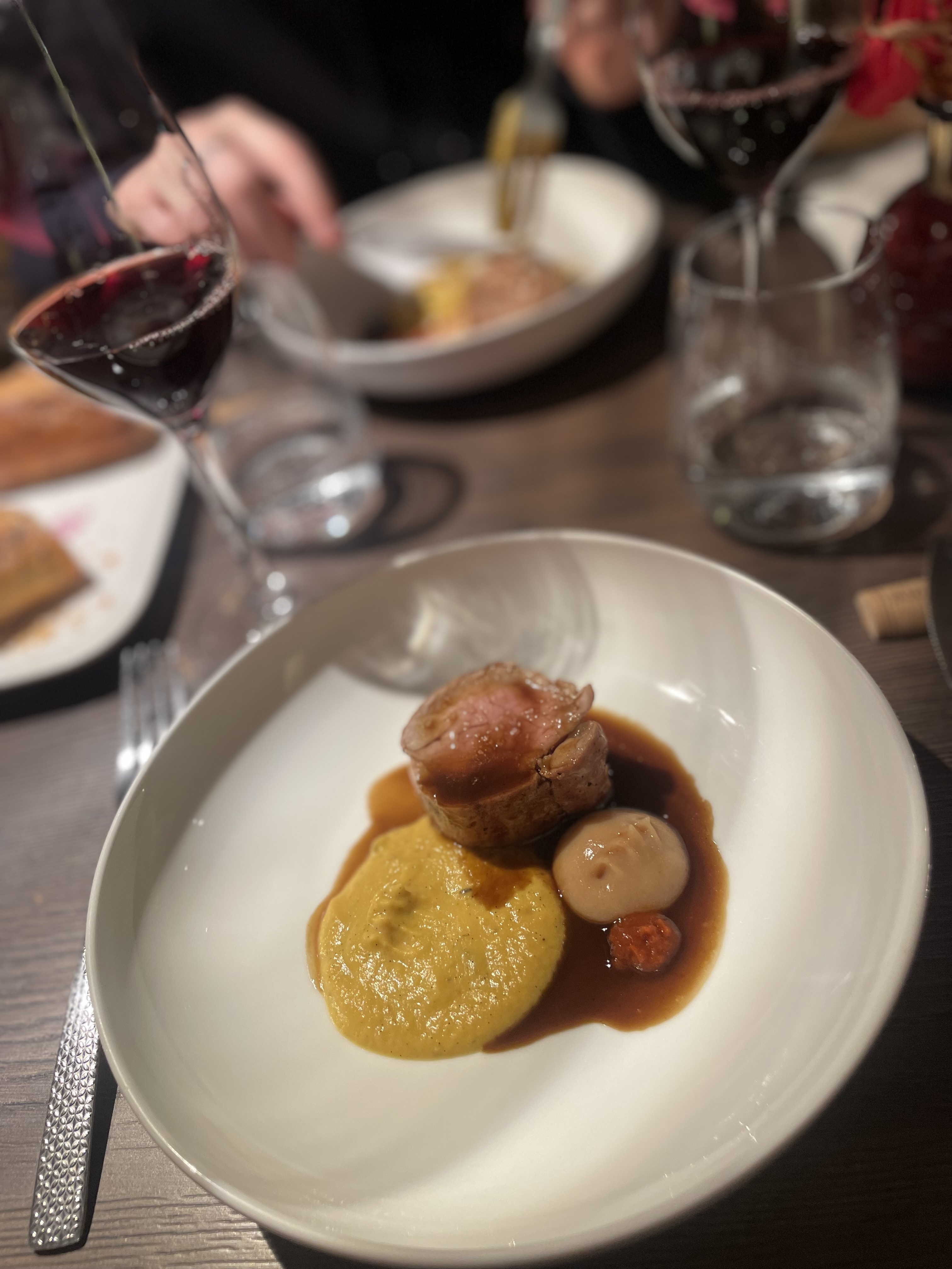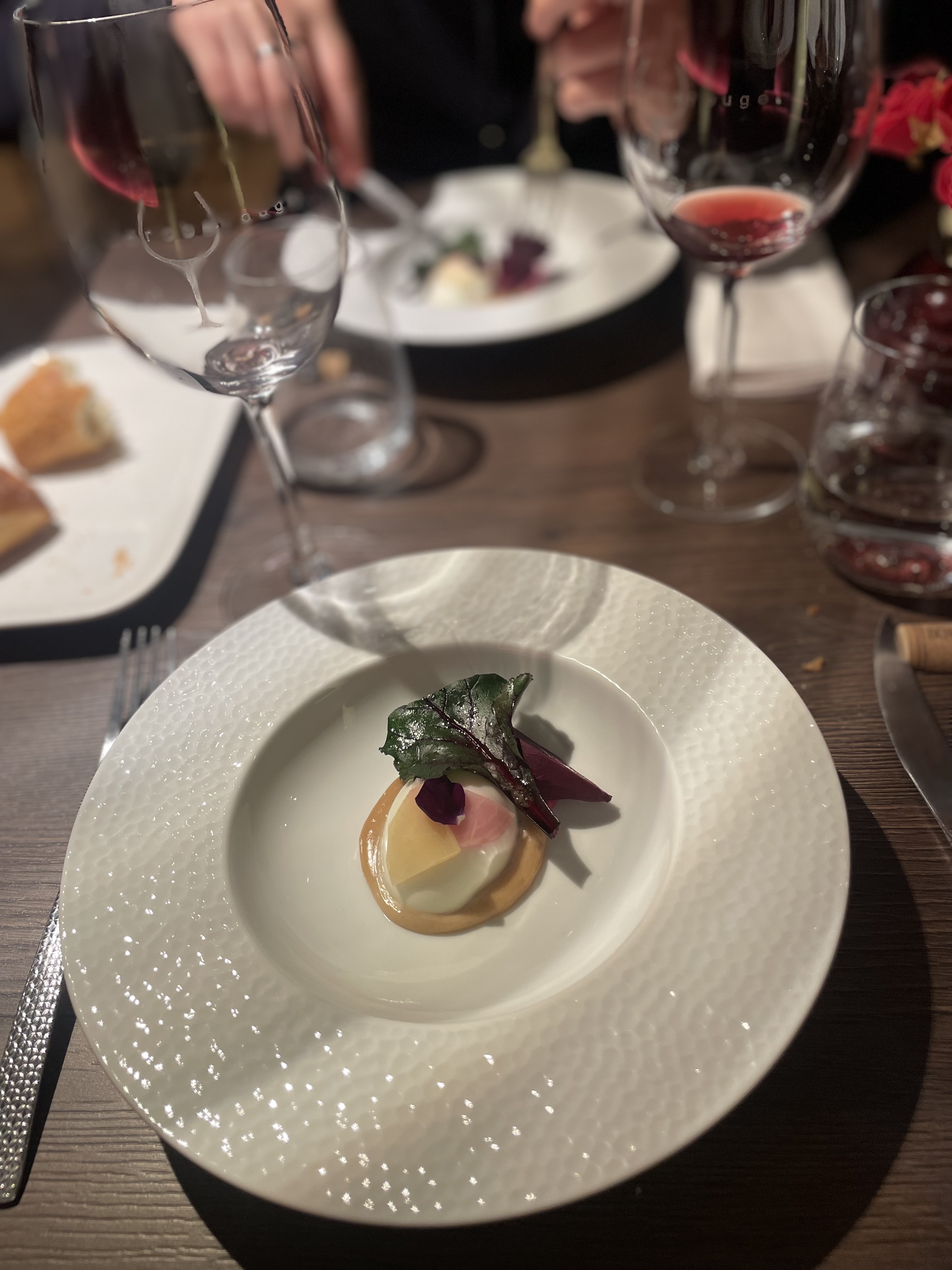 Repas en amoureux! Le service 6 plats avec accord mets et vin! Cuisine raffinée, dressage soigné, jolie vaiselle! Le service est amicale et Familiale! Très joli moment!
