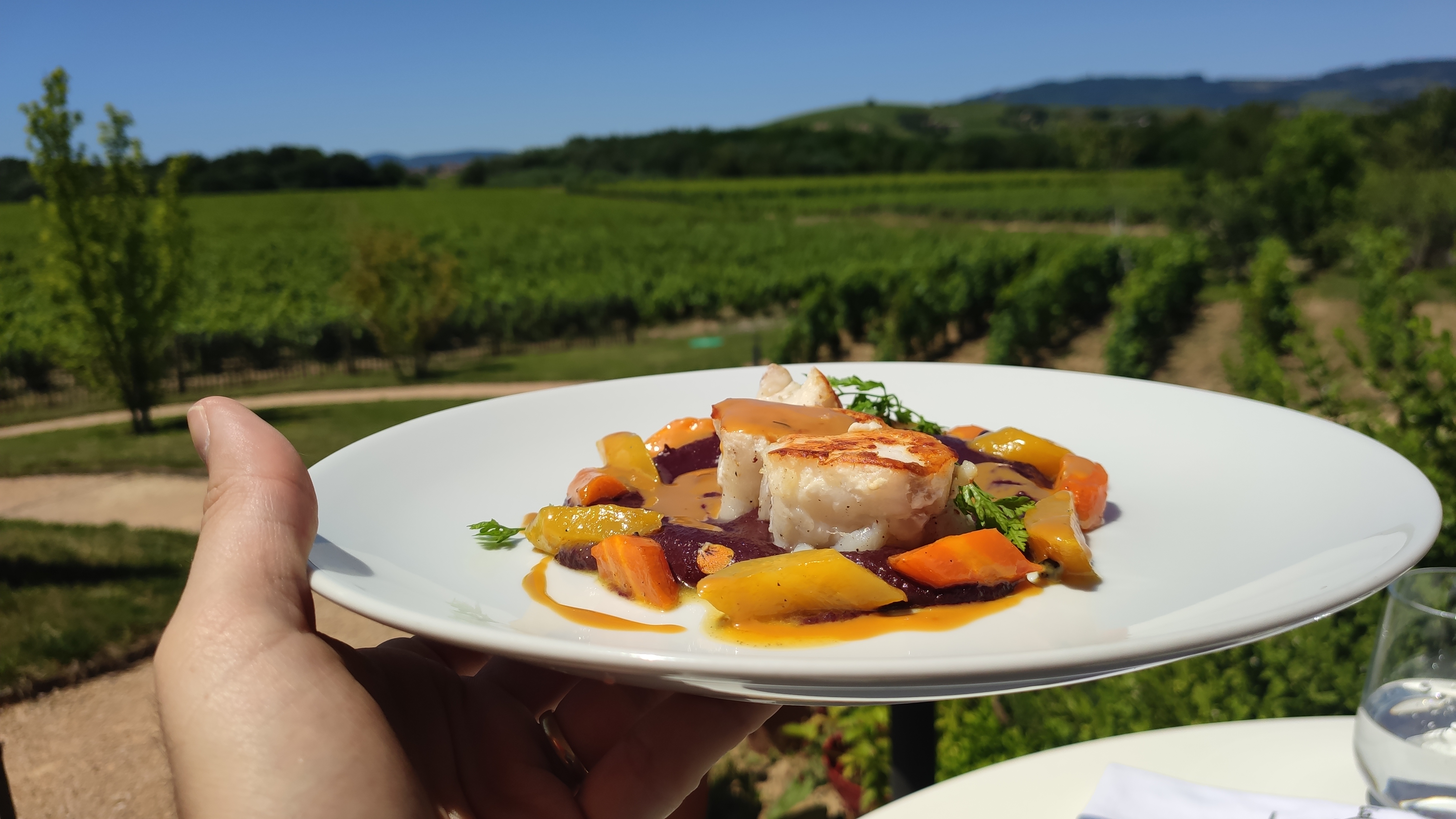 Une étape très gourmande, avec de beaux plats raffinés et visuellement étonnants ! Très bien accueillis et servis avec le sourire, sur une terrasse ombragée dominant de belles vignes à perte de vue.