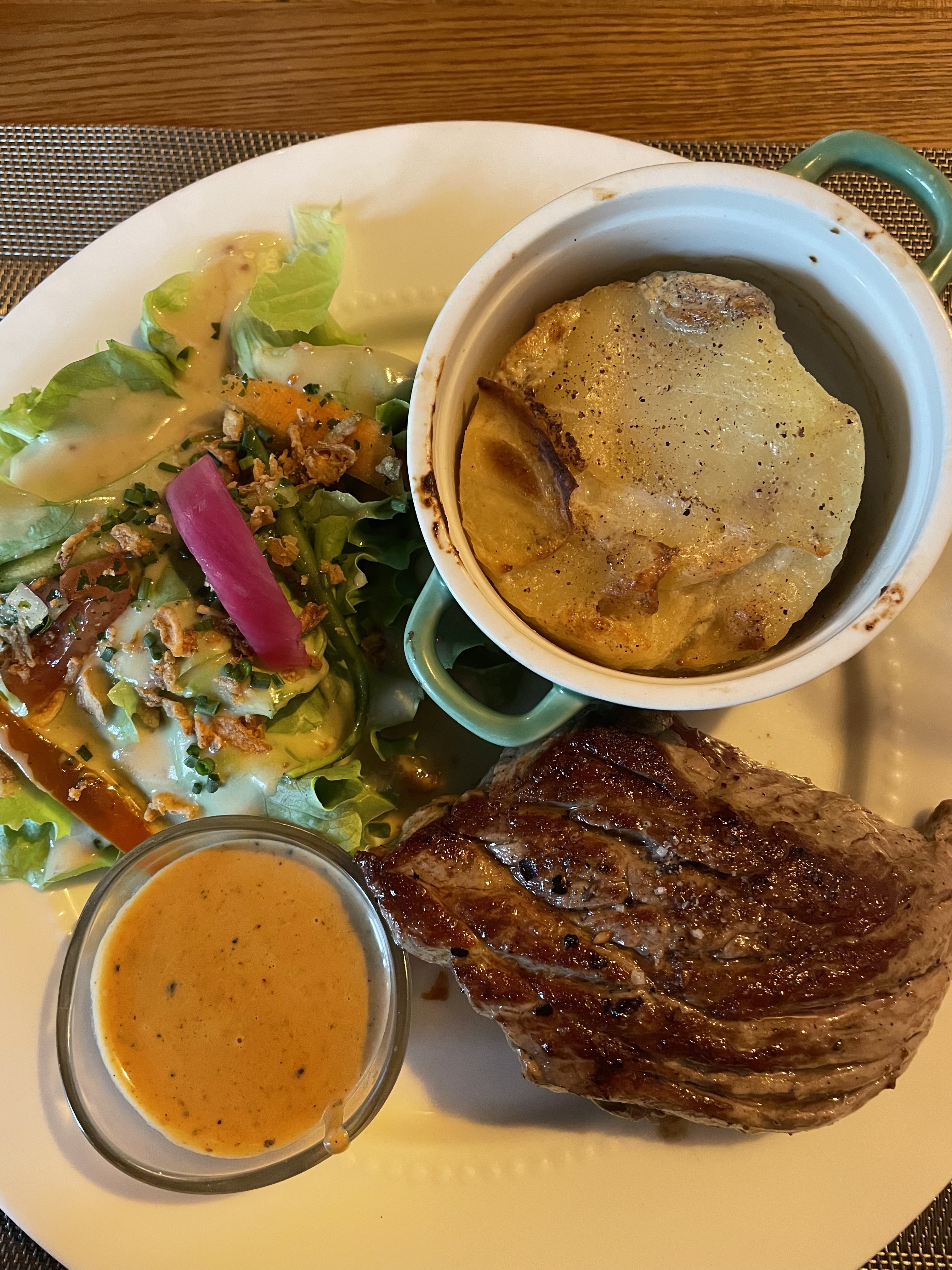 Plat très bon et très généreux avec une cuisson de la viande parfaite. Restaurant chaleureux et personnel accueillant. Un choix plus large de vin au verre pour la région serait un plus.
