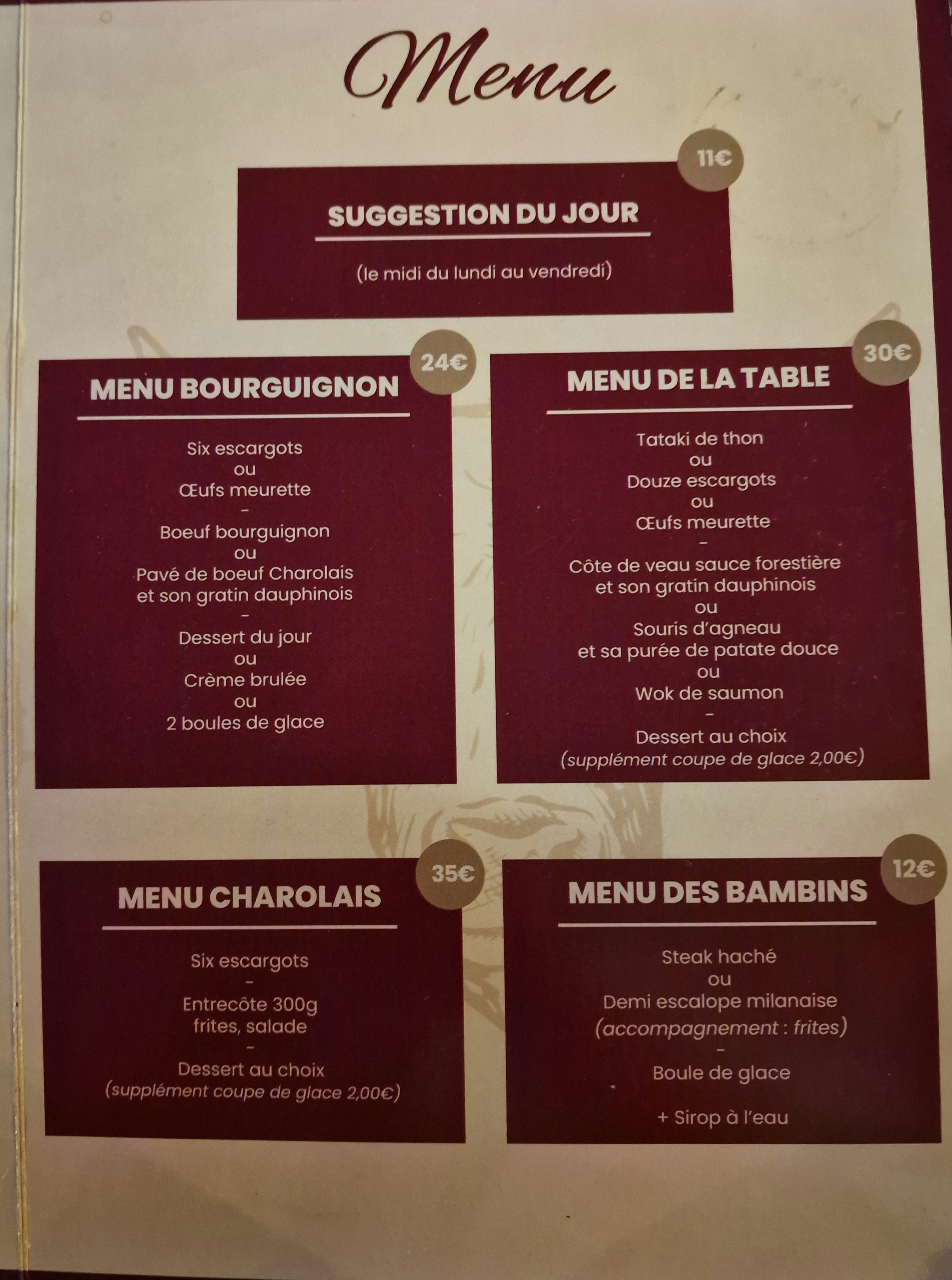 Délicieux menu, recommandations particulières pour le menu bourguignon, service irréprochable