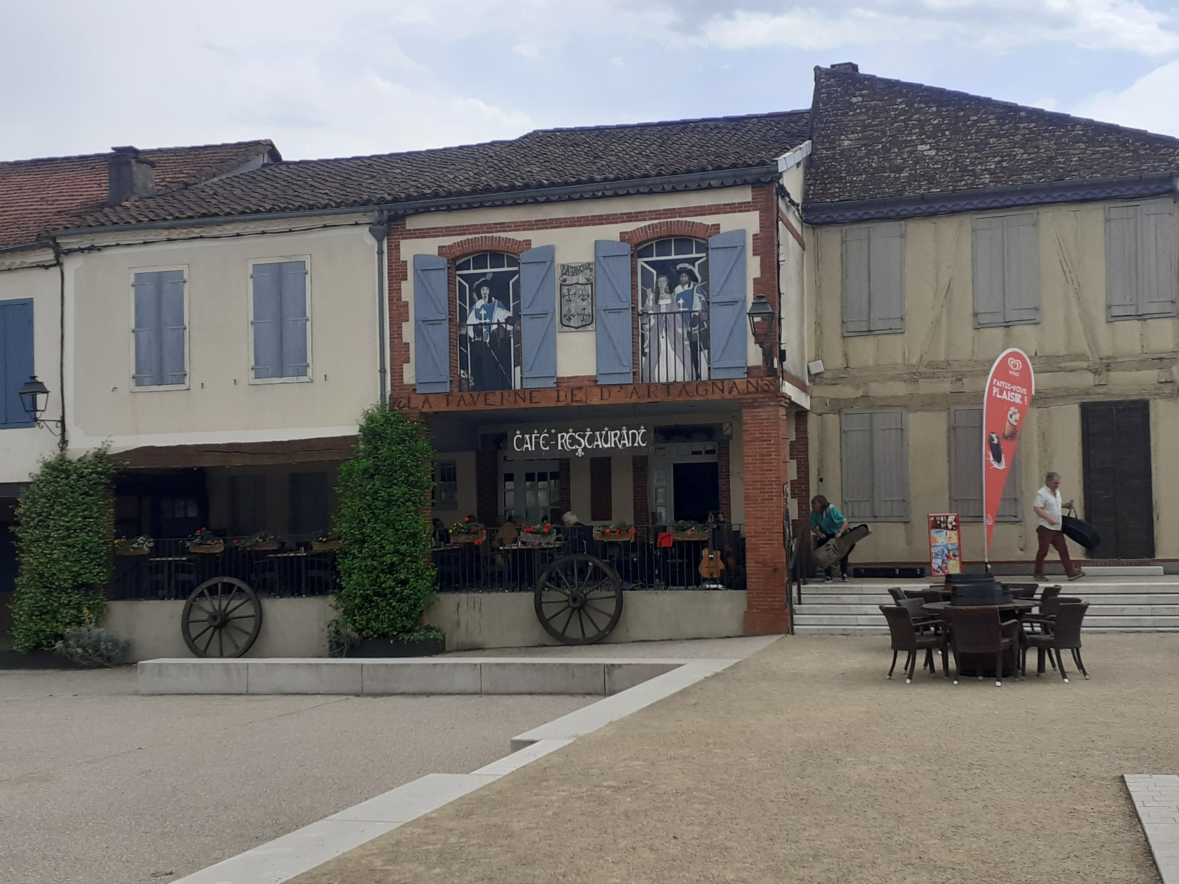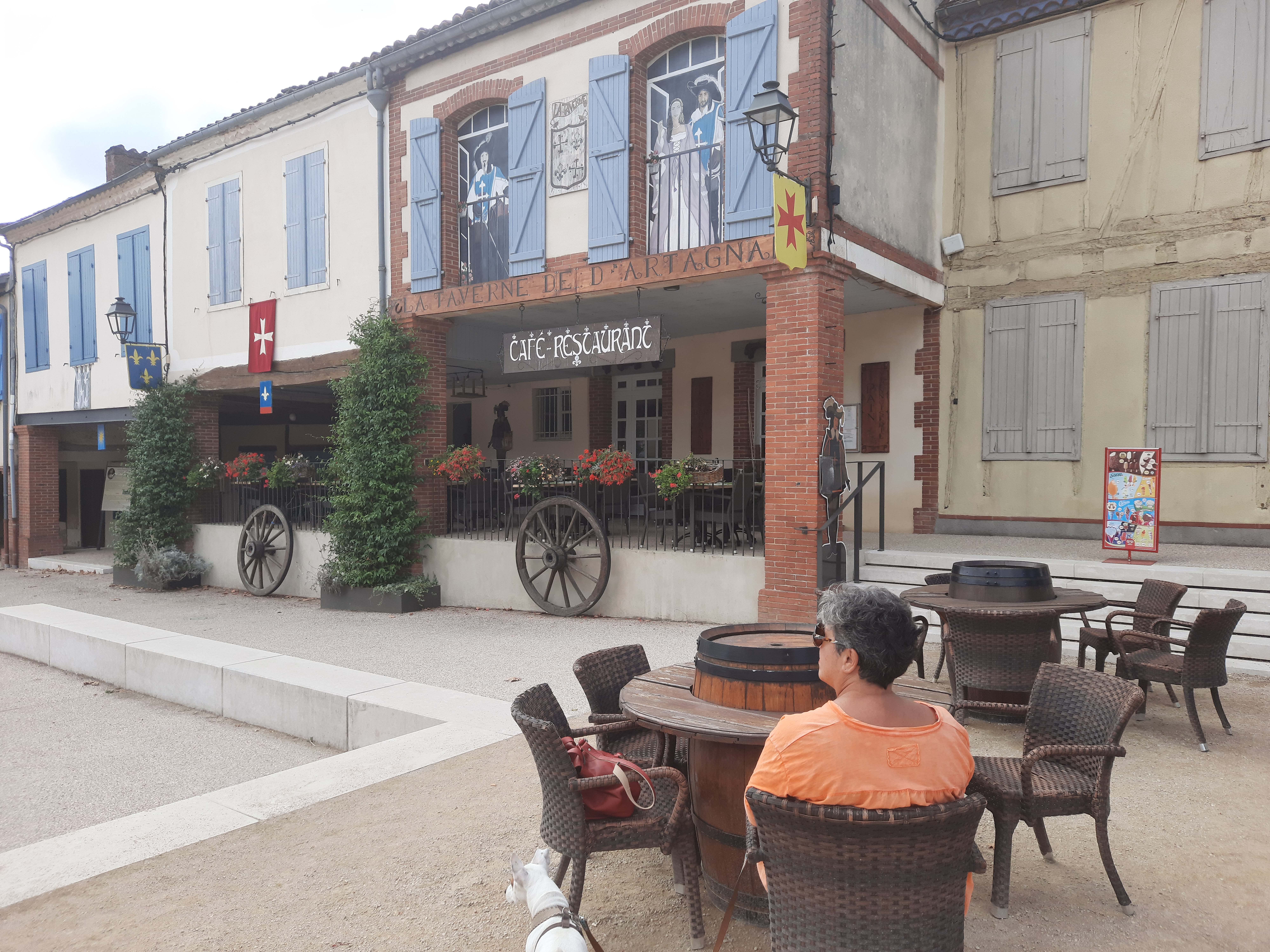 Nous visitions la maison natale de D'Artganan. Quoi de mieux que de manger quelque chose dans la taverne à son nom. Nous avons appris grâce aux informations touristiques que le restaurant avait de nouveaux propriétaires cette année. Nous y avons commandé le menu. Celui-ci a été remplacé par un plat végétarien pour ma femme, ce qui n'est pas standard. J'étais presque un peu jaloux. En entrée il y avait un taboulé. Le plat principal était une sorte de boulette de viande à base de porc effiloché avec de la sauce tomate, des légumes et des pommes de terre. Tout était évidemment fraîchement préparé. Enfin, une tarte aux abricots en dessert. Le tout était une très bonne cuisine maison à un prix raisonnable. En raison de notre français malheureusement médiocre, le service s'est montré très soucieux de nous expliquer les plats et de rendre possible l'option végétarienne évoquée pour ma femme (voir photo)