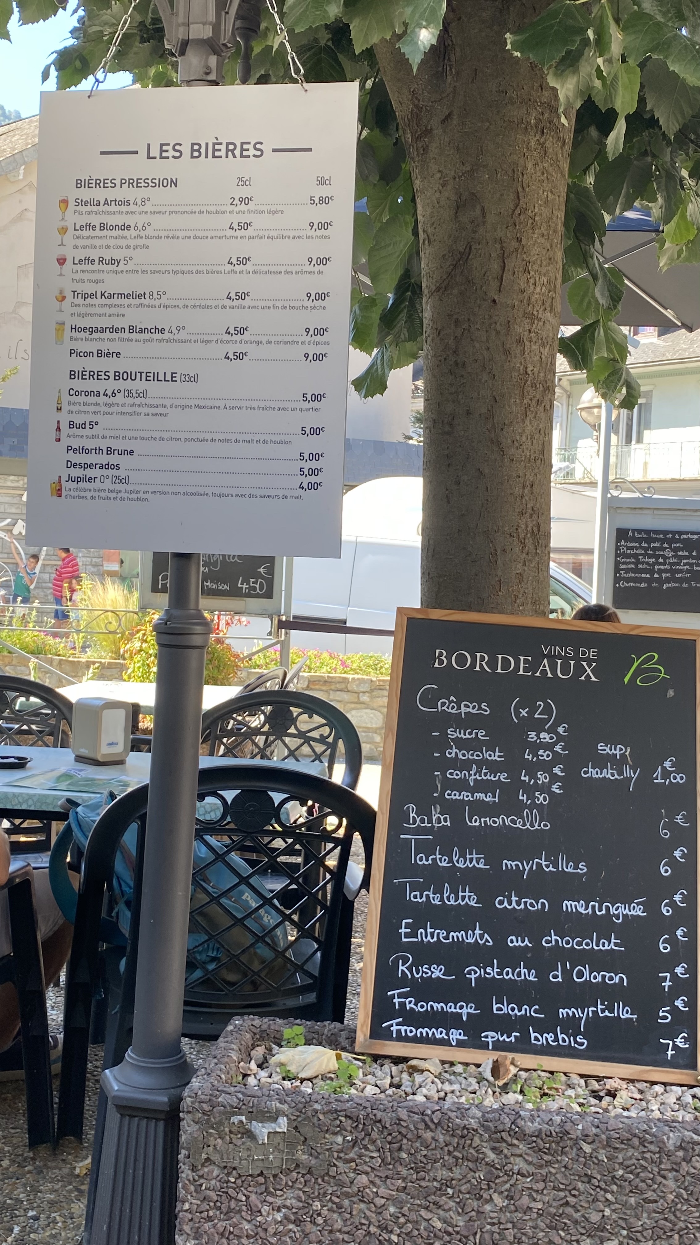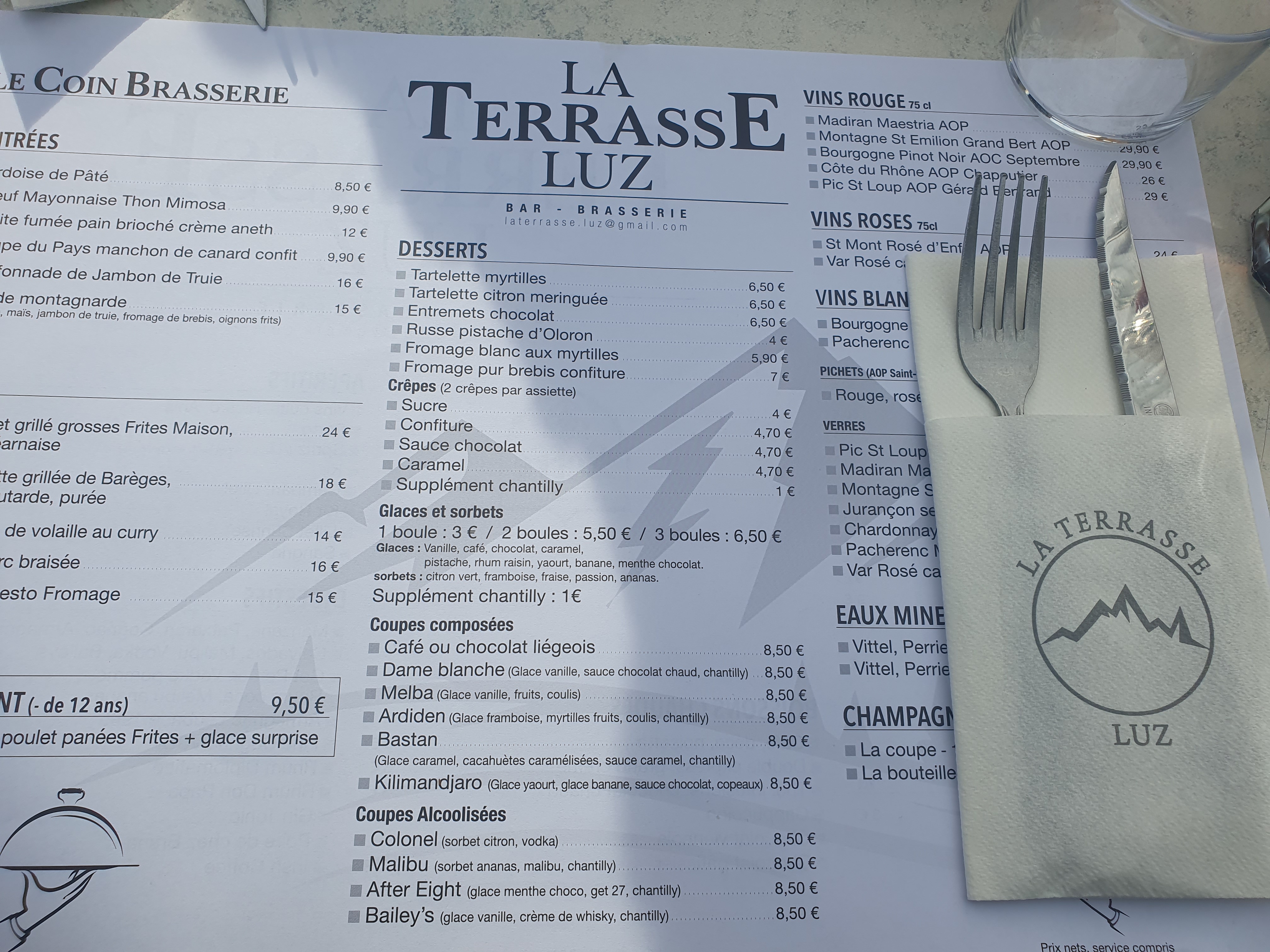 La terrasse… un point incontournable de Luz. L’ancien hôtel de l’Univers, excusez nous du peu. Plus sérieusement, idéalement situé, personnels compétents, rapides et souriants. Nourriture… faut pas se mentir on est loin de l’étoile Michelin (vu la situation ça pourrait) et plus proche de la livraison Métro hebdomadaire. Ceci dit les assiettes repartent vides et les prix sont en adéquation avec la saison et les produits. Bref à recommander peut être pas … mais cela reste une table correcte et bien située. Pas de violence, c’est les vacances.