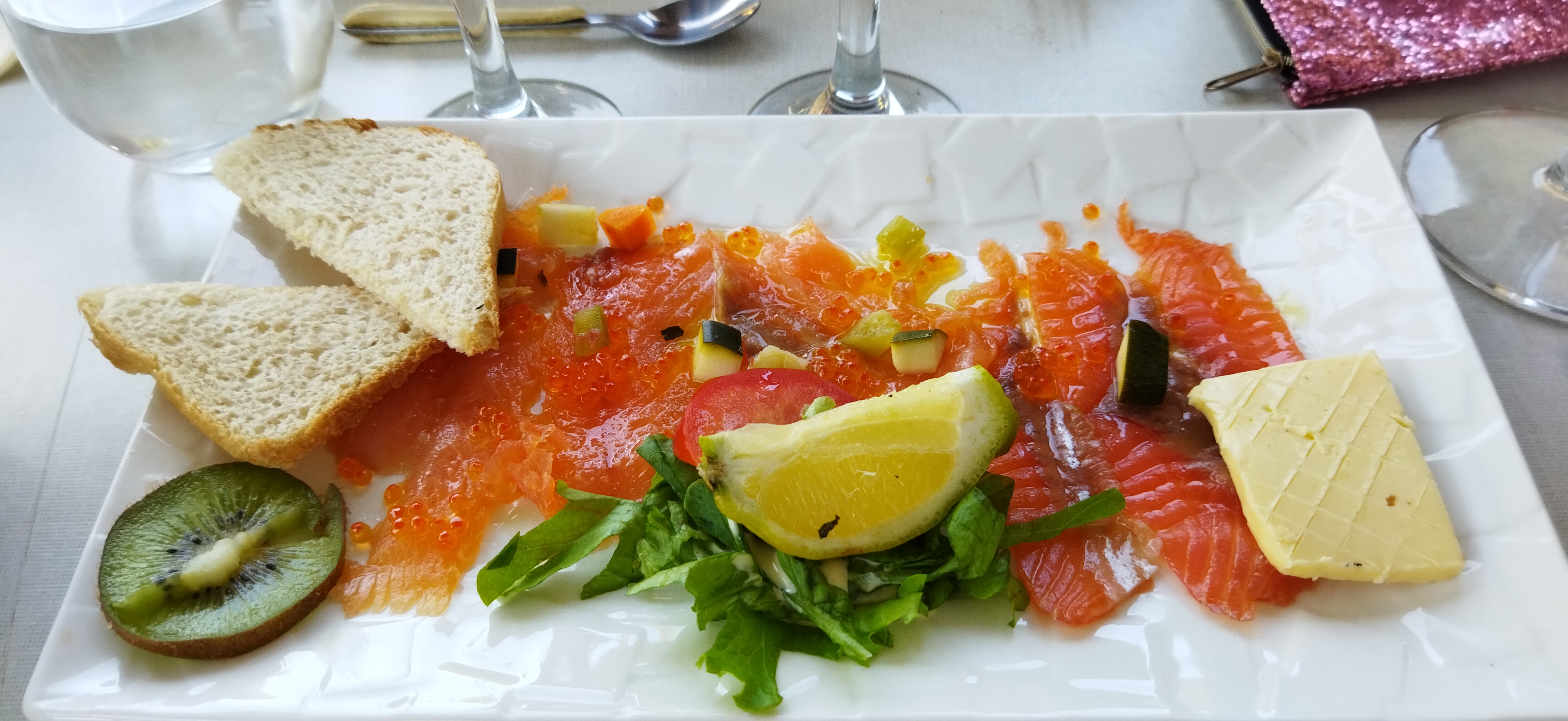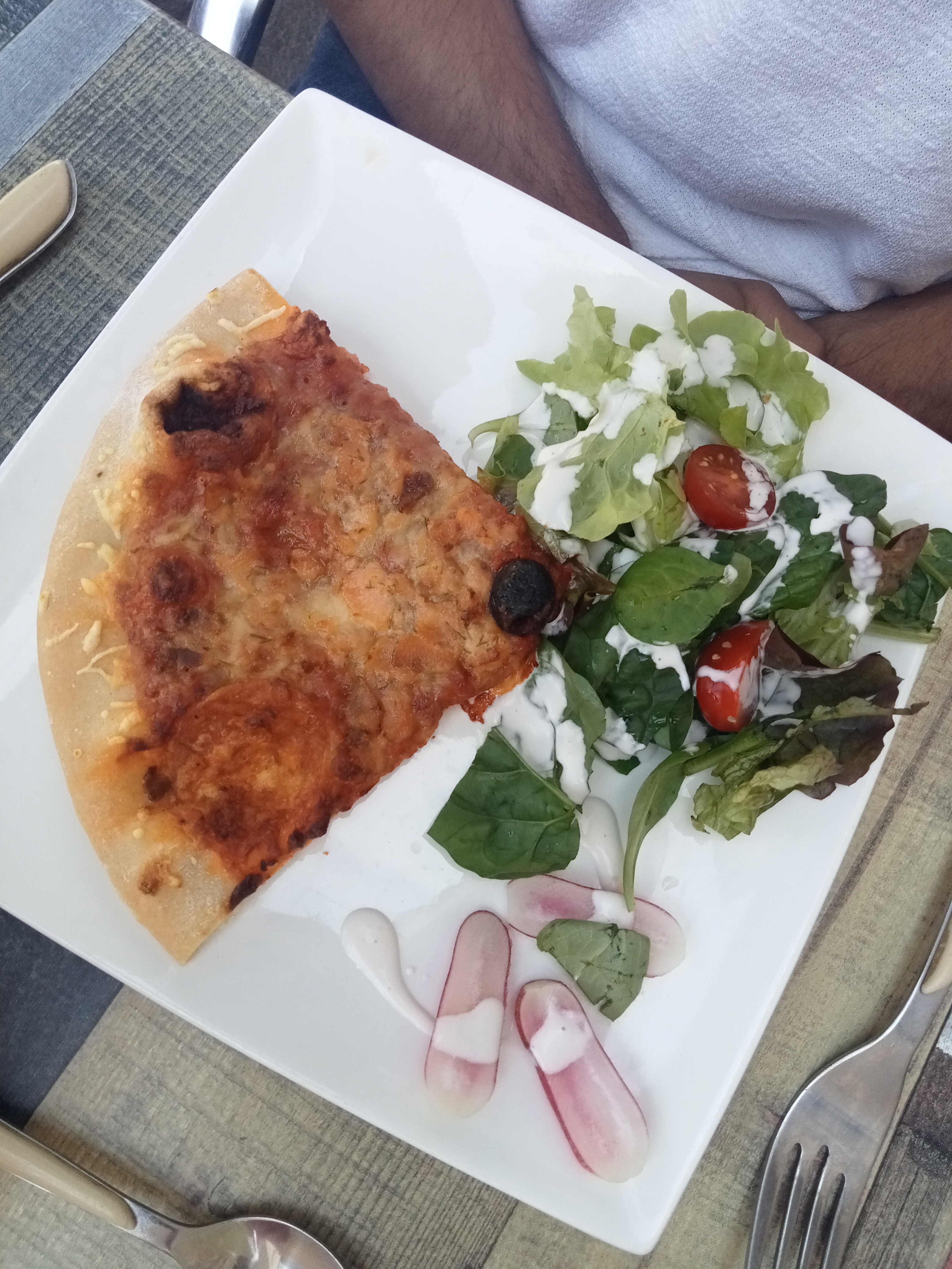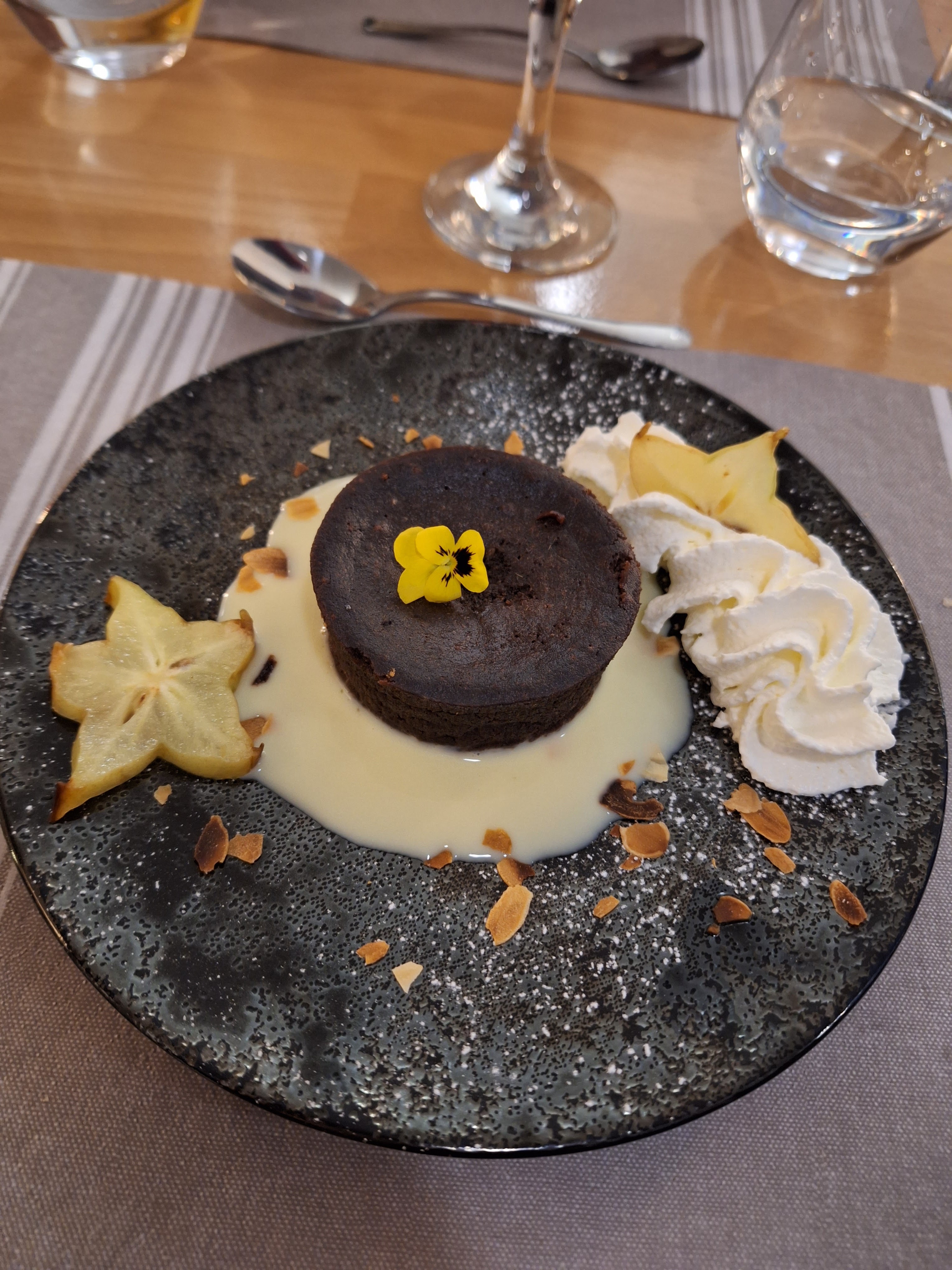 Je met une étoile car nous n’avons même pas eu le temps de manger. Installés sur la terrasse extérieure sous un parasol après une grosse averse, Celui-ci s’est vidé de son eau après un coup de vent. Nous avons demandé au responsable de changer de place dans une terrasse vide, mais celui-ci nous a gentiment envoyé balader alors que nous nous sommes retrouvés trempés.