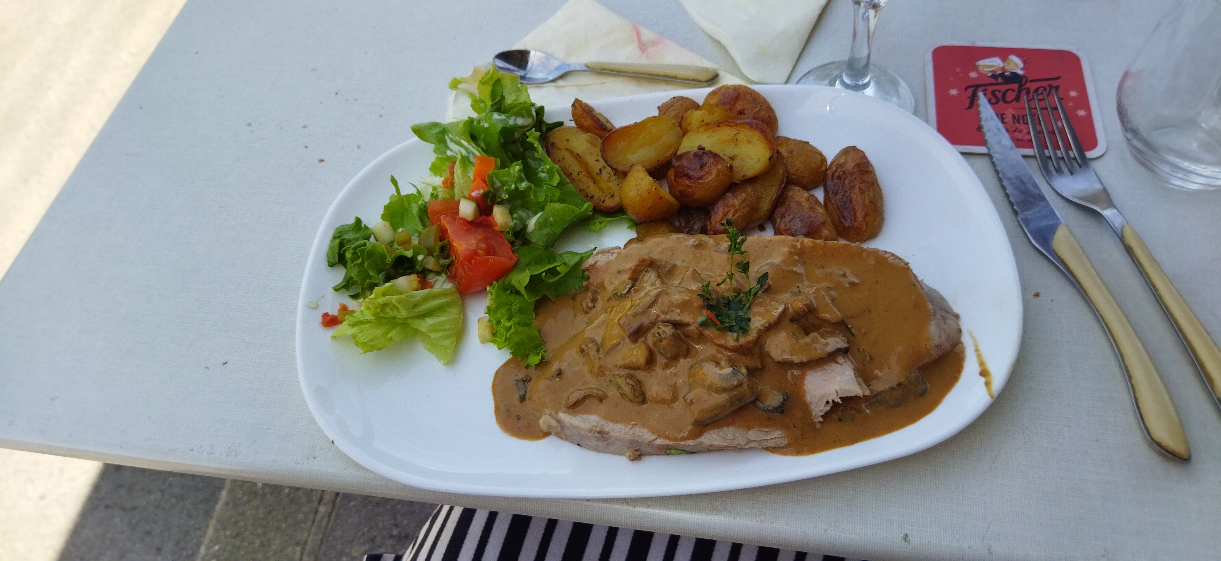 Soudain, vous vous retrouvez assis sur une terrasse calme et confortable où vous pourrez prendre un délicieux déjeuner. Le steak et les frites sont exactement comme vous les aimez. Je suis végétarien et j'ai eu une salade avec du couscous et du fromage. Le dessert est raffiné. Un menu avec une entrée terrine, un steak, un dessert et un café coûte 13,50.