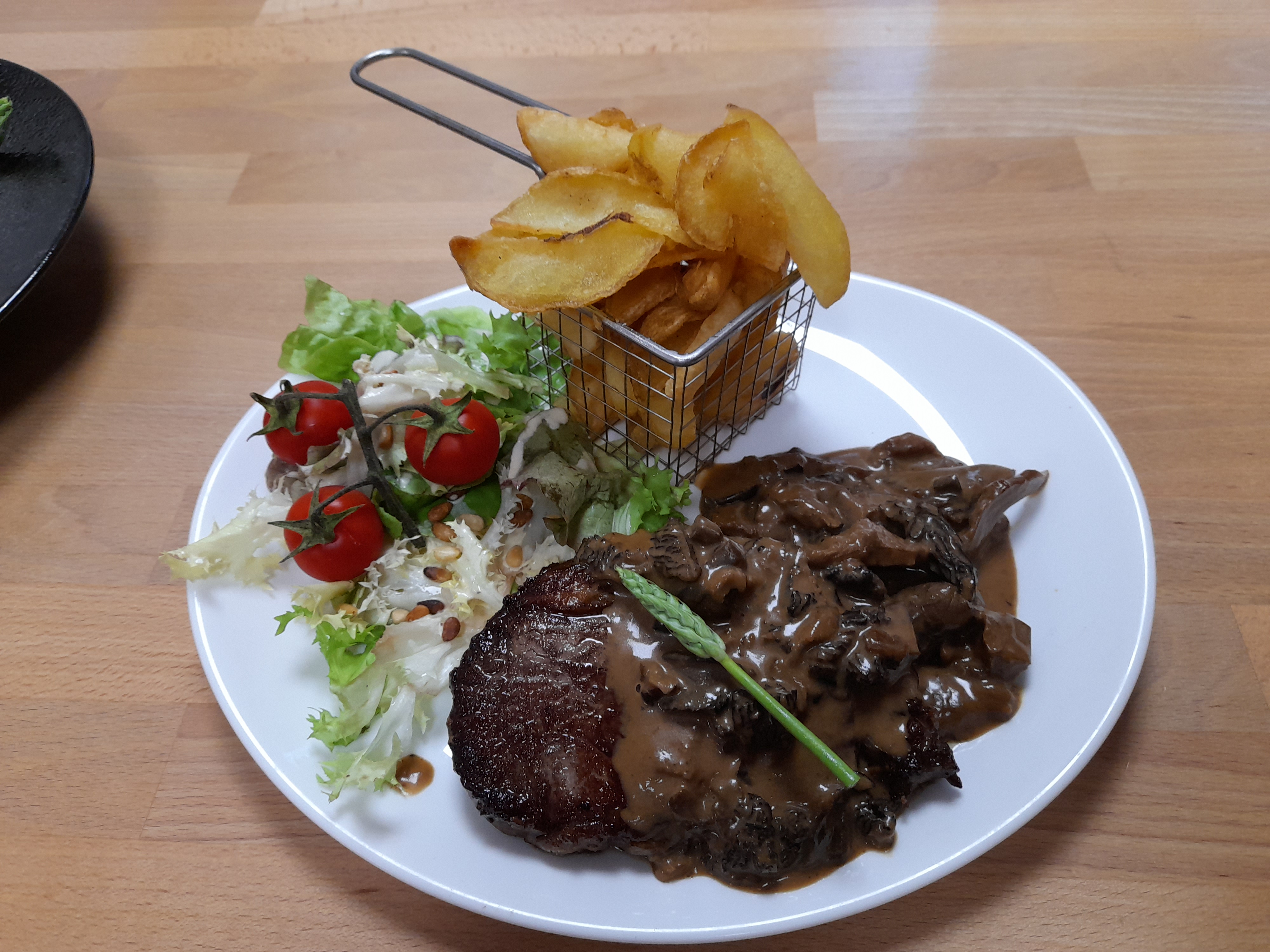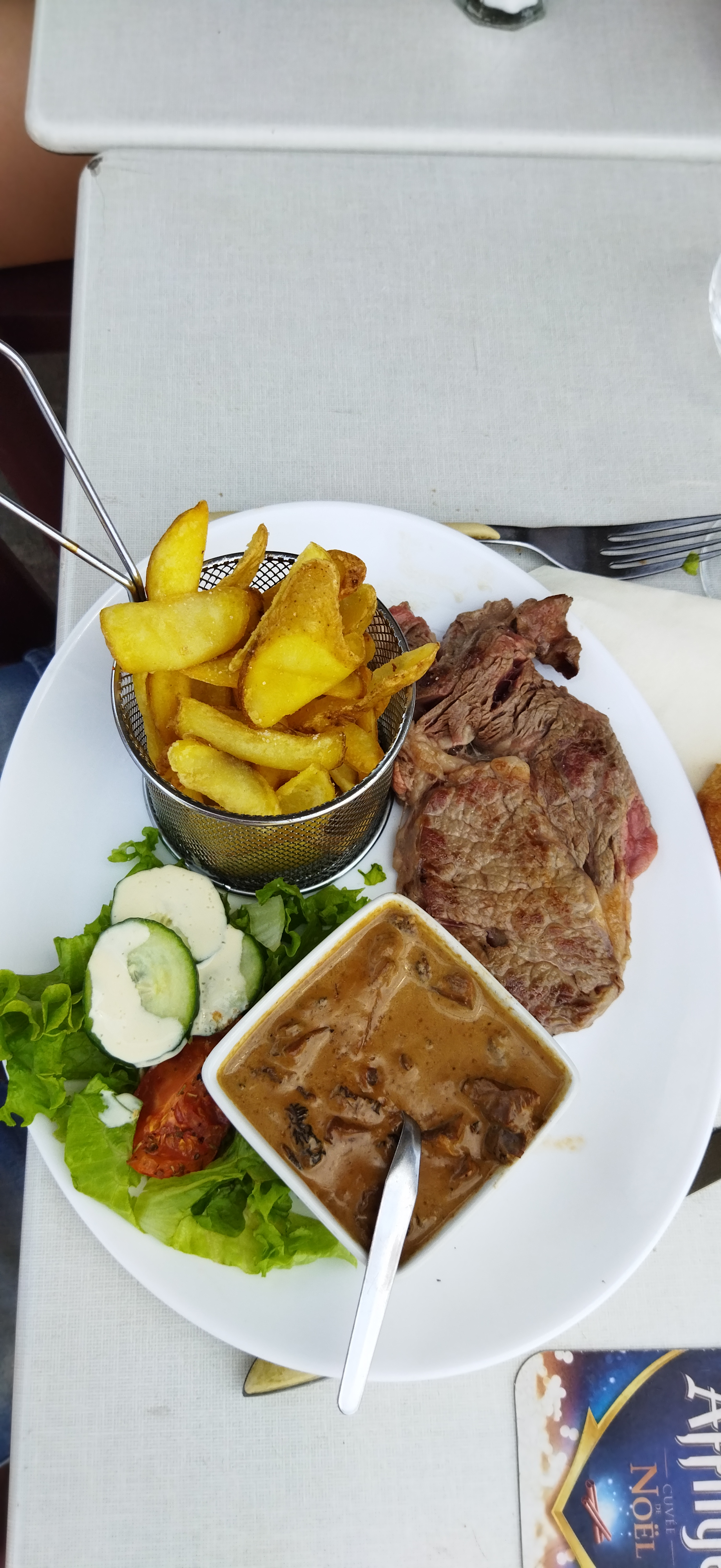 Déçue un repas à midi steak frites salade pour 17 euros pour mon mari moi steak avec une petite galette de pomme de terre et salade steak dur assiette peu copieuse pour le prix je n y retournerai plus