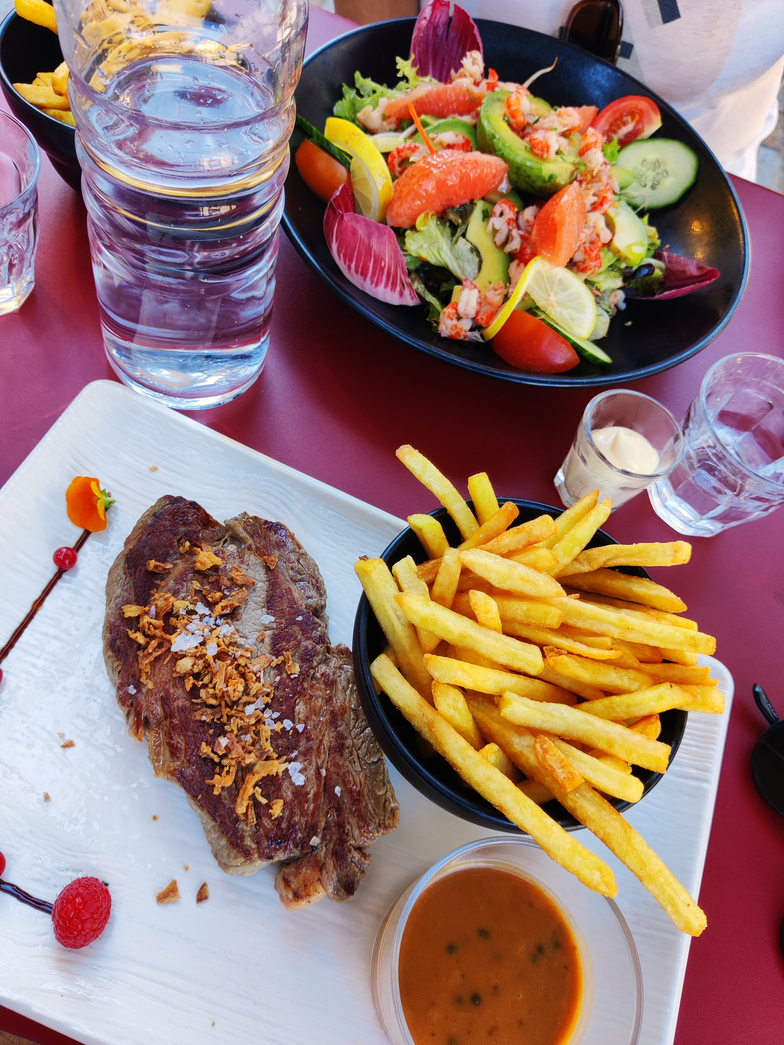 Belle terrasse, service impeccable et souriant, entrecôte maturee délicieuse