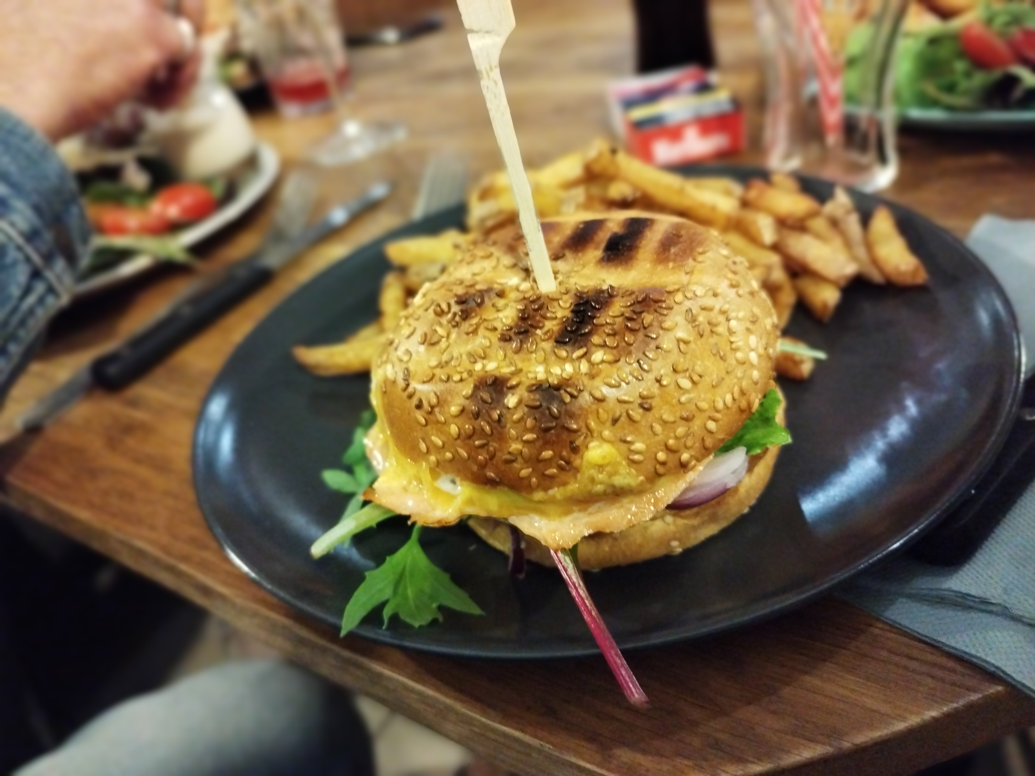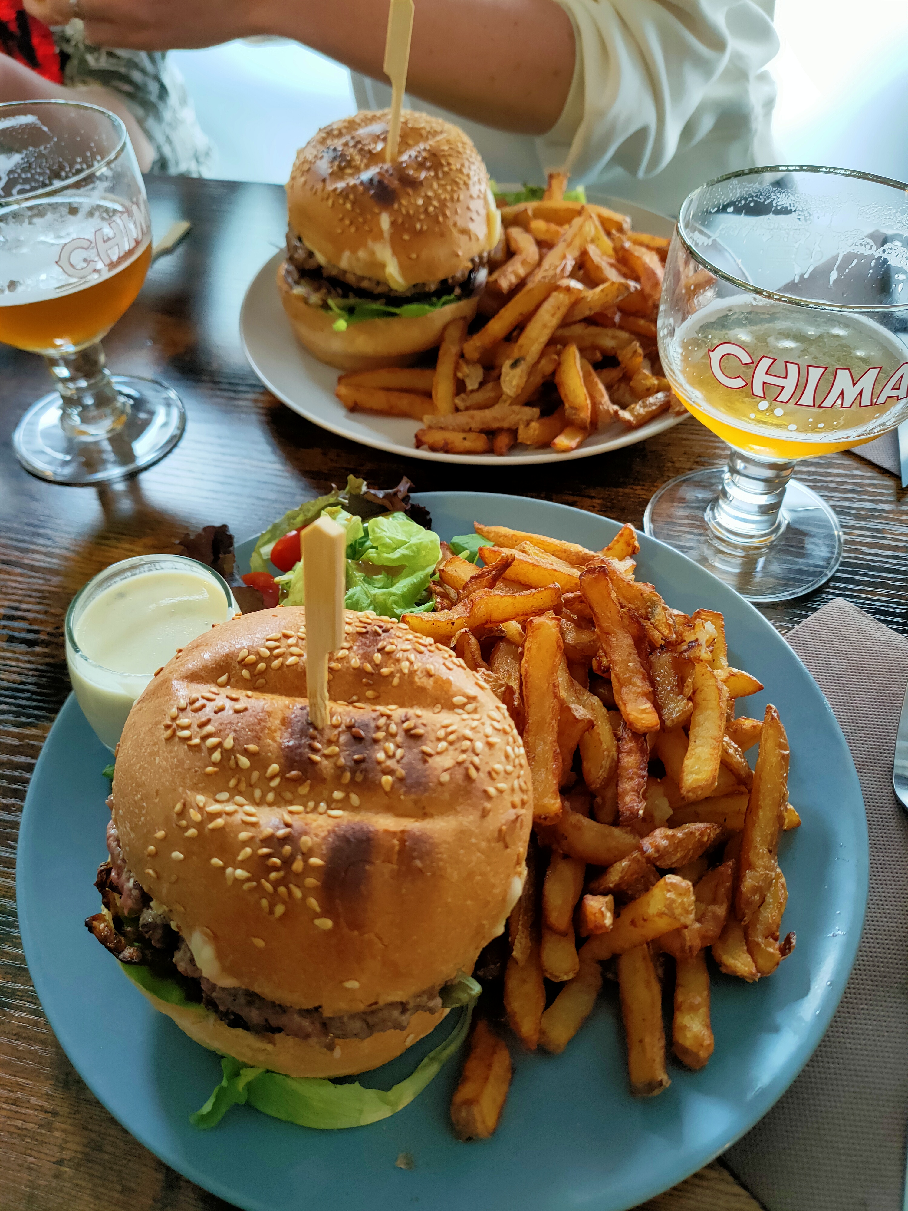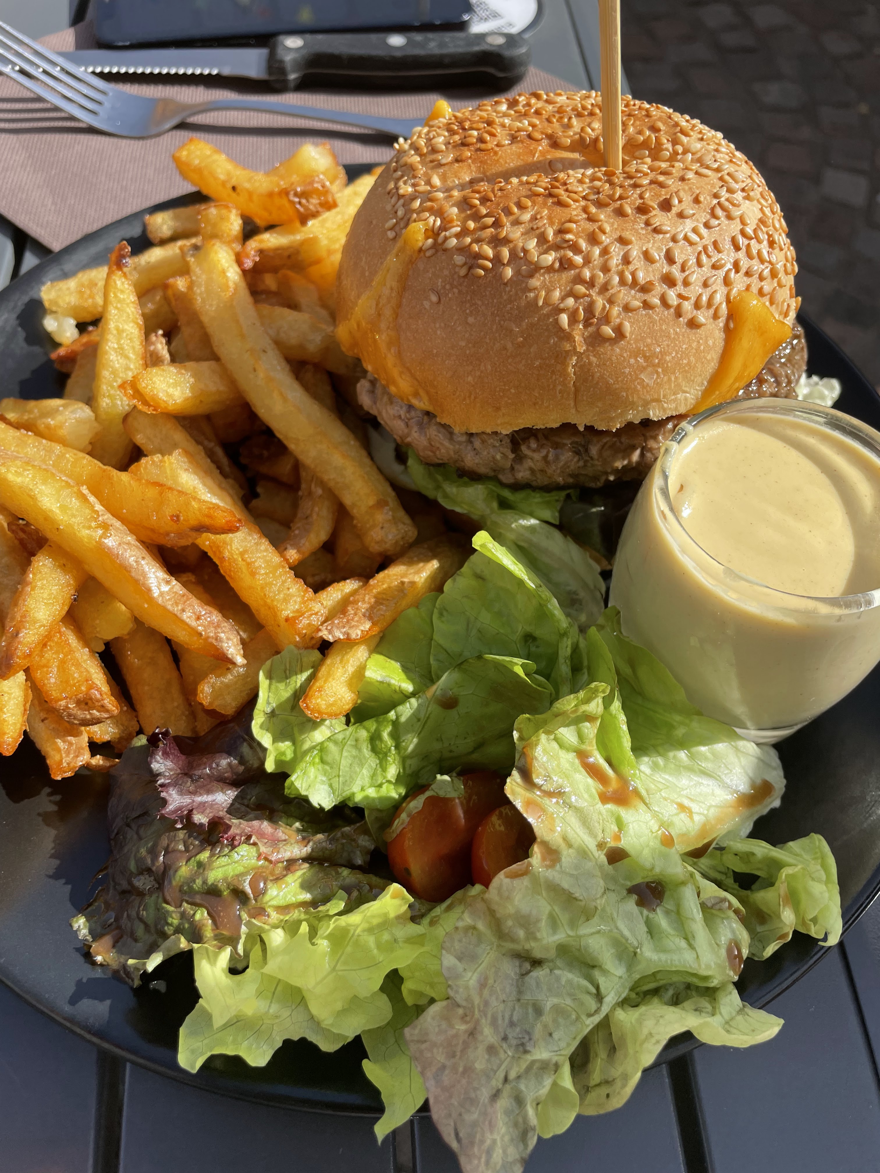 De passage sur une belle terrasse pour dévorer un très bon burger avec des frites maison. Formidable. 👍