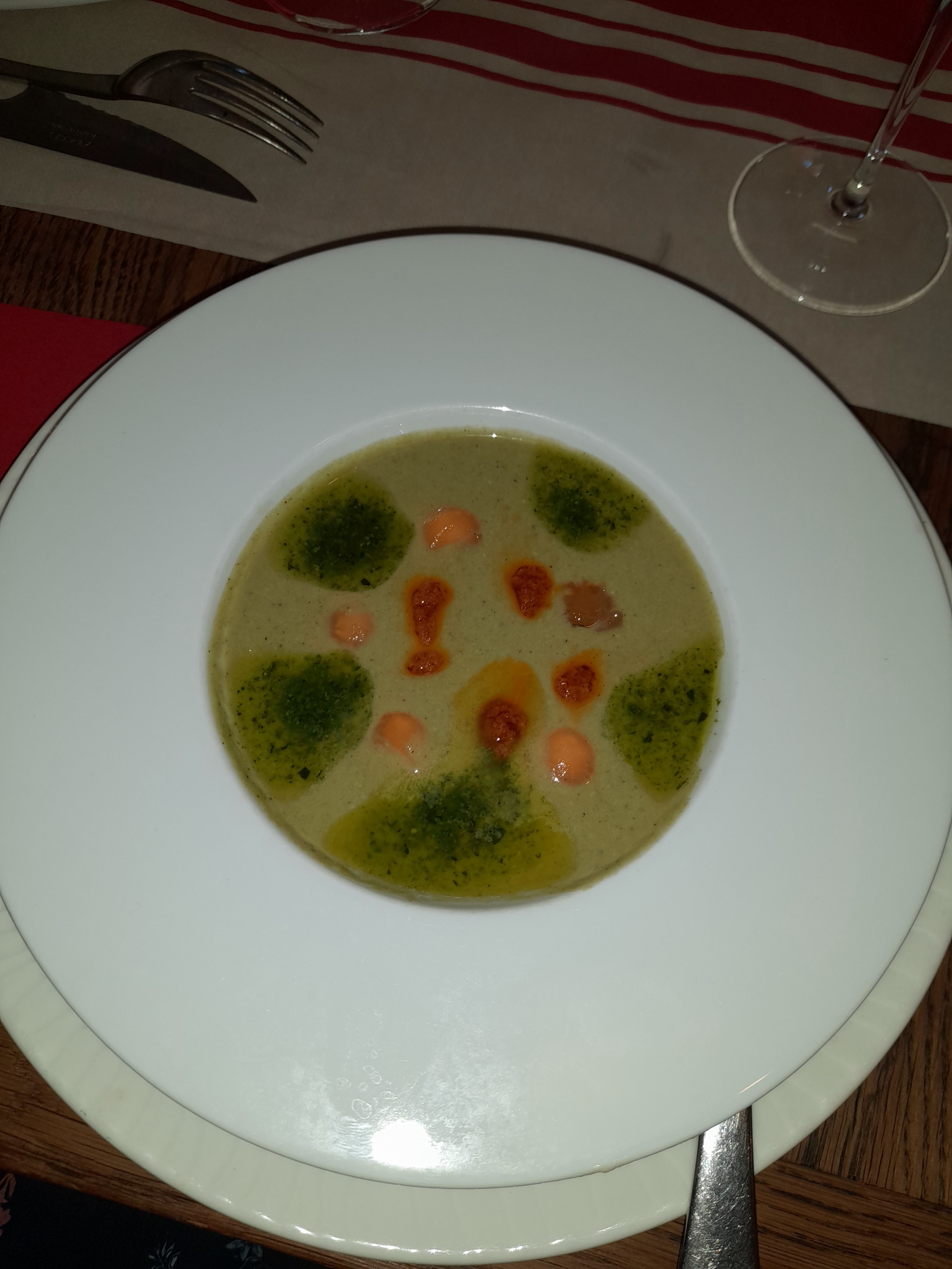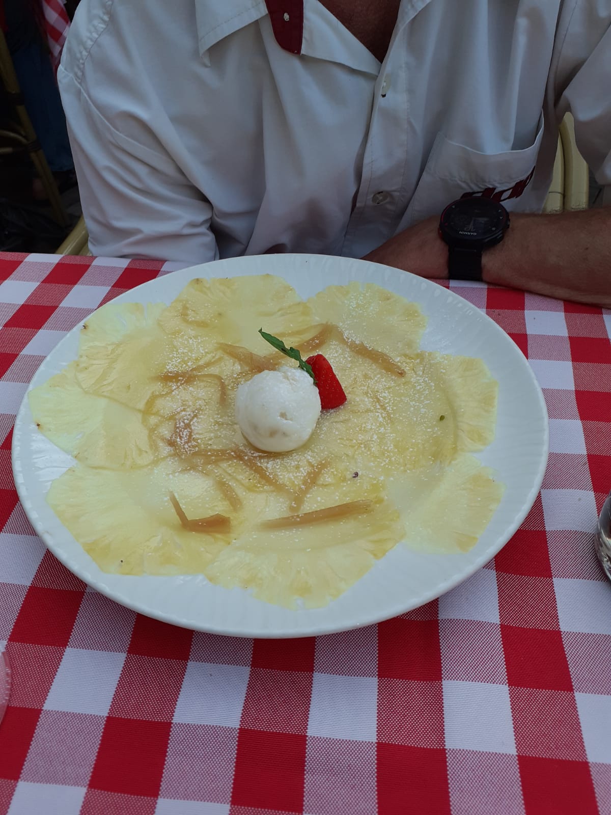 Arrivés un peu en avance( nous avions eu peur de ne pas trouver de place pour se garer), nous avons été mal reçus et avons dû attendre dehors sous un gros orage . On nous a placé dans un coin si exigu que on devait se contorsionner pour y accéder. Bref accueil plutôt désagréable... Peut-être n’étions nous pas assez chics ? De ma place je voyais la barmaid piocher les glaçons à pleines mains avant de les mettre dans les verres d’apéritif....Ici, les règles sanitaires n’ont semble-t-il pas été comprises..... Heureusement les plats que nous avons choisis étaient bons, bien présentés et copieux, bravo au cuisinier.