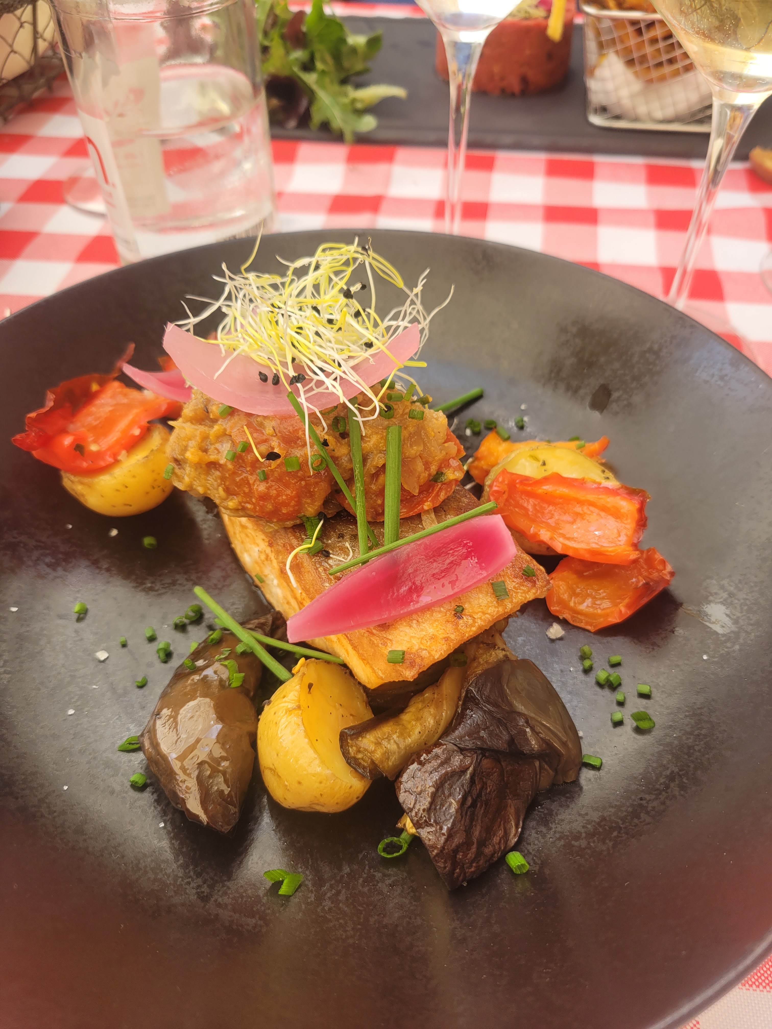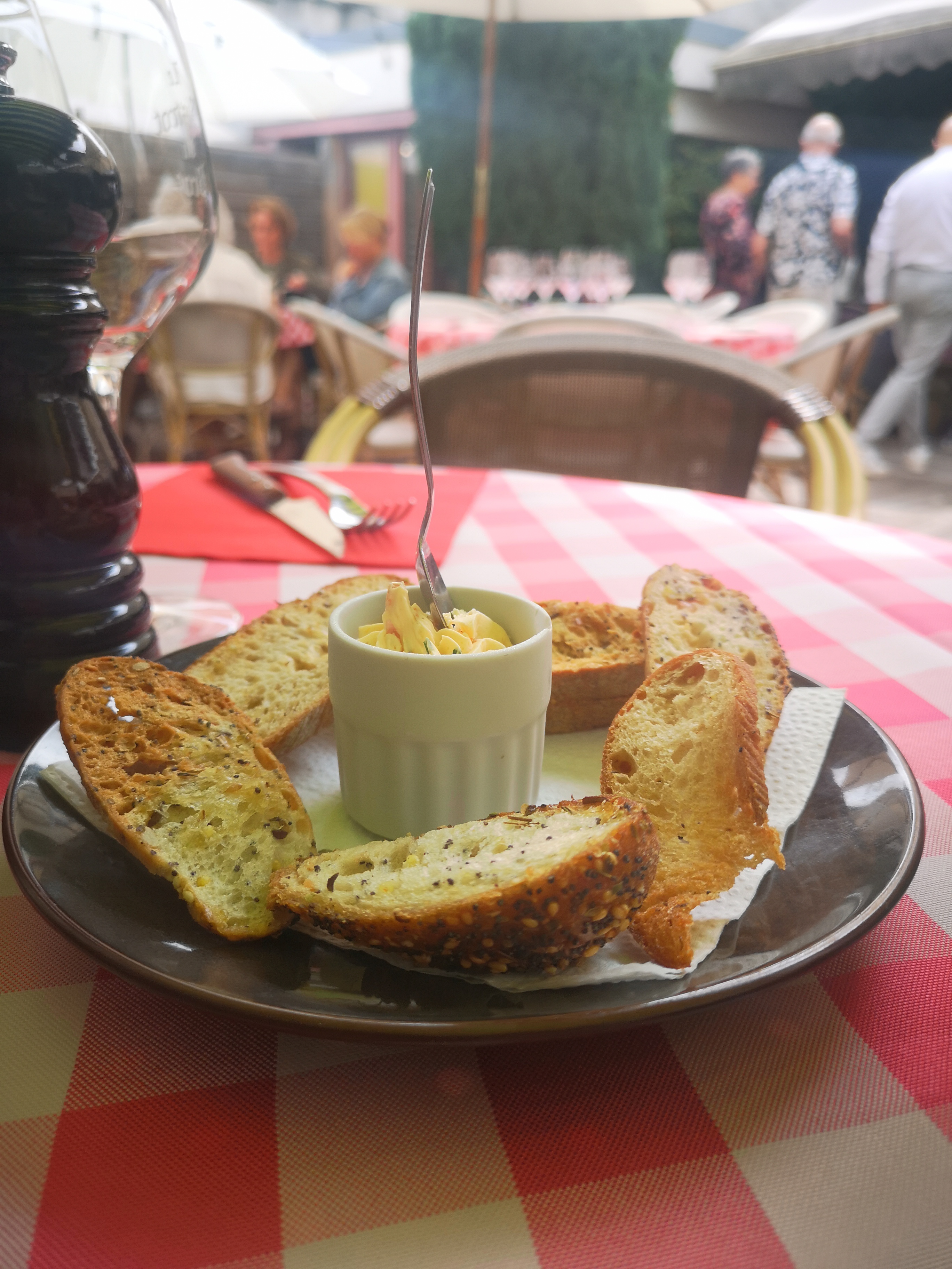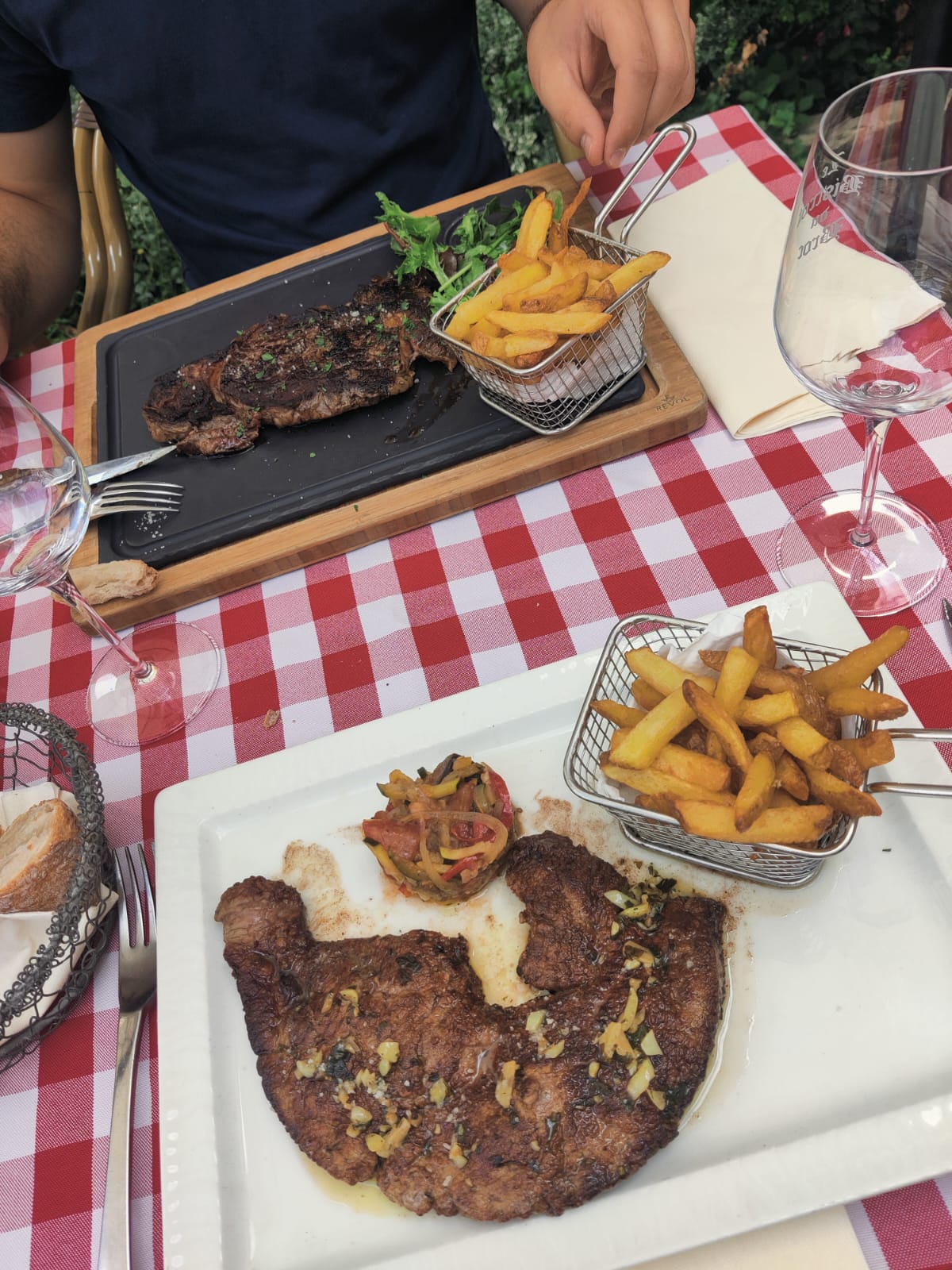 Charmant décor d'un patio avec ses nappes à carreaux et ses larges parasols. J'ai mangé un savoureux foie de veau ail et persil et pour finir une île flottante crémeuse à souhait. Excellente adresse et service impeccable !