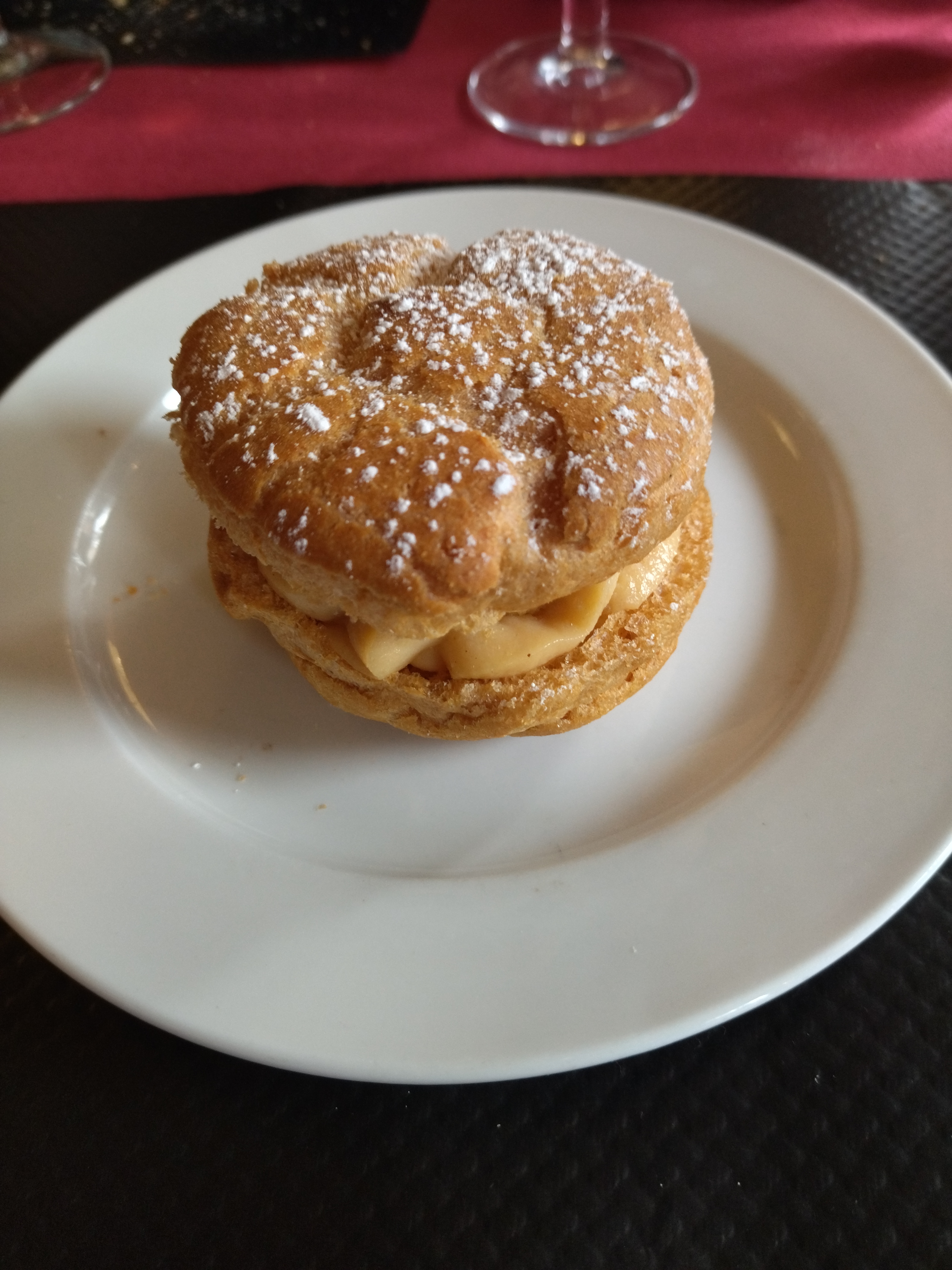Un restaurant sans chichi c'est vrai avec un service très efficace. Plus triste, un baba au rhum.... élastique !!! mais la glace qui l'accompagnait délicieuse et des prix de vins prohibitifs . Pour le reste un filé de boeuf tendre et goûteux avec une très bonne sauce une entrée agréable même si le jambon fumé ne fait pas forcément bon ménage avec le feuilleté au poisson.
