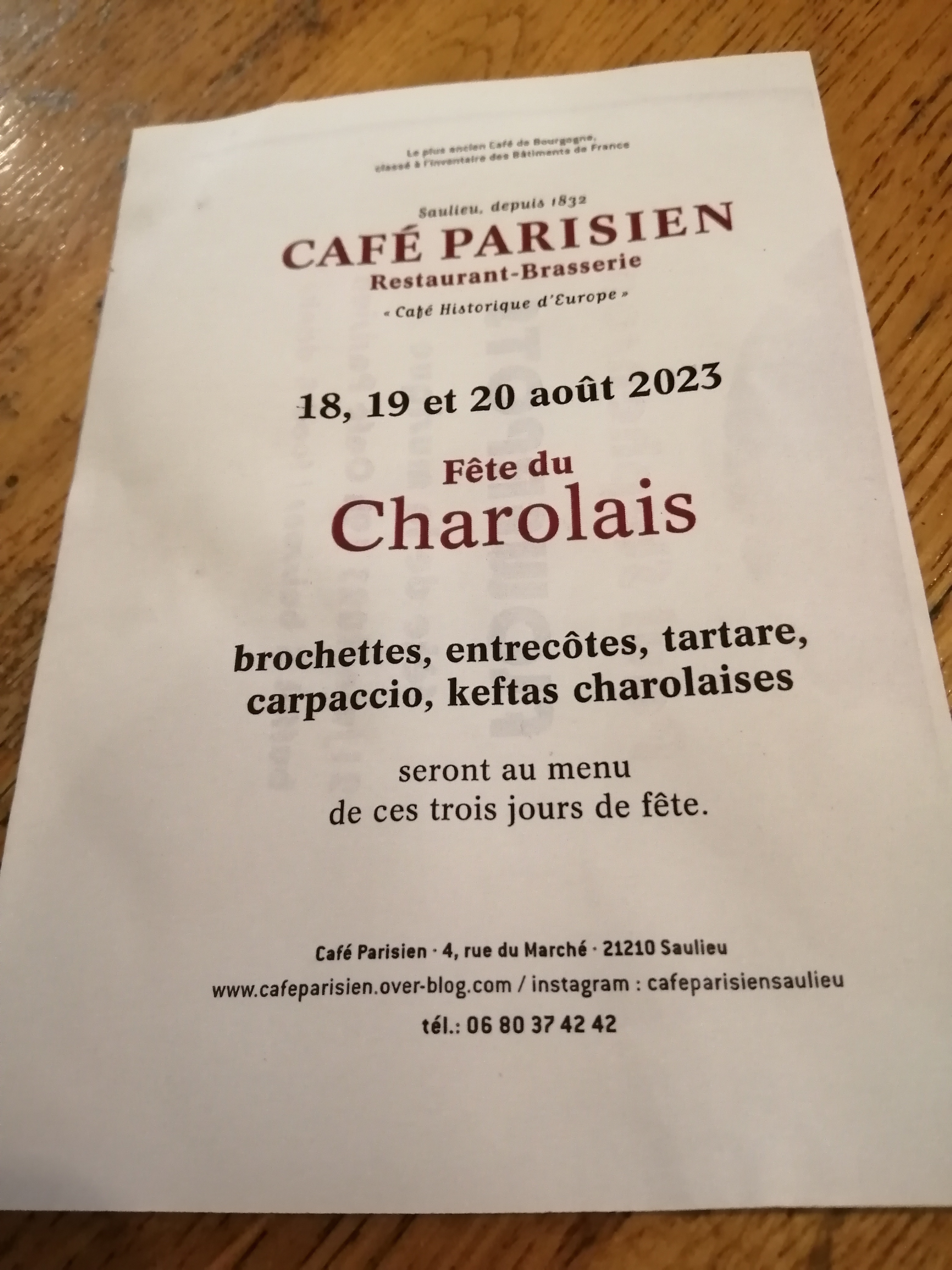 Posté le 03/07/2023 à 16:12"Le Café Parisien de Saulieu, oui il est encore dans son jus oui il fait un peu vieillot mais c'est tellement bien de trouver des ambiances différentes, de ressentir quelque chose d'autre en rentrant dans un café encore dans son jus. Je vote pour le Café Parisien de Saulieu, avec en plus ou en plouche accueilli par une serveuse (ou la patronne?) avec un petit accent Anglais adorable !! Twelve points !!"