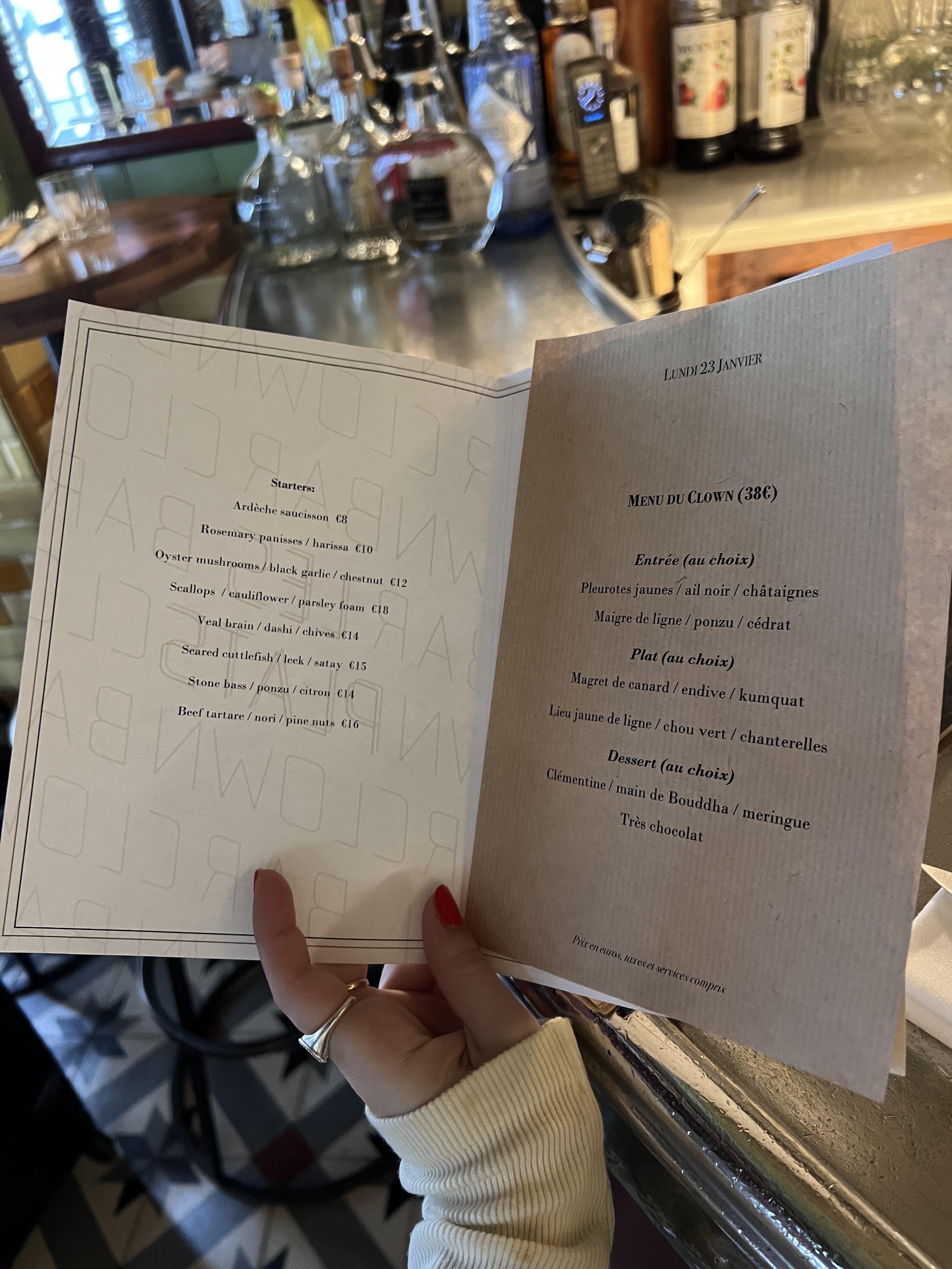 Un critique venu de Singapour. Nous sommes venus ici pour dîner le dernier soir de nos vacances à Paris. Il a été fortement recommandé, non seulement en ligne, mais aussi par nos amis et notre famille qui ont également mangé d'excellents repas ici. Dans l'ensemble, nous avons eu un merveilleux repas. On nous a dit que le chef cuisinier était coréen et que nous pouvions voir les influences asiatiques dans chaque plat. Ceci étant dit, je ne pense pas que nous reviendrions si nous devions à nouveau passer des vacances à Paris. C'est parce que nous avons eu de meilleurs repas au même prix ou à un prix plus compétitif. De plus, il y a tellement d’autres restaurants que nous aimerions essayer ou revisiter. En fin de compte, nous recommandons à tous d’essayer le bar Le Clown. Objectivement, c'est un menu bien élaboré et les saveurs étaient nouvelles et excitantes !