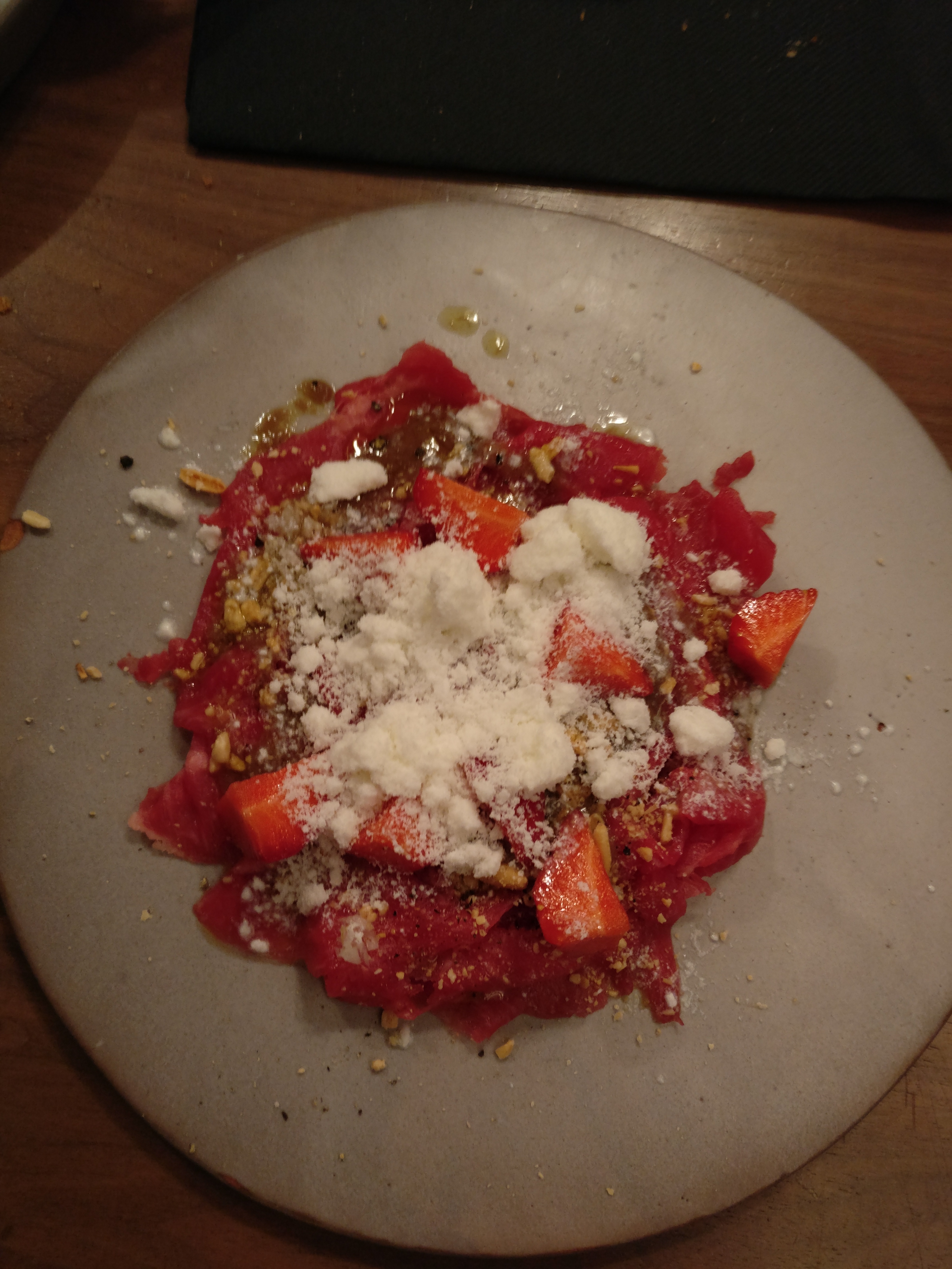 La nourriture était délicieuse. Le meilleur prosciutto de canard que j’ai eu (et j’en ai essayé plusieurs). C'est la première fois que j'essaie la cervelle de veau et j'ai adoré, elle était fraîche. Le tartare de bœuf au nori était également excellent. J'ai vraiment apprécié leurs vins au verre. Le personnel était sympathique, l'endroit est mignon, décoration/plafond amusant. Je pense aussi que les portions étaient de taille parfaite. Je rêverai probablement du prosciutto de canard.