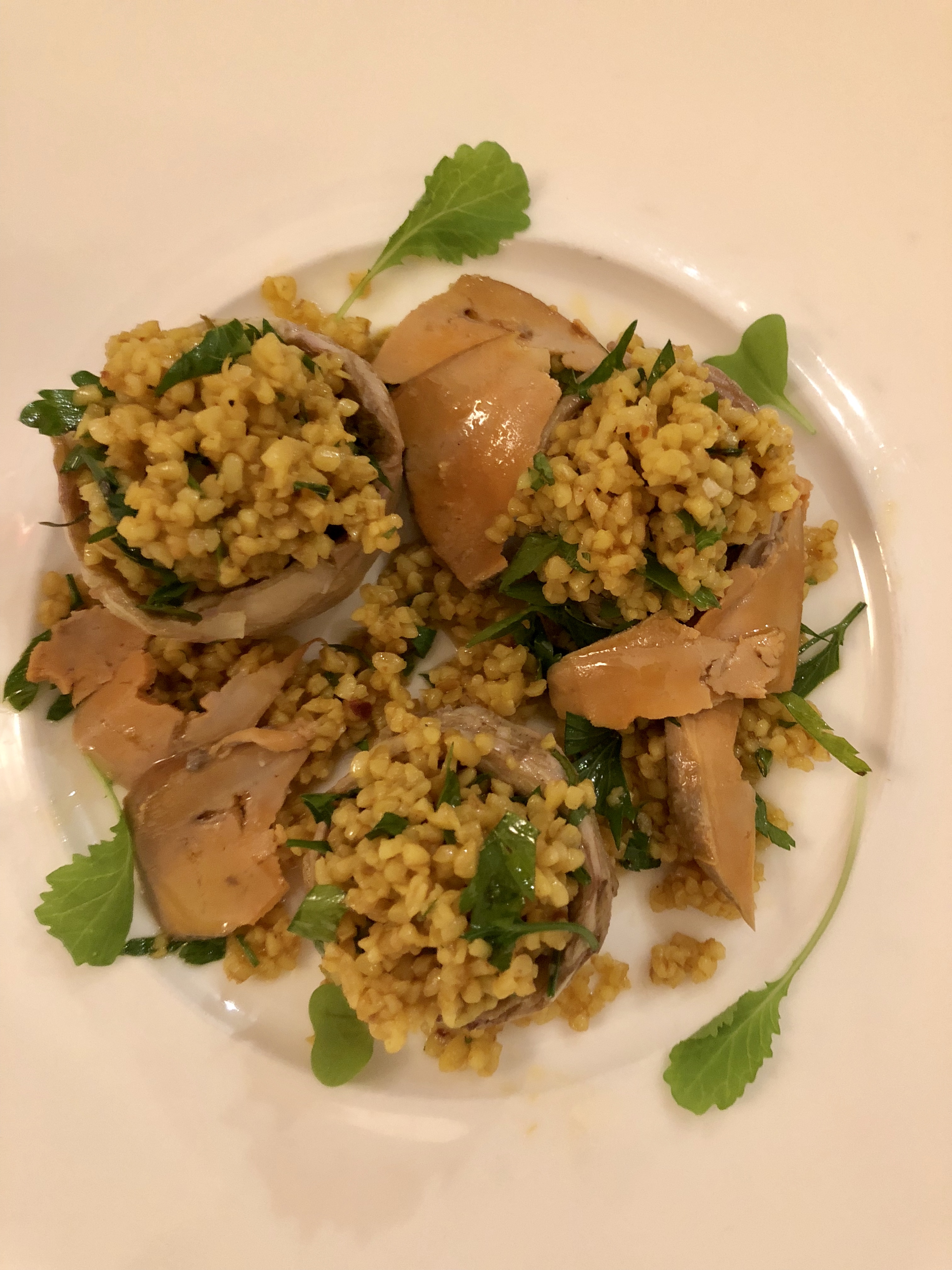 Échec complet! Carte des vins hors de prix, thon en entrée : conserves ouvertes ! dans l'assiette avec du pain pour 12€ Haricots marinés dans un petit bol avec du pain 10 € Sélection de plats principaux très médiocre. J'ai choisi du boulgour au curcuma, qui était servi dans l'assiette et garni de poivrons chauds et de légumes. 16 € / en fait un accompagnement pour moi Mon mari avait de la purée de céleri aux champignons pour son plat principal ! pour 18€ C'était l'un des rares plats chauds Dans l’ensemble décevant et déconseillé.