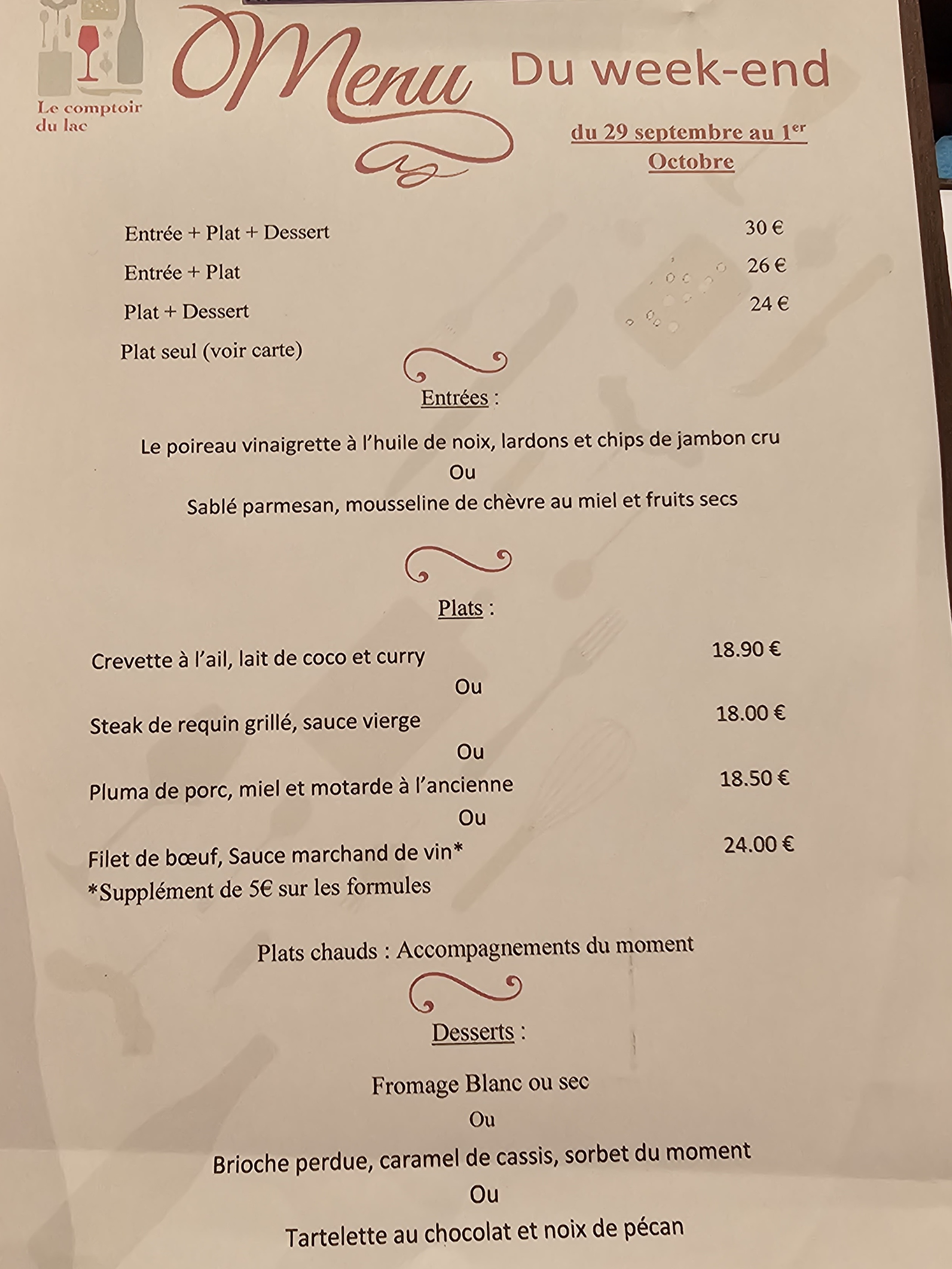 Le Comptoir du Lac propose des plats du jour pour les ouvriers à un tarif comparable au restaurants ouvriers avec une cuisine plutôt recherchée en regard du tarif et un service rapide. Il propose aussi une carte un peu plus gastronomique à un tarif plus que cohérent avec la qualité des mets proposés. Les vins, avec un caviste renommé, sont de très bonne qualité. En plus de la qualité de la cuisine française, il faut souligner l’accueil du personnel très soucieux de la satisfaction client. Merci à toute l’équipe, vous faites honneur à la gastronomie de notre pays.