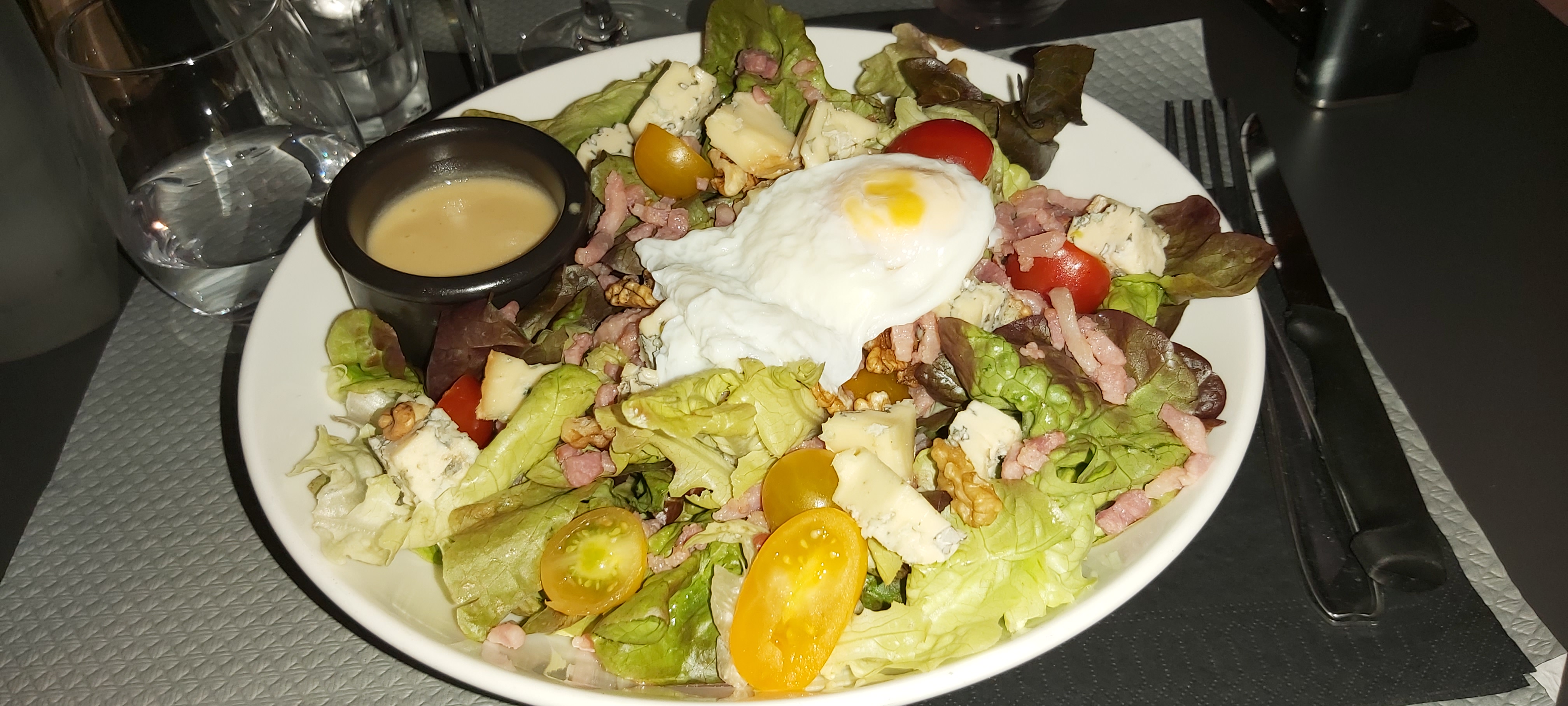 Accueil agréable et service rapide, salade du jour a 13 euros, très moyenne. Salade verte 1/2 oeuf, quelques tomates, lardons et croutons industriels, avec minis ravioles trop cuit et sans saveurs.