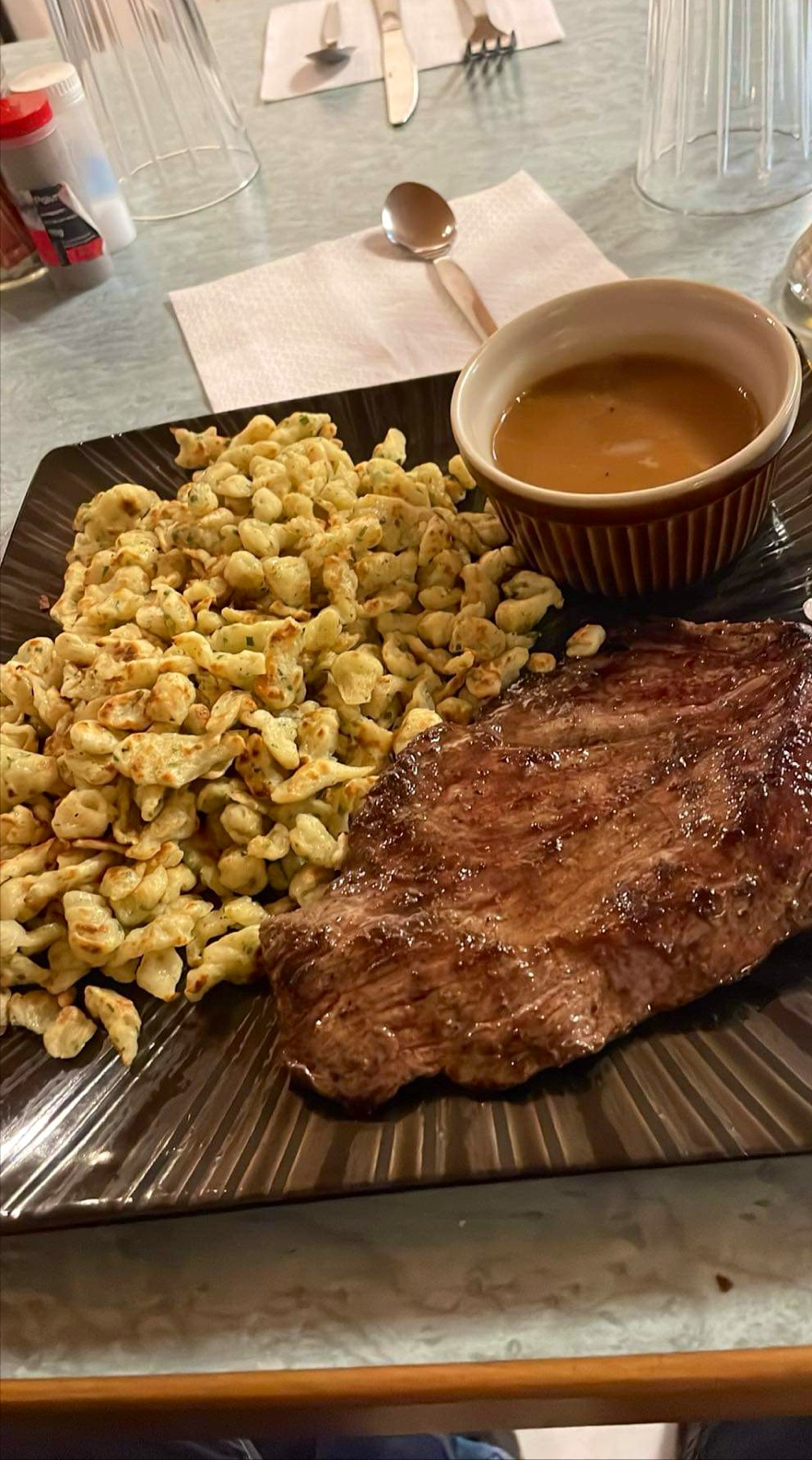 Nous étions de passage le week-end dernier et nous nous sommes arrêtés au restaurant. Malheureusement, nous avons dû attendre longtemps pour avoir notre nourriture. Mais ensuite, ça allait. Ce qui me dérangeait à l'extérieur, c'est que les projecteurs brillent toute la journée - la durabilité et la protection du climat devraient également être des points importants pour un restaurant aujourd'hui. Le personnel de service était très gentil. Mais je ne pense pas que je reviendrai.
