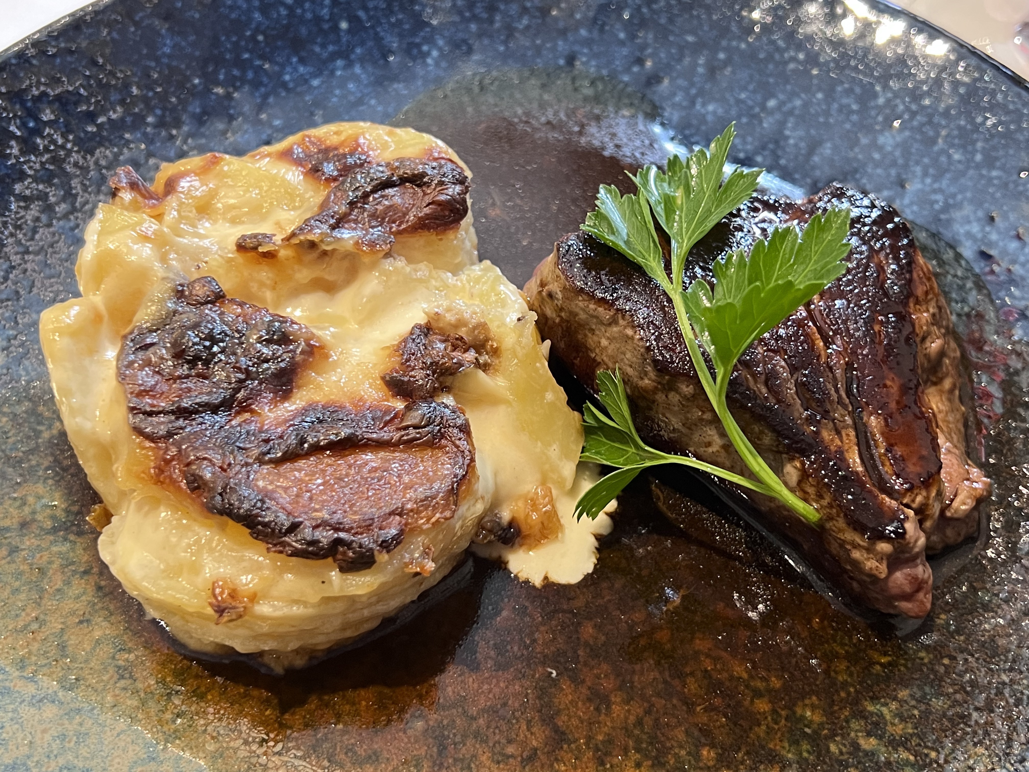Légèrement déçu par l'entrée. Nous avons pris le sablé avec le jambon Serrano qui était correct mais sans plus. Très content du plat. Le filet de bœuf était excellent. Cuit parfaitement avec un dessus croustillant. Recommande grandement. L'accompagnement pomme de terre au Brie était aussi très bonne mais légèrement fort en fromage. L'entrecôte et son accompagnement étaient aussi très bons. Le dessert était bon. Le tiramisu était très volumineux et nuageux avec un gout léger de biscuit café. Le fondant au chocolat était bien coulant, tout chaud avec un bon goût de chocolat qui se marie bien avec son accompagnement fromage blanc glacé. Je recommande le lieu pour un diner sympathique un petit peu haut de gamme. Tarif légèrement élevé mais justifié par la qualité.