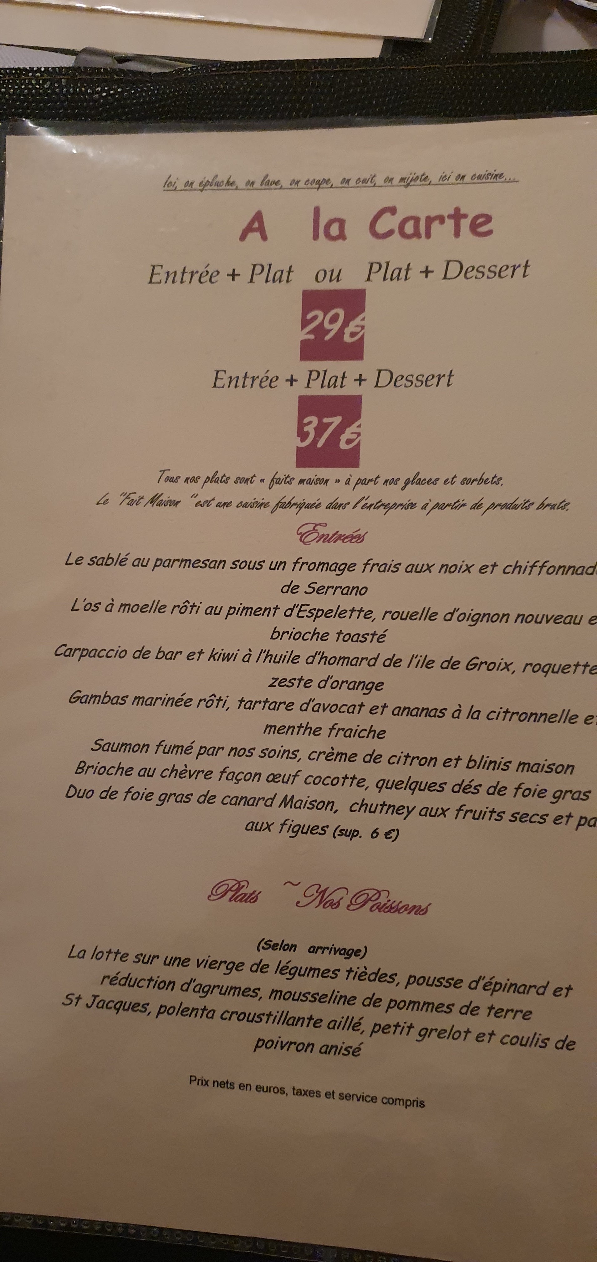 Un menu avec choix important , de qualité et fait maison ,un délice de l entrée du plat principal au dessert. Vraiment à conseiller, mais attention il faut réserver car ce restaurant est très demandé. Nos amis que l' on avait invités Ont été ravi. Au plaisir de revenir