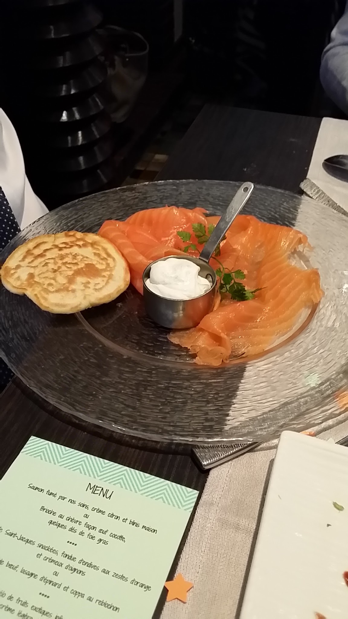 Nous adorons ce restaurant dans lequel nous allons au moins 2 fois par an. Le saumon fumé maison est particulièrement excellent, et les plats et desserts sont de bonne qualité. Une petite déception récemment sur le carpaccio de Saint Jacques avec citron caviar: les grains étaient petits et secs, et le plat manquait d'assaisonnement.