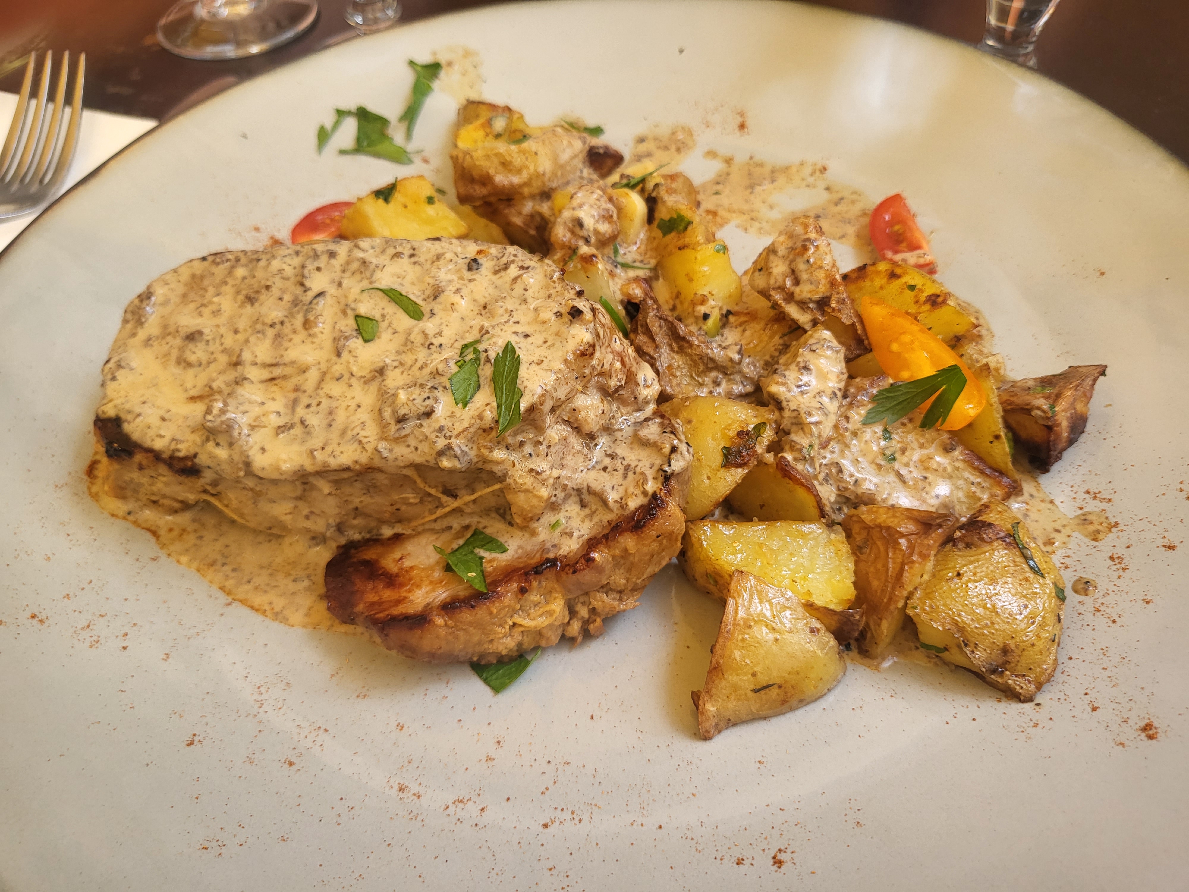 Nous avons mangé des raviolis aux truffes et un demi-litre d'eau minérale gazeuse. La nourriture avait le goût d'un plat cuisiné, la sauce de bouillon de cubes, mais pas de truffe. Avec 22 € la portion et 5 € l'eau complètement hors de prix. A côté, les raviolis aux truffes sont bien meilleurs, moins chers et le service est plus chaleureux.