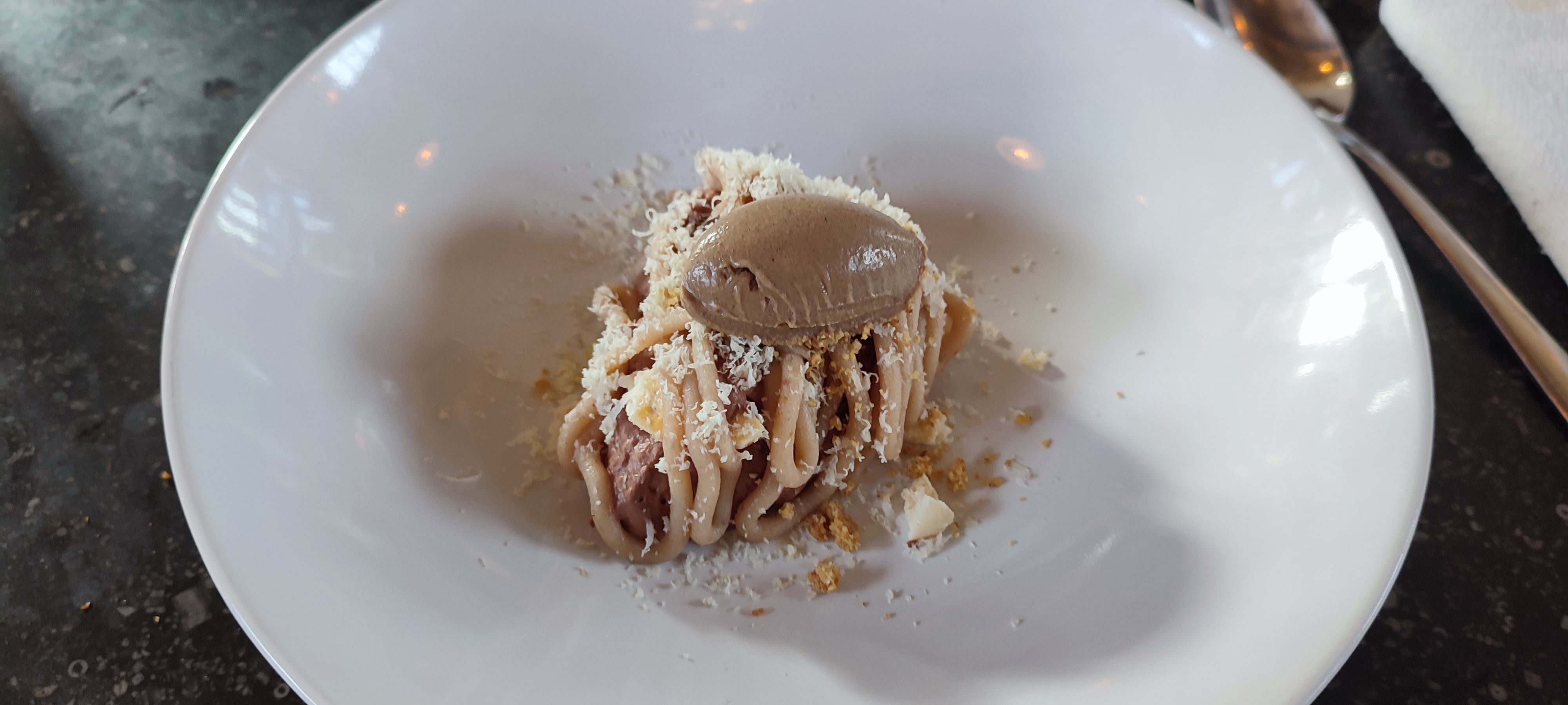 hall d’entrepôt mis en valeur, accueil inexistant, malgré la chaleur bouteille de champagne posé sur la table servi sans mise en bouche. haricots vert crus , 1 cuillère de glace au café cachée derriere 2 tuiles.... nous dirons que ce n'etait pas notre jour! avis sur fait et tres cher pour ce que c'est. nous n'y retournerons pas.