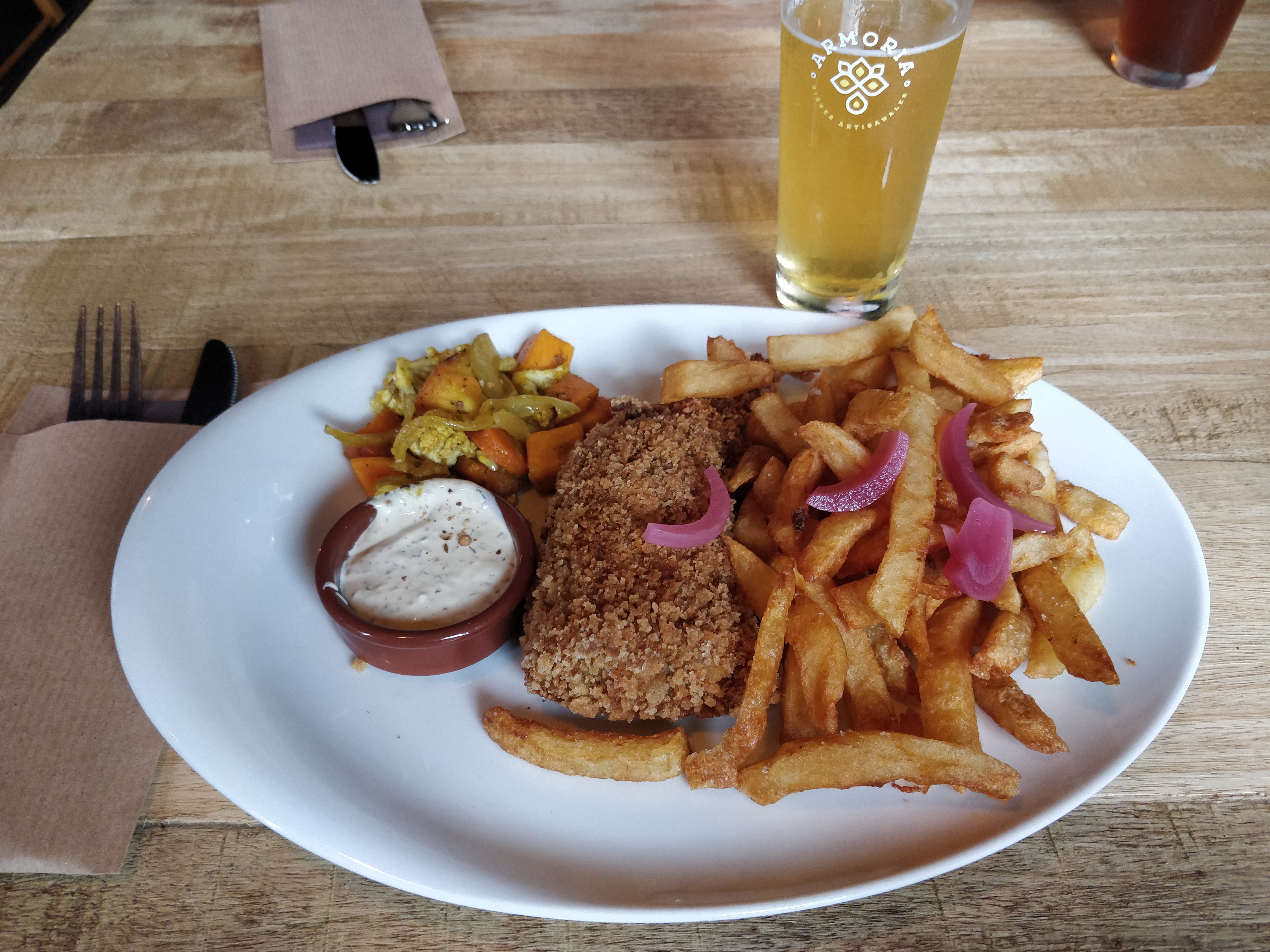 Restaurant très agréable, avec le port juste à côté. Le Fish and chips vaut vraiment de détour avec un poisson délicieux et une panure aux graines qui apporte un super goût. Les moules sont servies dans une marmite pleine à ras bord. Que dire du Kouign-amann revisité qui est tout simplement FABULEUX ! léger et très gouteux.