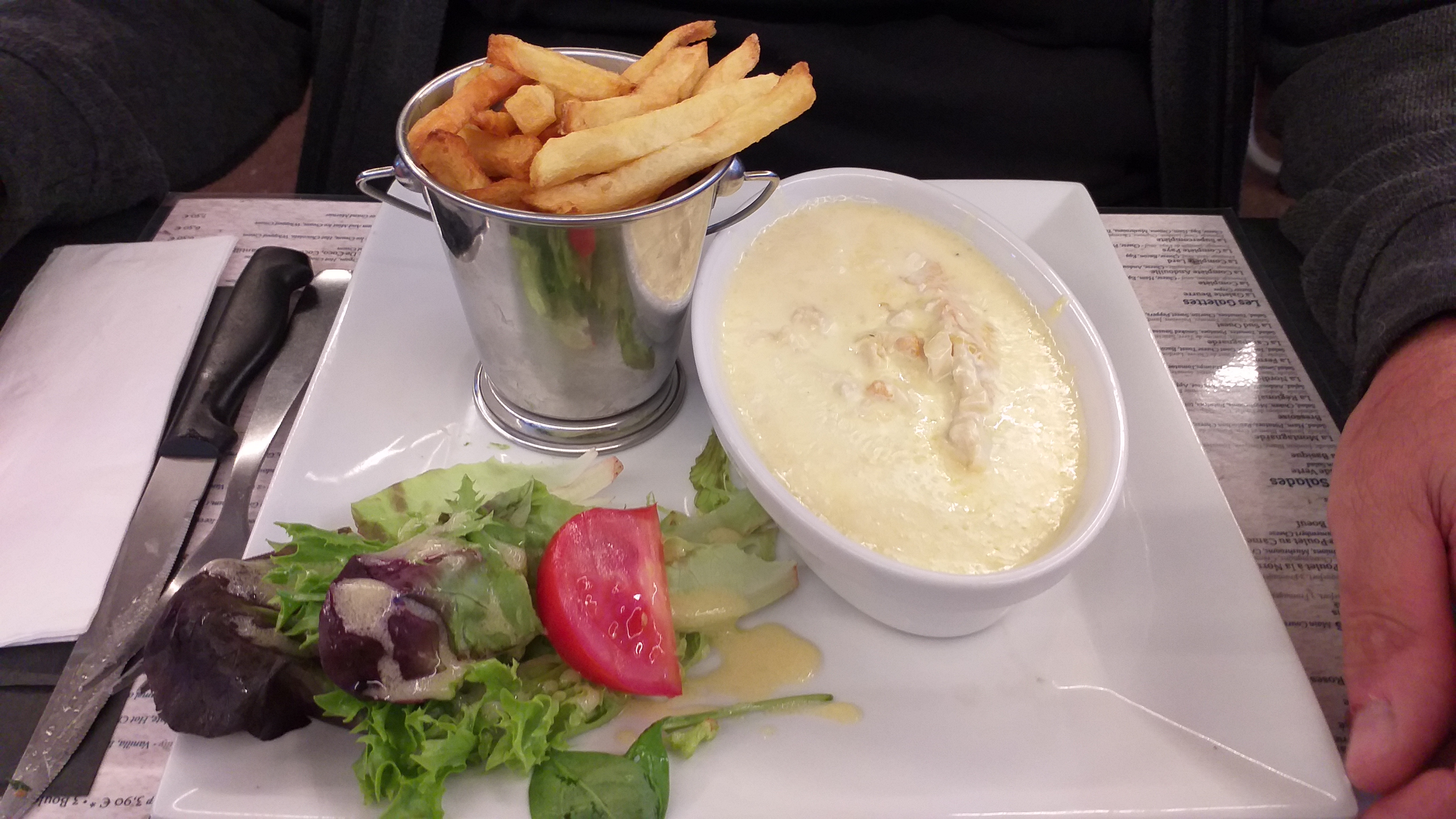Acceuilli par une jeune fille un peu perdu mais situation vite rétablie puis installés . Bonnes moules aux saveurs originales et avec de vraies frittes maison ! Desserts bien , petit bémol je dirai la salle extérieur devient bruyante dès qu' il y a un peu de monde. Agréable repas merci