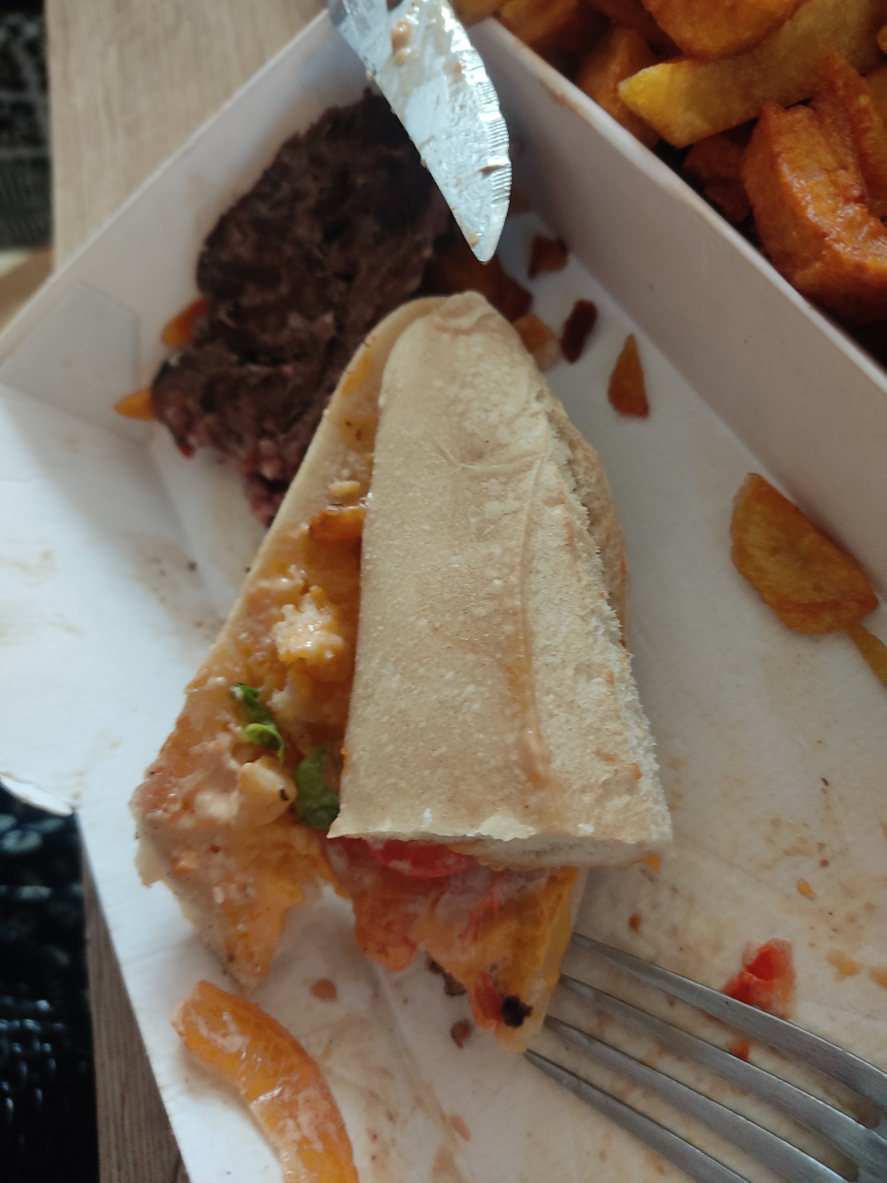 Bonsoir, Commande à emporter, mon avis est partagé : américain ; très bon steack, frite maison etc mais pain industriel, kebab à 7 euros, portion bien trop petite par rapport à d'autres enseignes et pas très goûteux. A contrario, panini fromage parfait, steack parfait, frite ok. Je penses qu'un équilibre devrait être revu car il y a des produits de qualités et d'autres moindre. Au niveau des portions c'est pareil, petite et grande portion sans grande différence ( pizza et kebab). Très bon burger ! Merci pour votre ponctualité et votre gentillesse. Bonne soirée et bon courage.