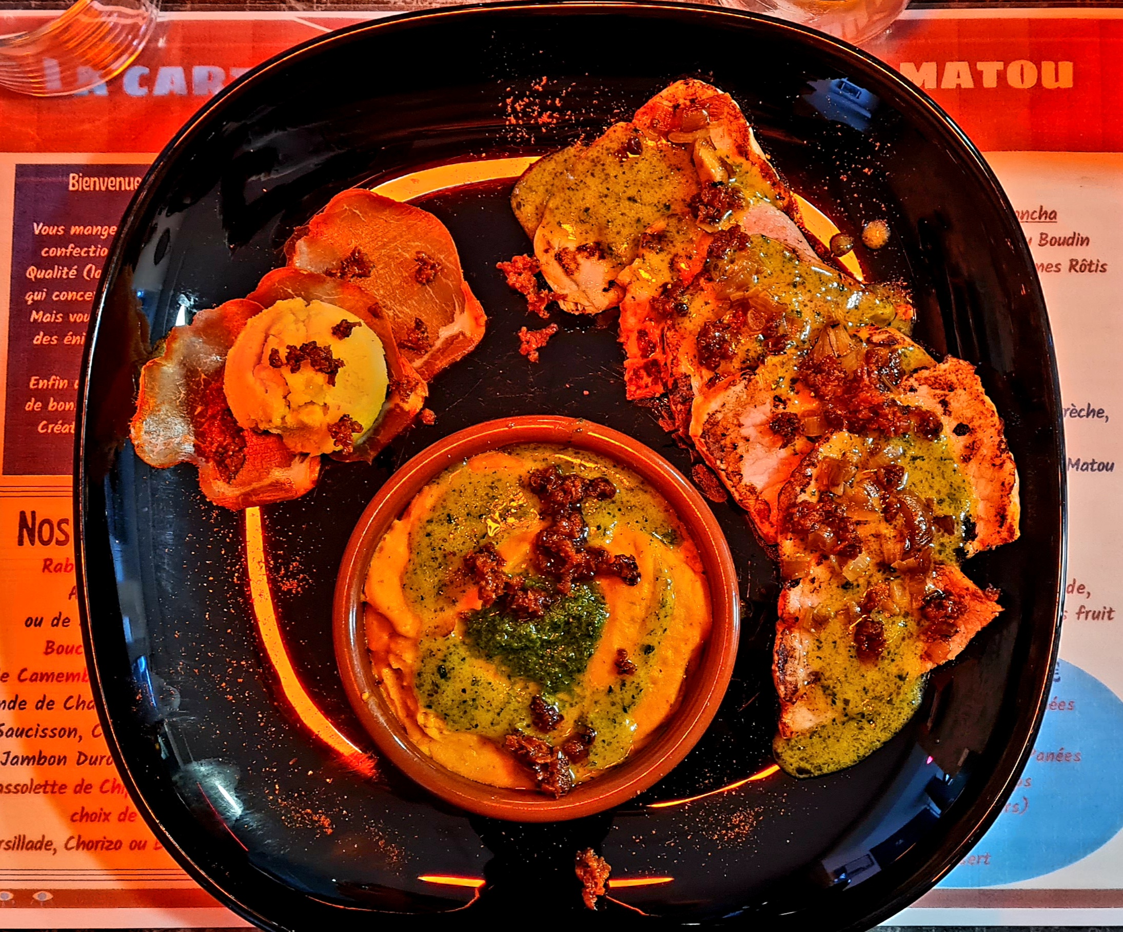Très bon moment au Matou, les plats sont joliment présentés et on sent la qualité des produits. La déco chinée à droite et à gauche fait le charme du Matou. Les patrons sont adorables. Vivement la prochaine fois pour élucider le inside game 🤔 très belle réussite à vous !!