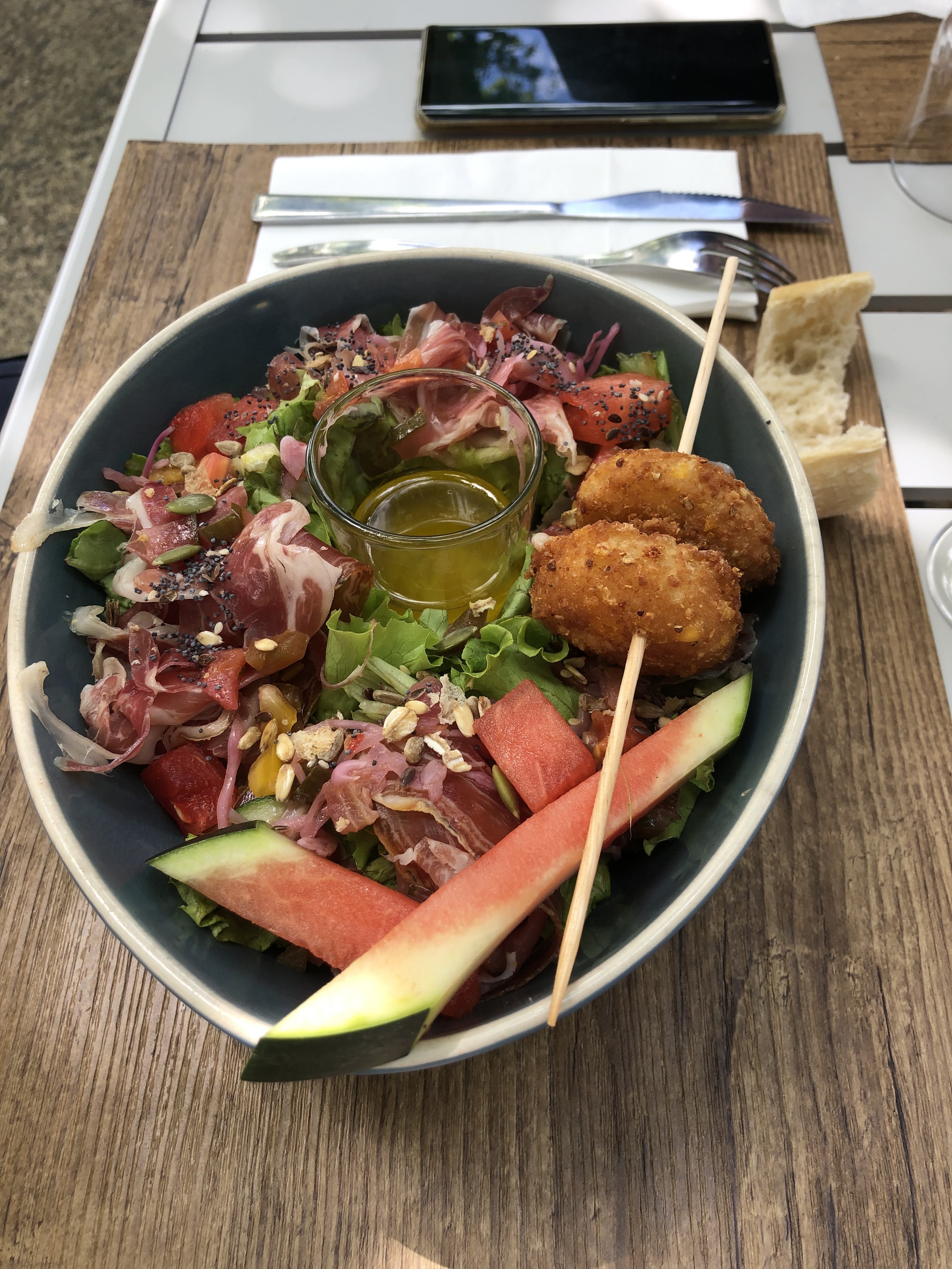 Superbe terrasse à l‘ombre, accueil exceptionnel en août, cuisine succulente avec de vrais bons produits qui ont du goût et enfin, des patrons hyper sympas, pas du tout des commerçants dans le mauvais sens du terme 🤔🤔🤔… Bravo à toute l’équipe, je recommande vivement ( 2 visites en 1 semaine 😉 ça veut tout dire 😃
