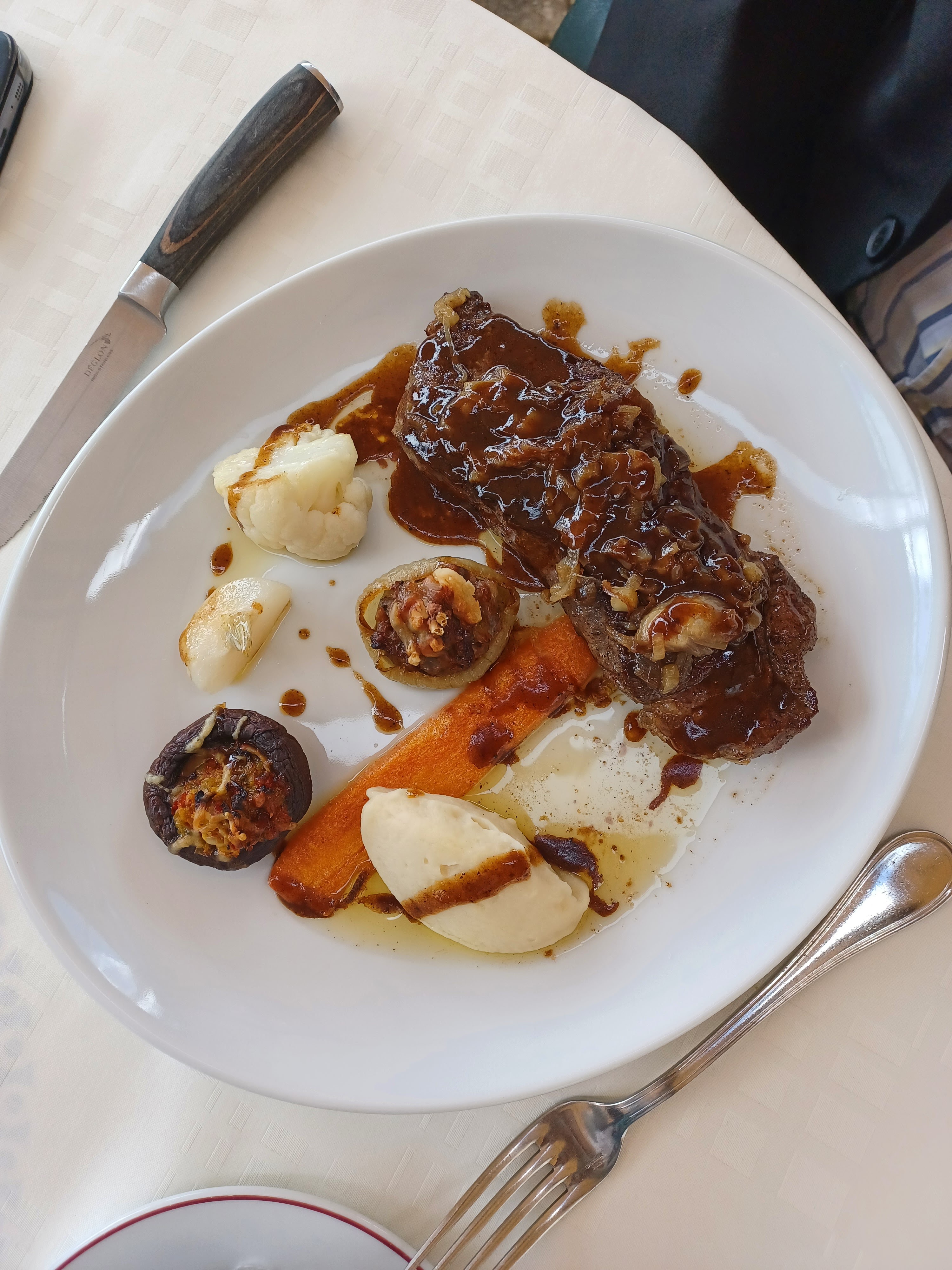 Succulent, assiettes copieuses et les denrées y sont mises en valeur. Amuses bouches et petites douceurs offerts en fin de repas Nous avons été servis et reçus chaleureusement même à 13h20😉 ce jour.