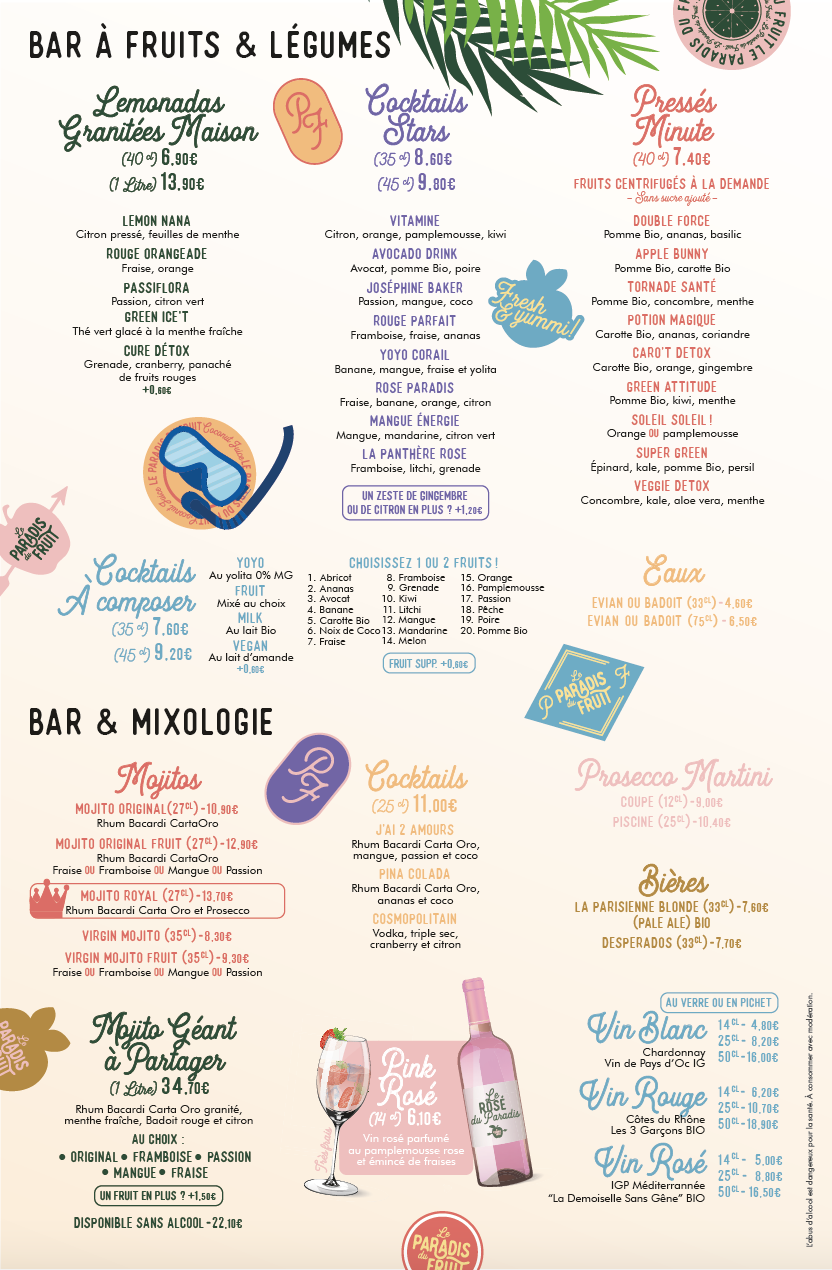 Posté le 22/08/2019 à 13:26"Un Paradis du Fruit hors du commun avec son décor tropical. 🌴 Palmiers, plantes, mobilier comme aux tropiques c’est dépaysant. Embarquement immédiat vers le soleil ☀️ Le personnel est très agréable et souriant. Les distanciations sociales sont respectées, un gel hydroalcoolique est mis à disposition sur chaque table. Nous avons été servis rapidement, les plats sont bien présentés et les cocktails sont à tomber. 🍹 Je recommande!"