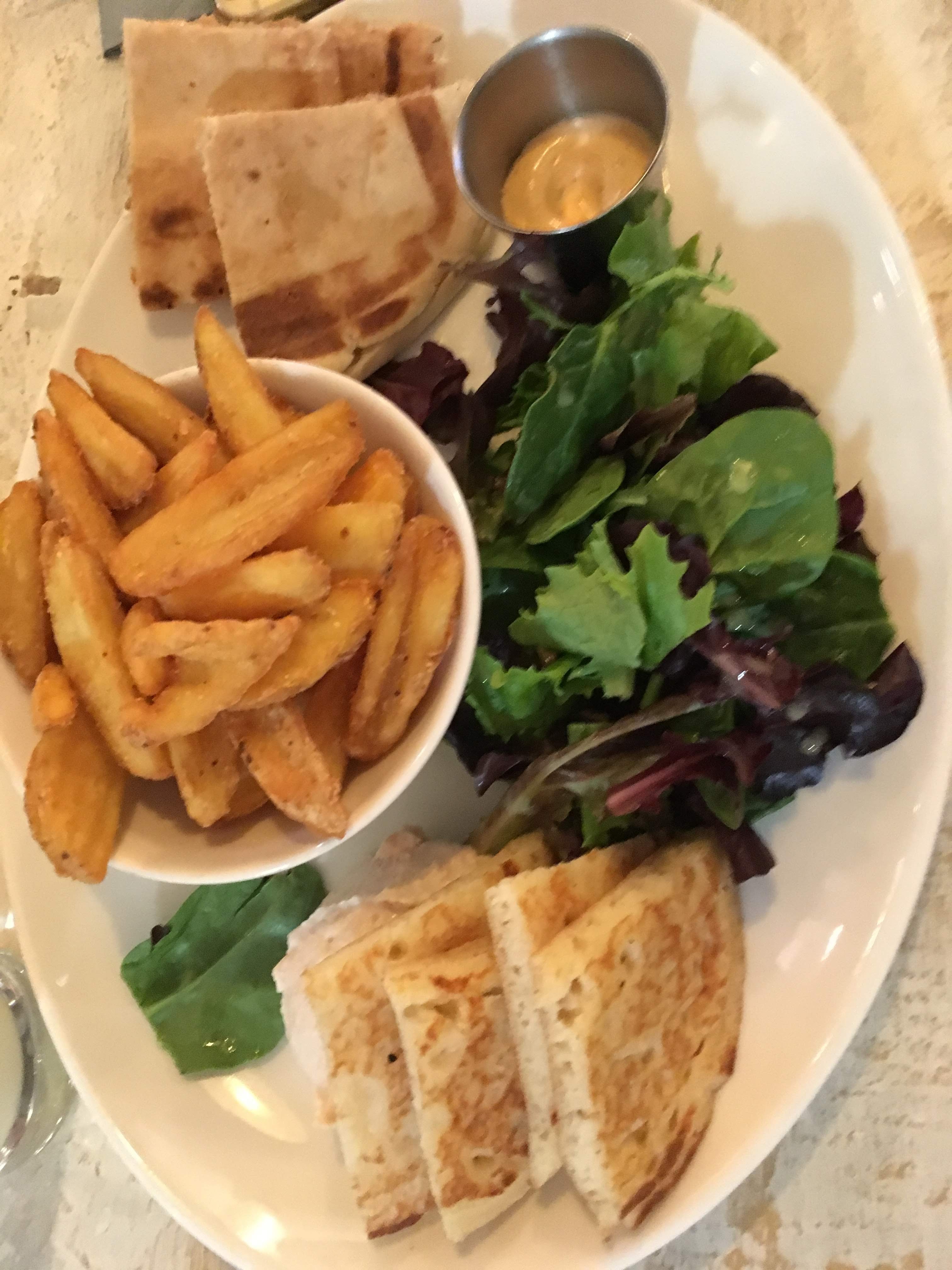 Bof bof...on a pris un plateau avec plusieurs petites choses à manger, avec coleslaw (mal assaisonné et avec des raisins secs beurk) et frites (avec une sauce au cumin...😕).. mon tout petit demi avocat avec une sauce pas bonne, tenders pas mal, brochettes poulets, tartinables de thon avec blinis (ça passe..)... J ai par contre adoré les triangle de camembert frits, et la limonade maison passion citron vert ! En fait c est assez inégal suivant ce que l on prend.. Déco sympa, service amabilité au minimum... Bref ..C est une chaîne, on peut pas en attendre grand chose d exceptionnel...