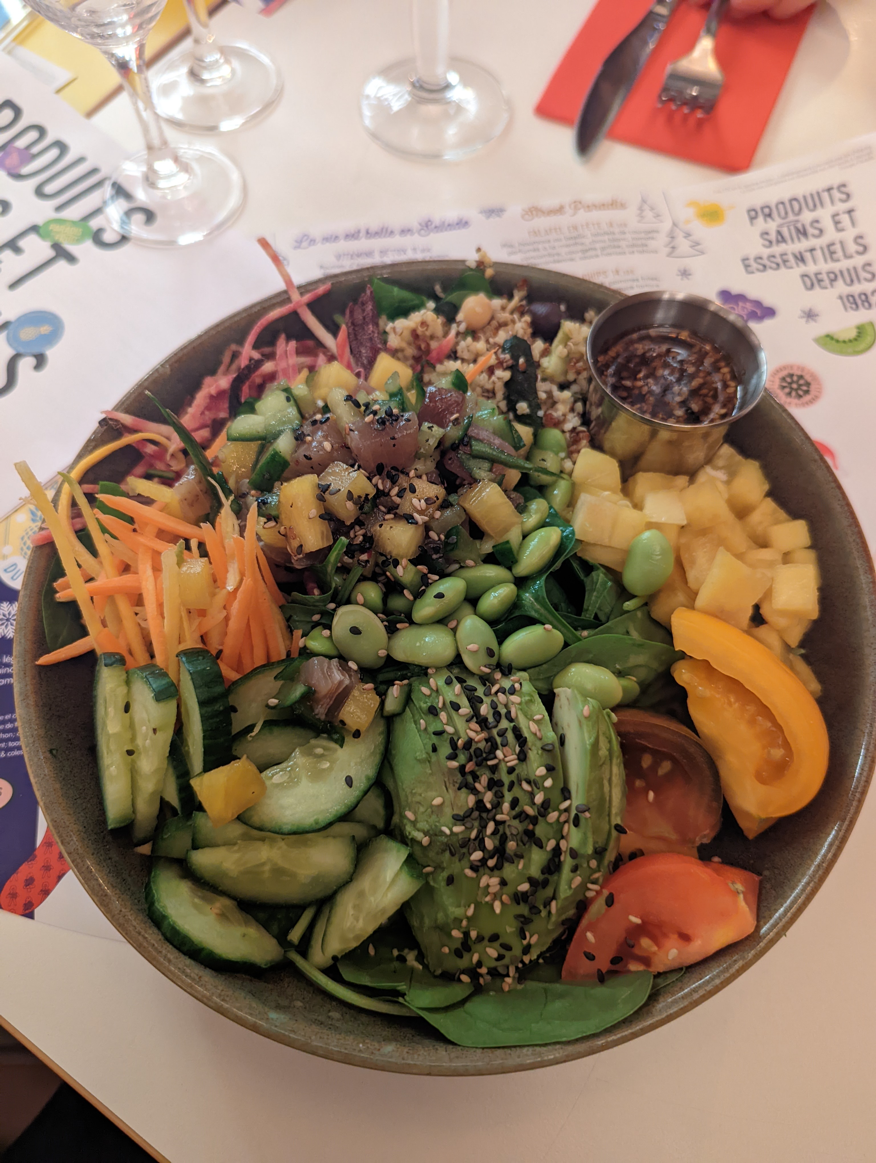 Visite ce mardi soir d'été car cela faisait tellement longtemps, je voulais revivre une expérience paradis....déçue, j'aurais du rester sur mes souvenirs. Ce n'est pas un restaurant mais bien un fast-food fruit&juice. Hygiène : Verres sales plein de traces ( heureusement une serveuse professionnelle et bienveillante, nous a donné de nouveaux verres propres) Le barman qui fait tomber la bouteille de sauce au sol la remet sur le bar dans la nettoyer, un autre qui ne portait pas son masque. Les plats sont corrects et généreux. pour les carnivores, vous trouverez votre bonheur, la carte est également composée de hamburger boeuf... Je n'ai pas souhaité continuer mon expérience en dégustant une coupe de glace mais elles avaient l'air satisfaisantes.
