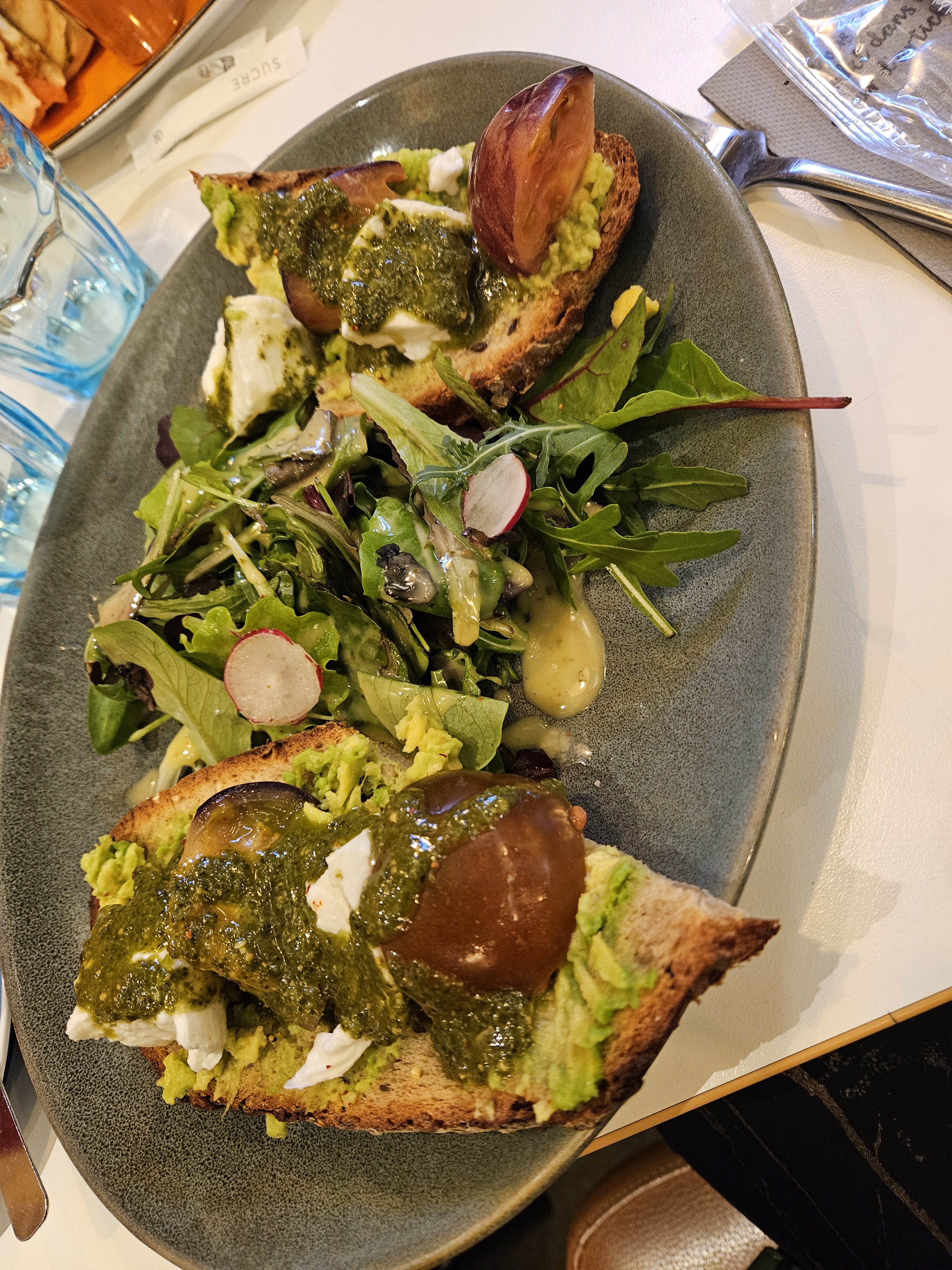 Restaurant à la déco sympa, bien aménagé et terrasse du fond où nous nous sommes installées agréable. Cependant service très en dessous, 10min pour essuyer la table et 50min d’attente pour venir prendre notre commande. Comment vous dire ma déception, on a fait l’impasse sur le dessert puisque ça nous a tout décalé. Pourtant j’attendais avec impatience la touche sucrée. Personnel dépassé et loin d’être dans l’empathie ou la satisfaction client 😳 La salade pas terrible, fade pour ce prix, plus de verdure qu’autre chose. Lorsqu’on voit le plat on se dit super mais tout est à la surface. J’ai laissé les 3/4 dans l’assiette.