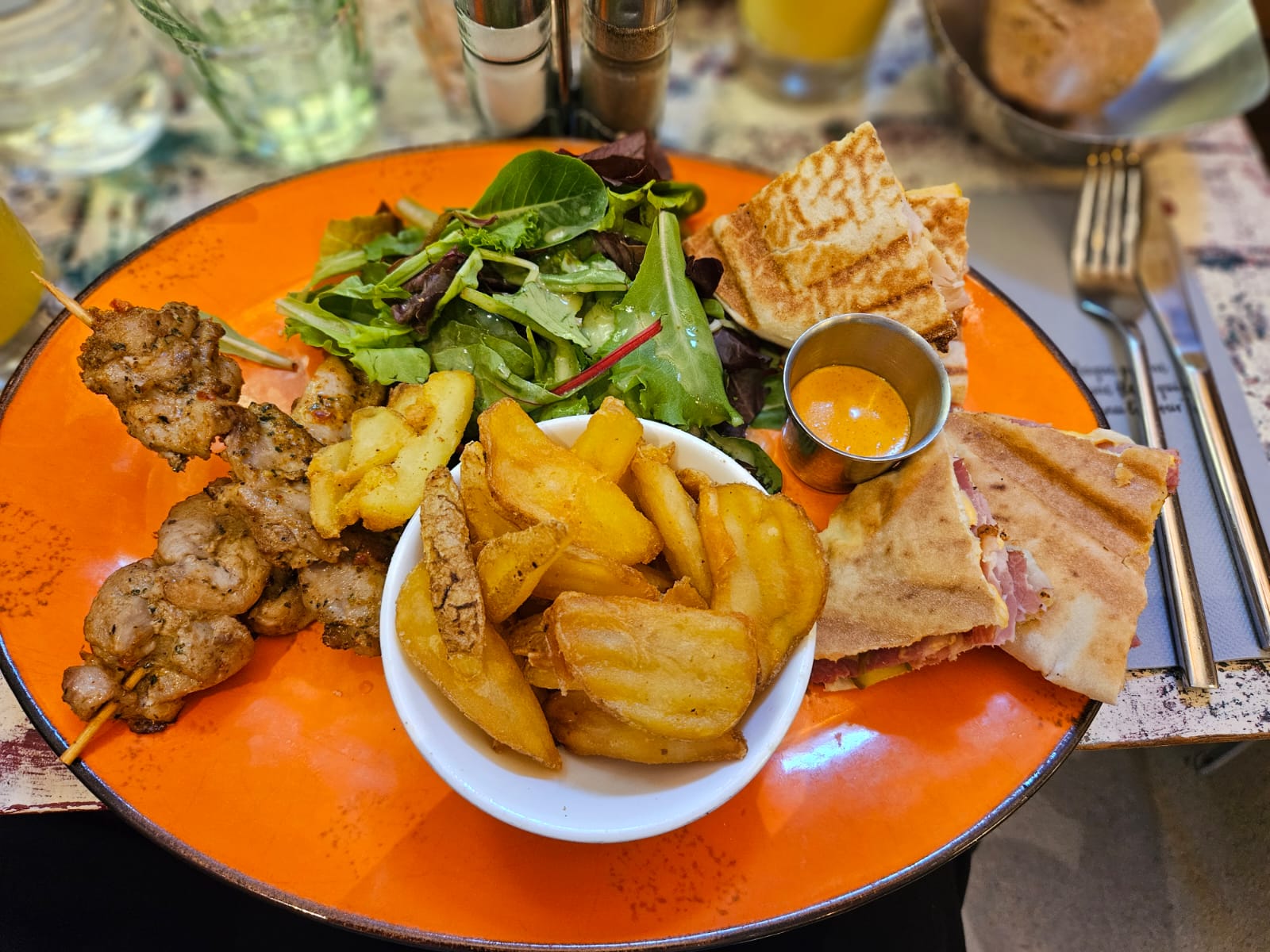 Les plats sont originaux et agréables. Personnel et concept sympathiques ! Les tarifs sont très corrects. J'ai testé les pitas avec les crevettes, accompagnés de la plancha de légume et les champignons de Paris. Service très rapide. Je recommande, parfait après ou avant une séance de cinéma.