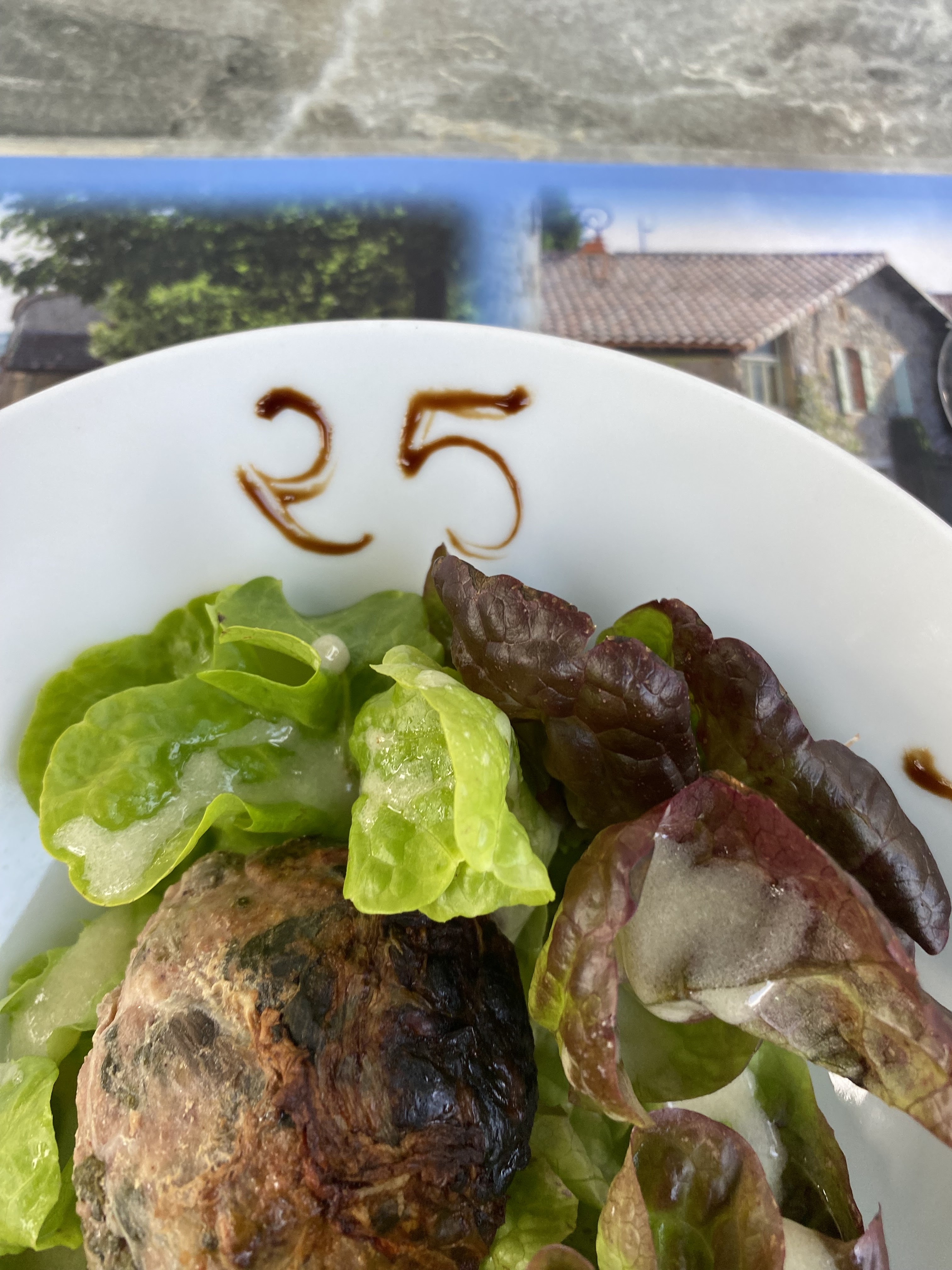 Nous ne nous sommes pas régalés. Au menu, assiette campagnarde à 14€ : 3 feuilles de salade 3 rondelles de radis (pas 4) et de la betterave râpée, sur le côté un cercle de parmentier de volaille. En réalité la volaille s'est envolée,ne restait qu'un écrasé de pommes de terre et carottes... le tout servi avec du pain rassi. Nous avons stoppé là notre repas. Pour info la suite, on nous propose : assiette de fromage à 6€ 1/4 de st. Marcellin et 1/4 de st Félicien. Dessert à 6€ : une Demi pêche pochée au vin surmonté d'une chantilly.