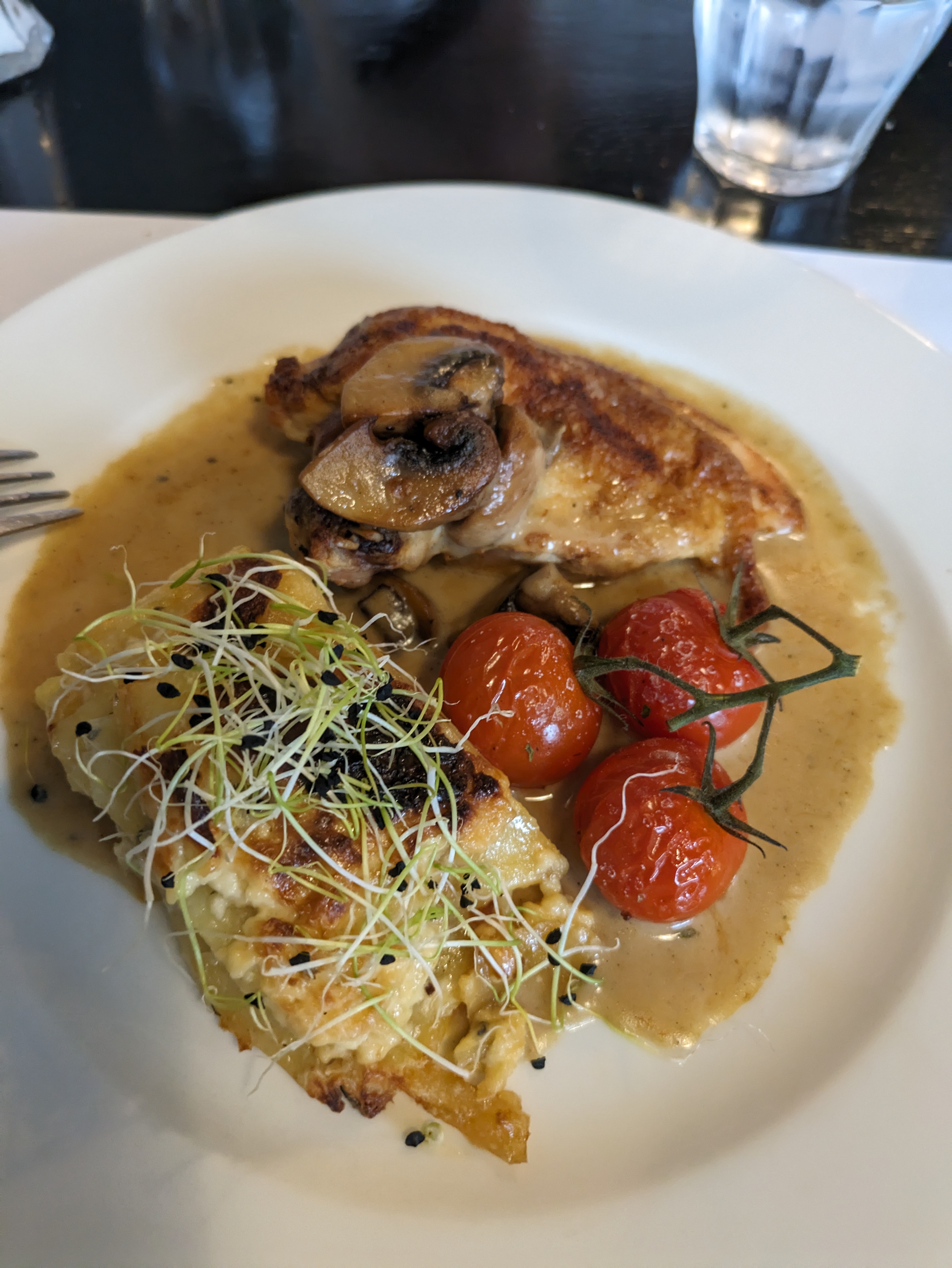 Beau restaurant avec un excellent menu. Nous avons eu un bon déjeuner, la nourriture était vraiment fantastique et nous reviendrons. Il faudrait davantage de plats végétariens au menu, notamment pour les plats principaux cuits/chauds (par exemple la tarte aux courgettes ou les paquets de chèvre au miel que j'y ai déjà mangés en entrée). Le service pourrait être un peu plus attentif car on ne nous a donné qu'un verre d'eau et de cidre. Chien amical.