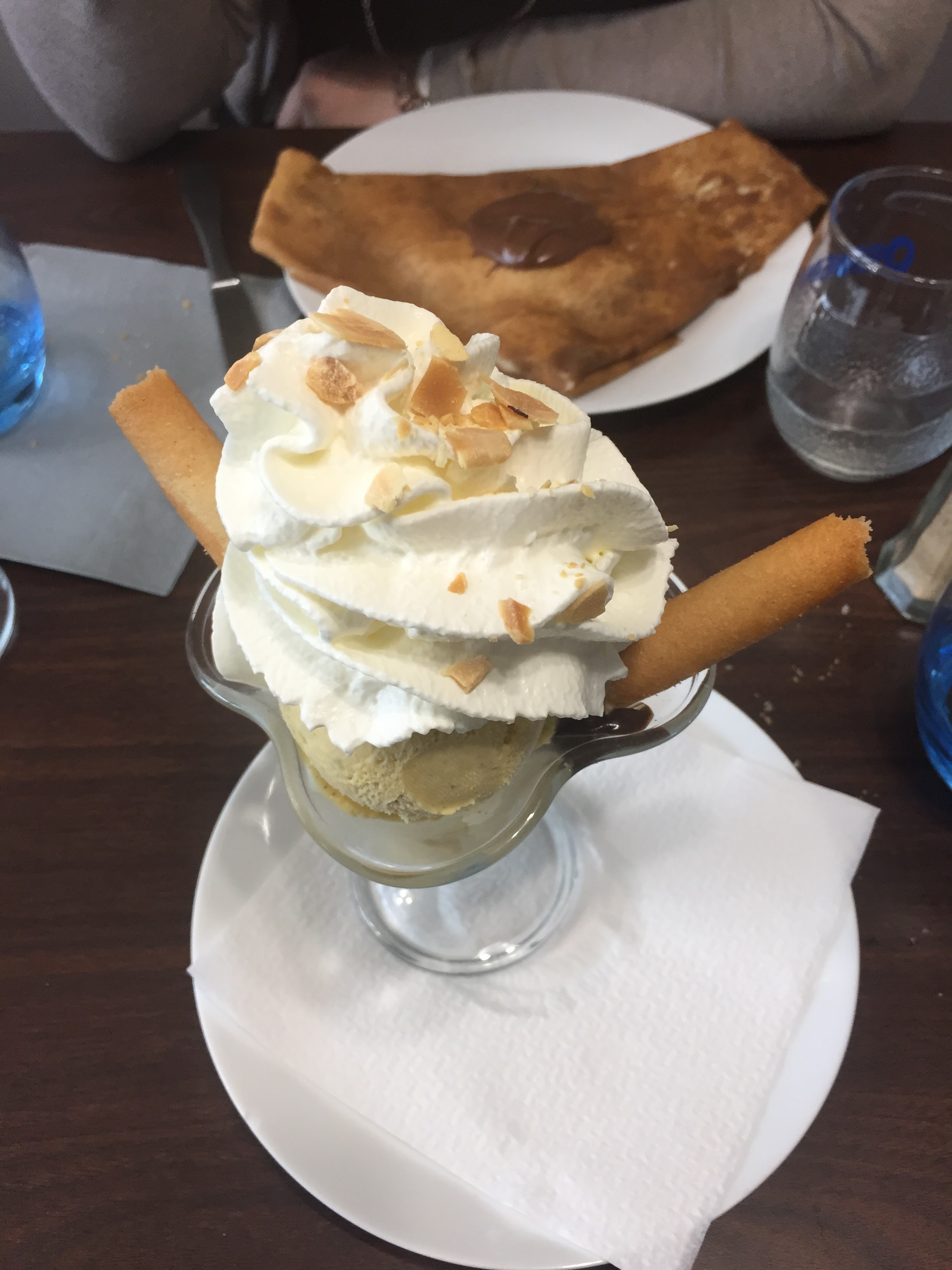 L'emplacement de la terrasse est idéal, avec sa vue sur la mer. Le service est agréable même si les serveuses semblent débordées (il y a l'air d'y avoir toujours beaucoup de monde !). Nous sommes venues pour une collation qui était simple mais bonne (crêpe et gaufre).