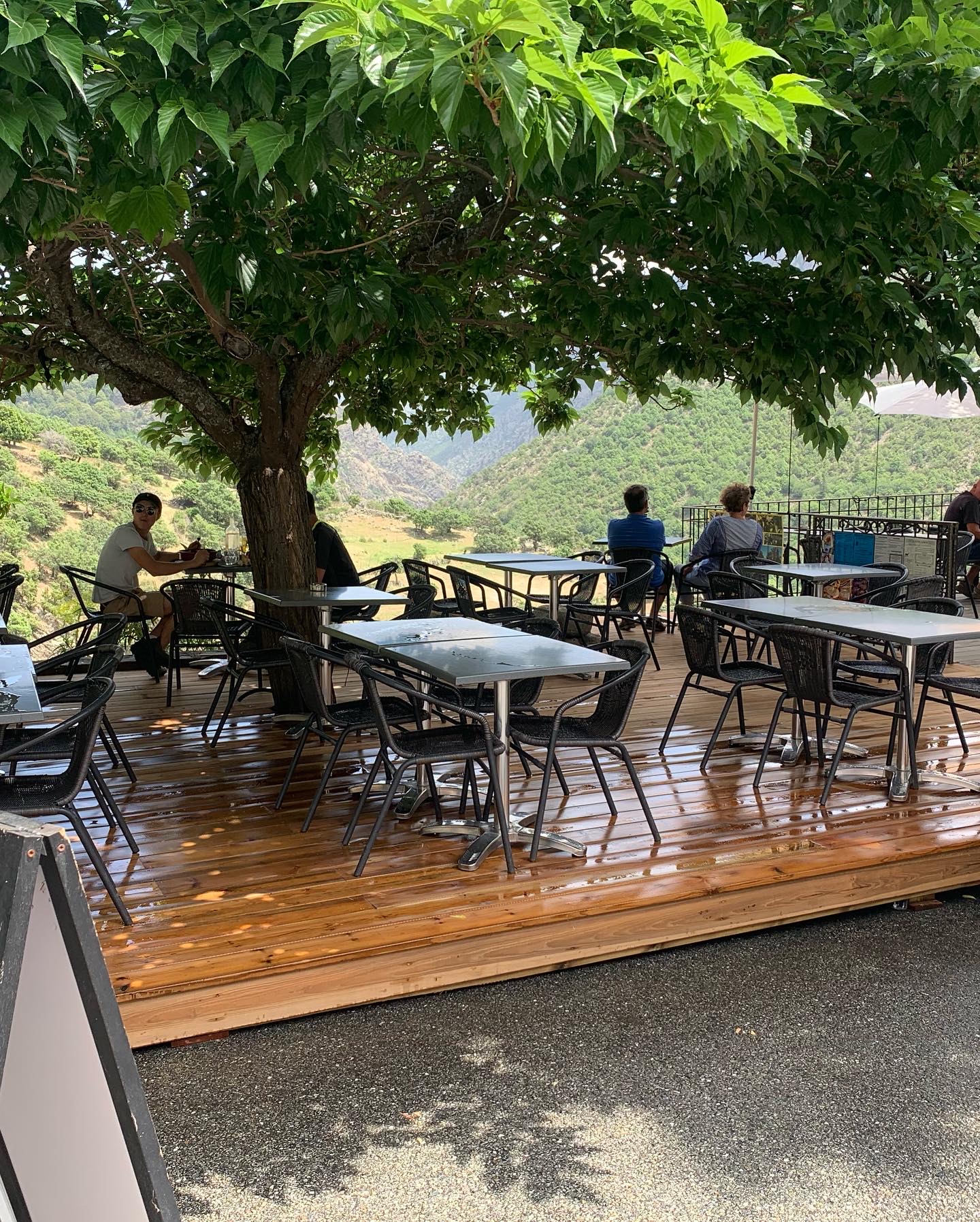 Petit coin d'ombre sous un arbre, vue sur la vallée, bonne cuisine bien locale et maison, service agréable, un super moment passé sur cette terrasse