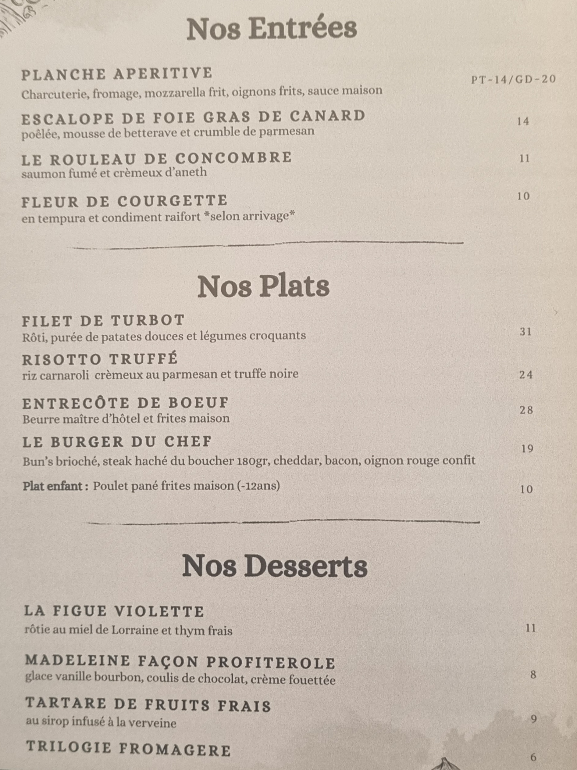 Carte limité à 3 ou 4 entrées et plats mais c'est très bien. La cuisine est excellente. Dommage qui n'y ai pas de café gourmand et que l'on puisse pas prendre de vin au pichet c'est que au verre c'est vraiment les seul reproches que j'ai à faire. Service très bien