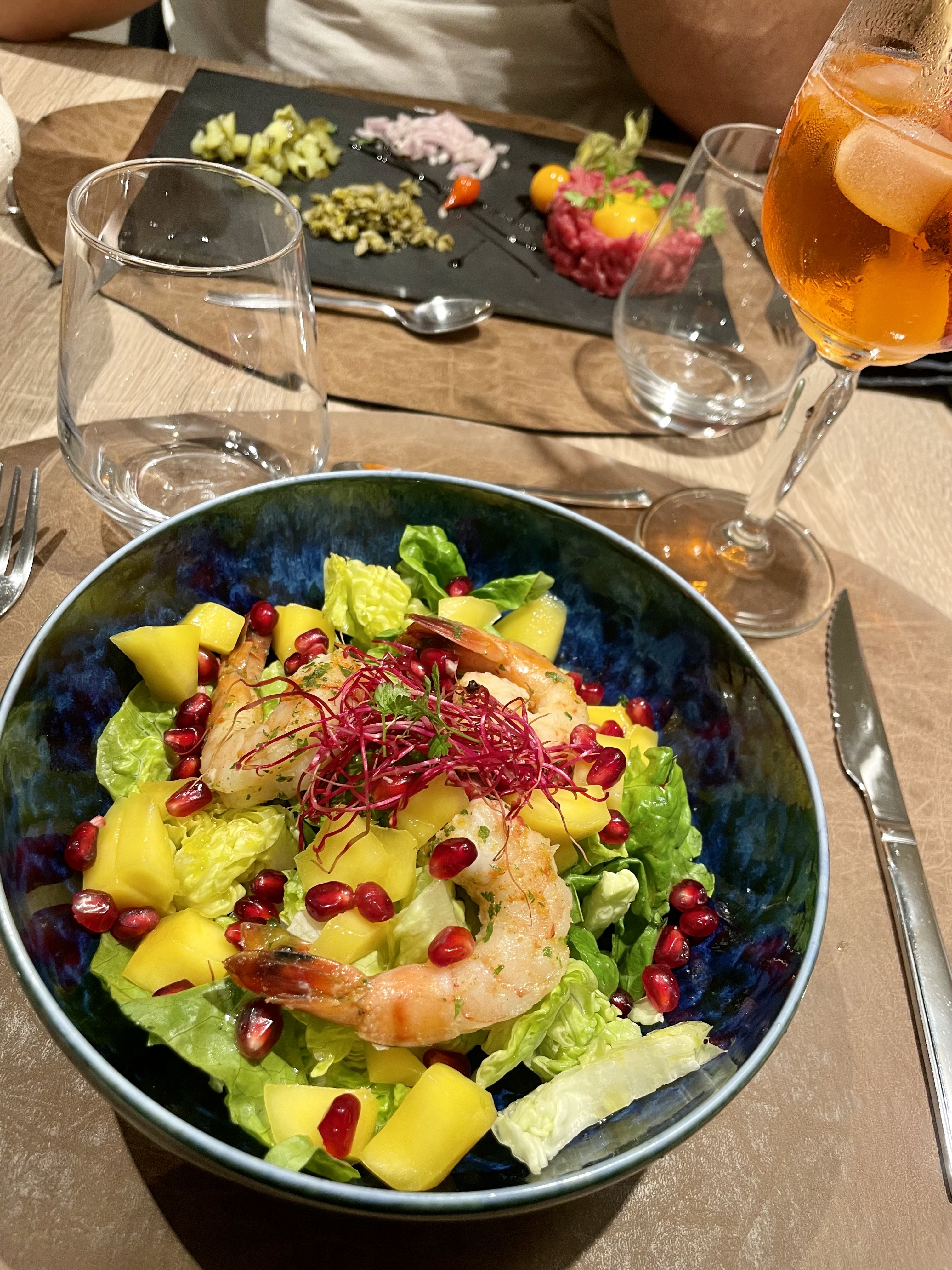 Ravis et encouragés par les avis positifs, nous réservons deux couverts dans ce nouveau restaurant. - 1 heure 10 après notre arrivée, on nous apporte enfin la carte. Je passe sur les temps d’attente … Enfin, l’entrée arrive, jolie, colorée, appétissante. Mangue rôtie pas mûre du tout, mais le saumon est bien bon. Encore un bon temps d’attente avant le plat. Petite portion de poisson avec une sauce qui manque de goût. Pas de dessert ni café, on paye, on part. Et voilà ! Dommage ! Je sais que le personnel n’a que deux bras. On est tous fait sur le même modèle ! Mais, faire poireauter les clients à ce point, non.