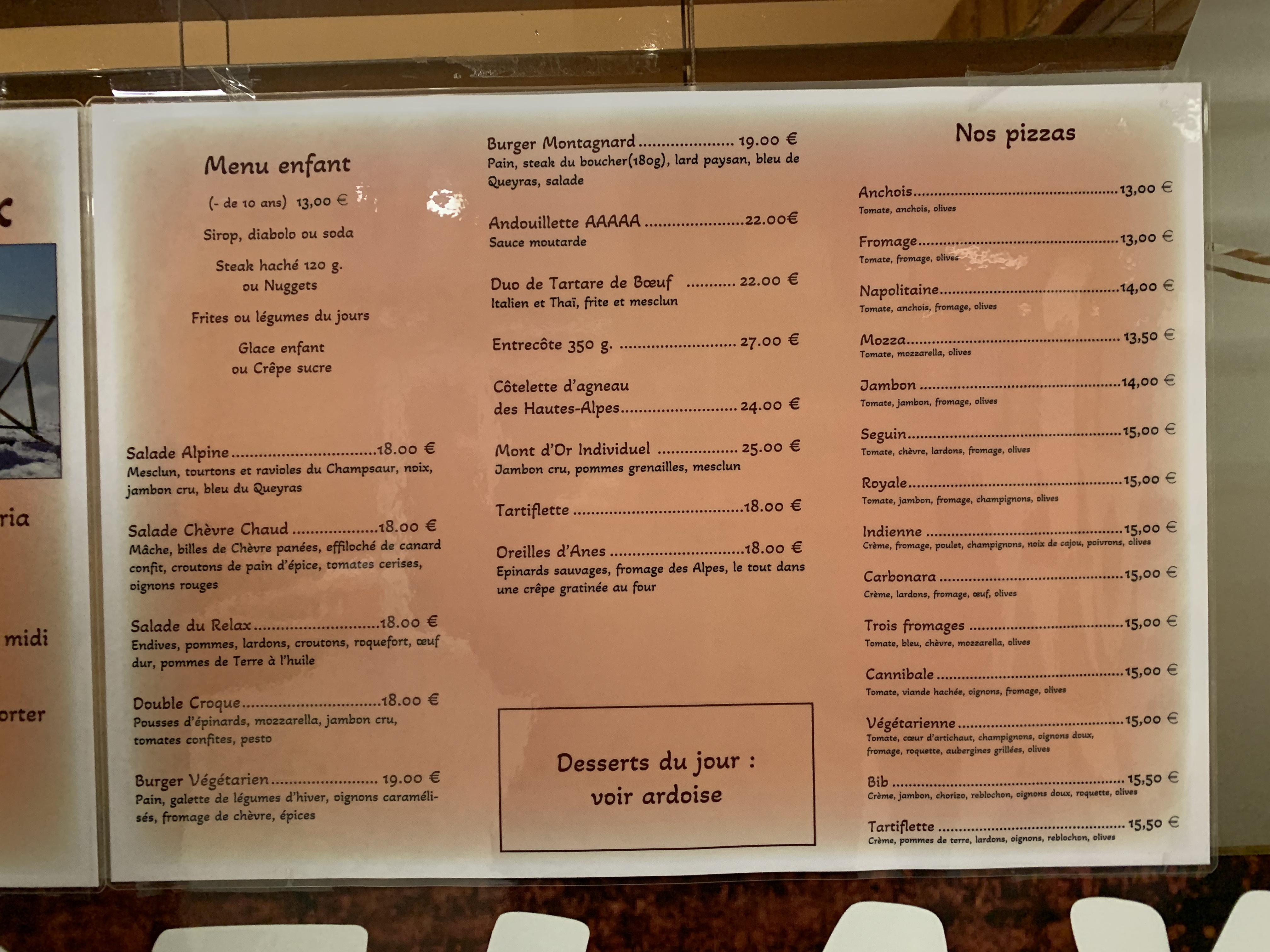 SUPERBE !! pizza à la pâte fine avec une belle couche de garniture. Petit plats succulent et dessert mais parfait ! serveur au top super chaleureux et accueillant.} Contrairement à ce que dise certains avis, les prix sont raisonnable. restaurant qui vaut le coup sur vars 👌👌