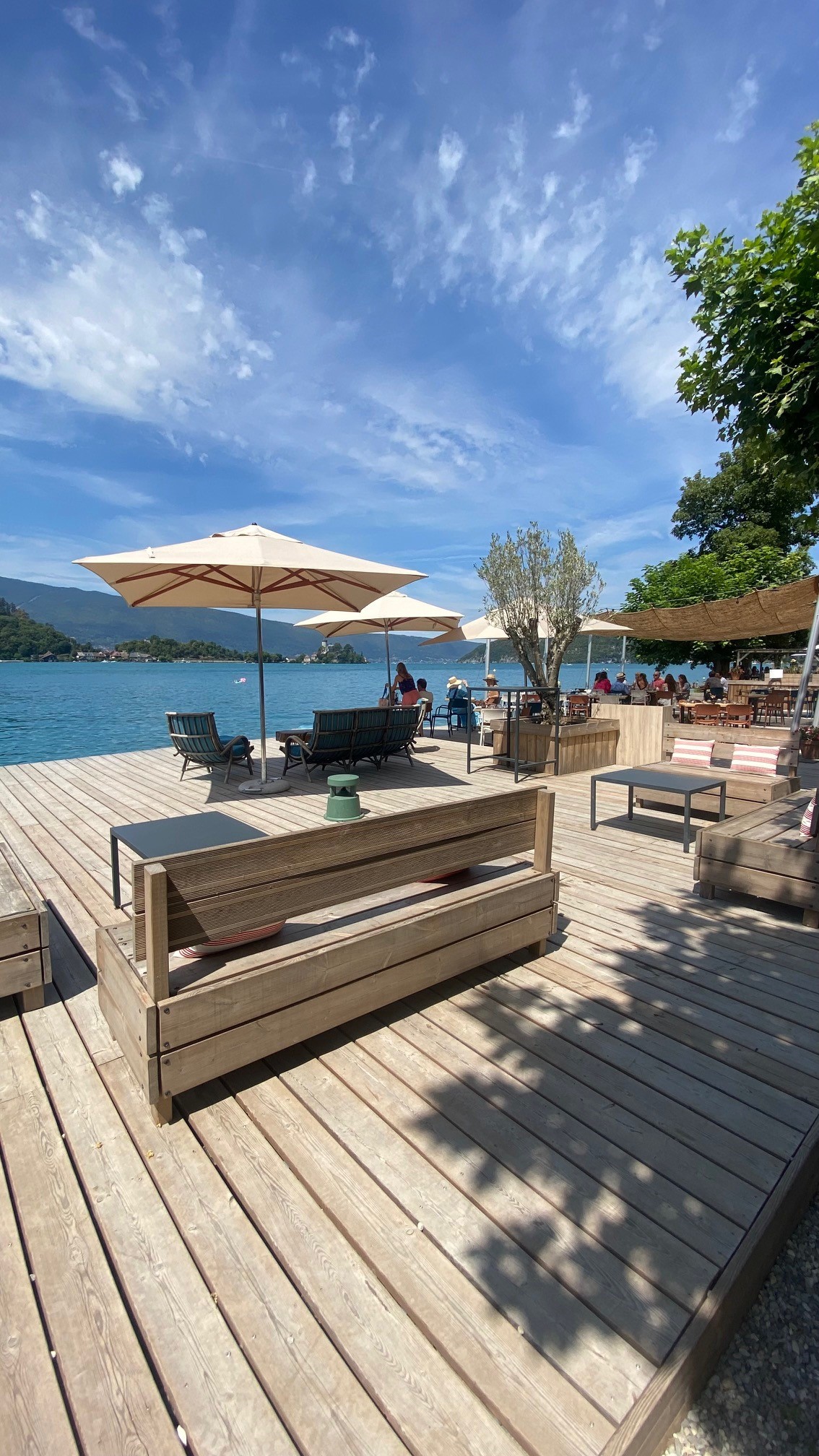 Encore un restaurant de bord de lac « attrape touristes » à notre arrivée 3 serveurs passent devant nous sans même nous saluer pendant plus de 5 minutes. Gros moment de solitude… Service extrêmement lent et non professionnel… Aucune notion de service à table. (les couverts sont posés de travers sans soin au cours du repas)…Sans parler de la tenue vestimentaire du serveur « débardeur avec les poils qui dépassent » un look parfait pour Mykonos ! Cependant son aspect visuel est malaisant ! 66€ par personnes hors boissons bien sûr… Bilan : 3 heures à table pour un menu unique réservé à l’avance. Extrêmement long ! Seul point positif la qualité des plats proposés mais la encore la quantité n’est pas au rendez-vous ! Le cadre est très joli. Mais dans ce cas là, plutôt que de « subir » autant aller côté Guinguette. C’est plus rapide, plus pro, plus sympa et le rapport qualité prix y est plus juste. Je ne recommande vraiment pas le restaurant et c’est bien dommage il manque vraiment une équipe formée au service, impliquée et conviviale pour que ce lieu soit à la hauteur de ce qui est facturé. Bonne chance